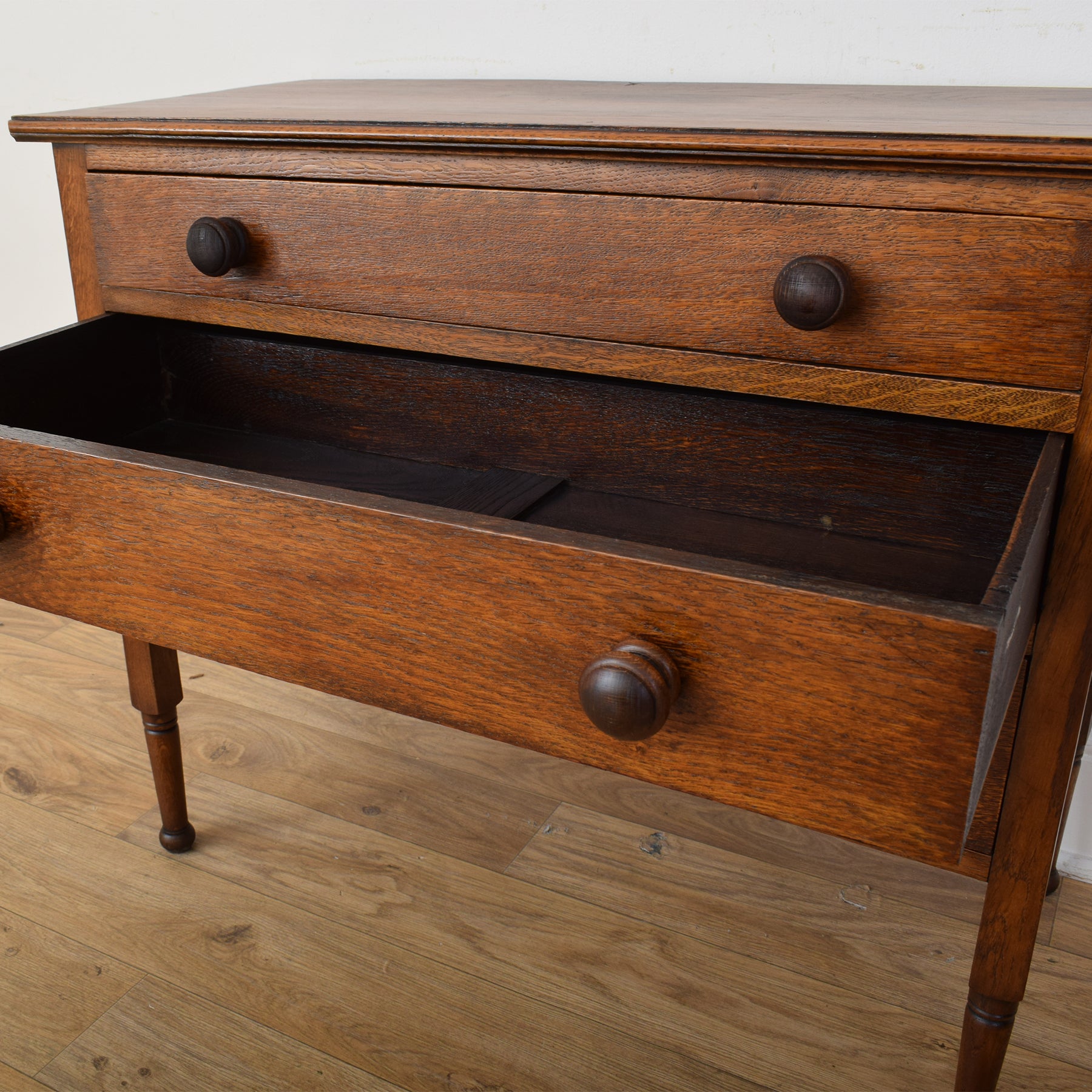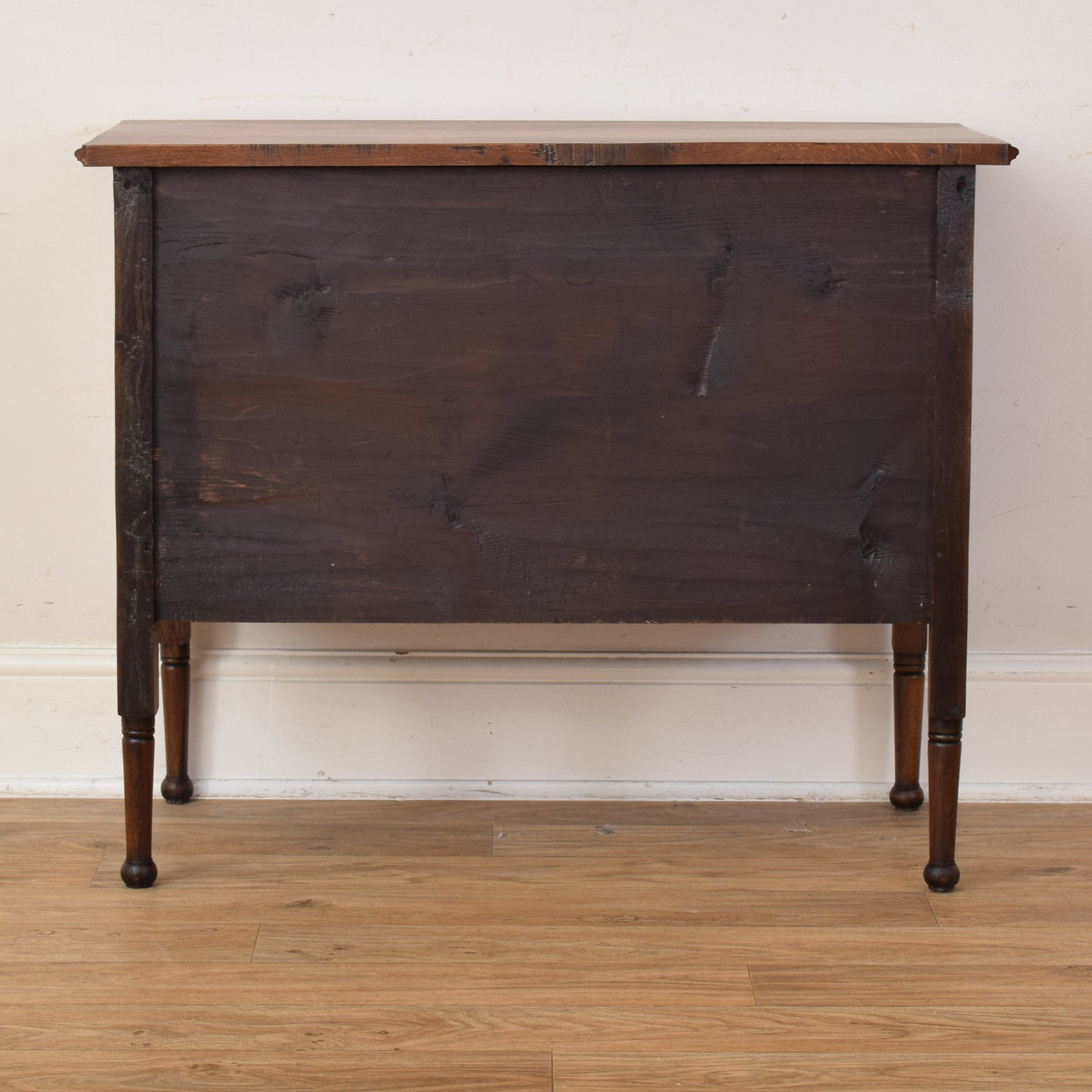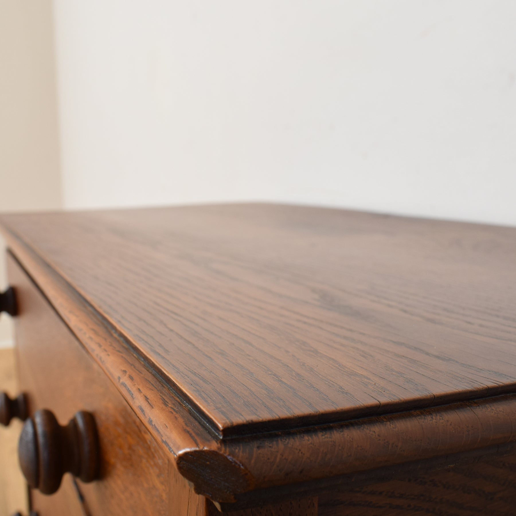 This oak chest of drawers features three spacious drawers, each fitted with classic round wooden knobs that complement the piece’s simple, traditional design. The straight edges and finely turned front legs give it a refined appearance, while the dark finish adds depth and sophistication to the natural oak grain. Its balanced proportions and clean lines make it both functional and visually appealing.