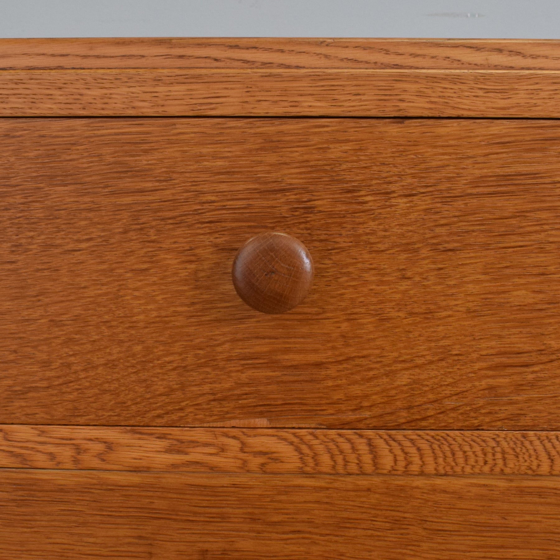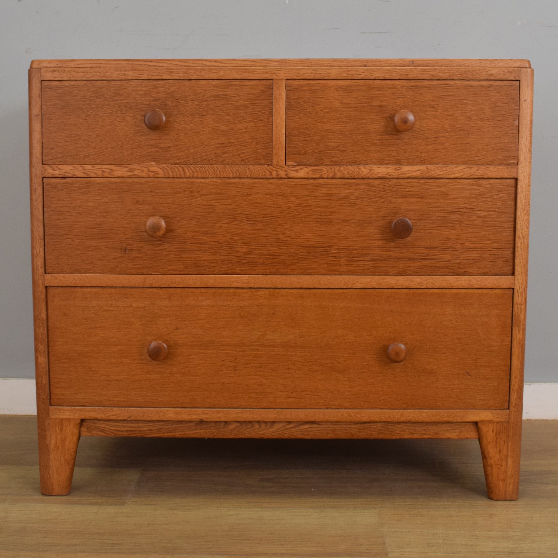 This mid-century piece features a simple and functional layout, with two smaller drawers above two full-width drawers, all finished with matching turned oak knobs. The slightly tapered legs and inset apron provide a light, modern feel, while the warm grain of the oak veneer and solid oak detailing adds depth and character. The minimal styling and proportions make it especially useful where space is limited but storage is still needed.