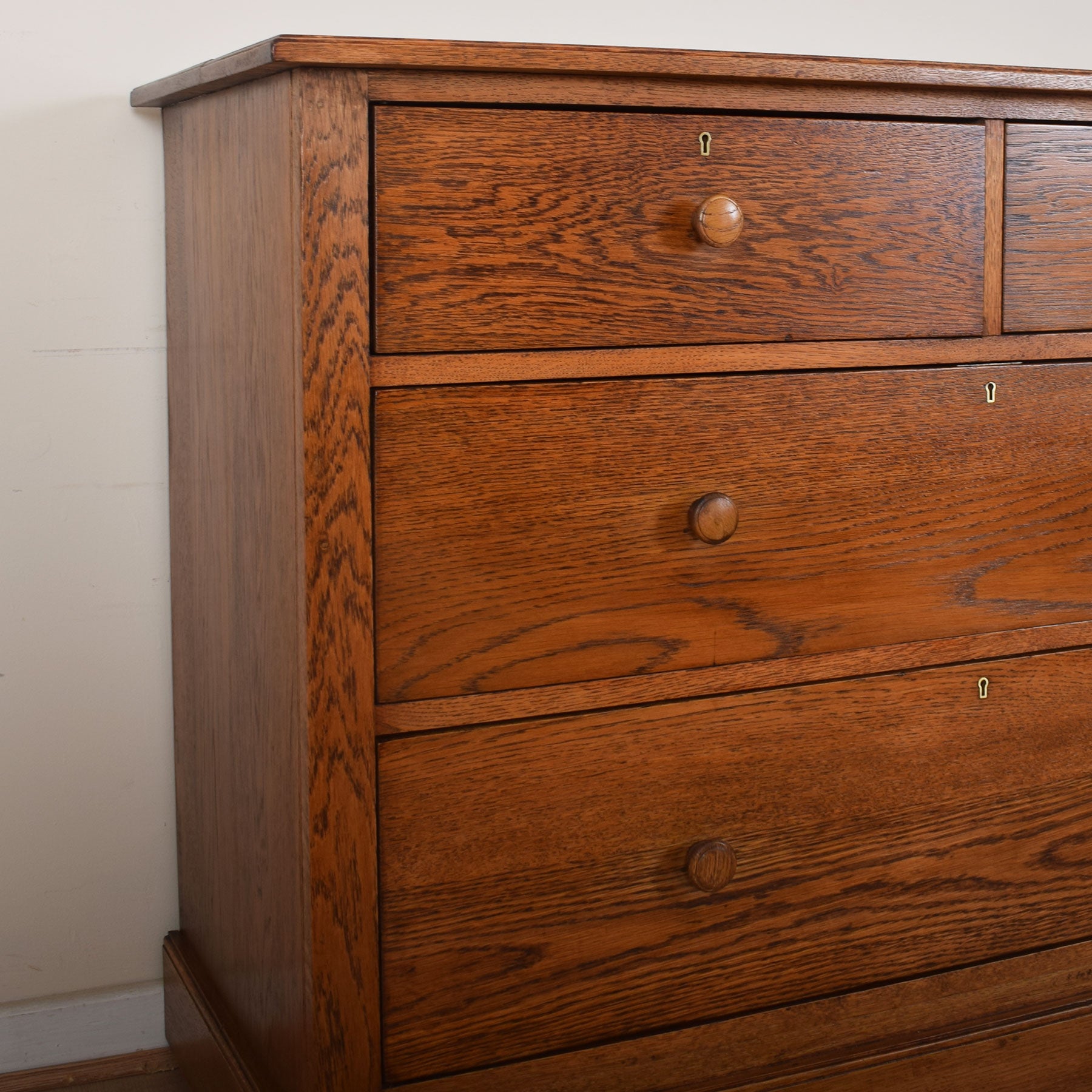 Our restoration workshop has removed the previous varnish from this item, then applied a professional matte lacquer that accentuates the natural beauty of the oak while providing substantial everyday protection. It is important to note that no keys are provided for the drawer locks. The original handles have been replaced with solid oak handles, which significantly enhances the aesthetic appeal of the piece. This item is constructed predominantly from solid oak, featuring a plywood back and drawer bases. The back and bottom of the chest of drawers have been painted. The chest of drawers is equipped with wheels, making it considerably easier to relocate to various areas within your home.
