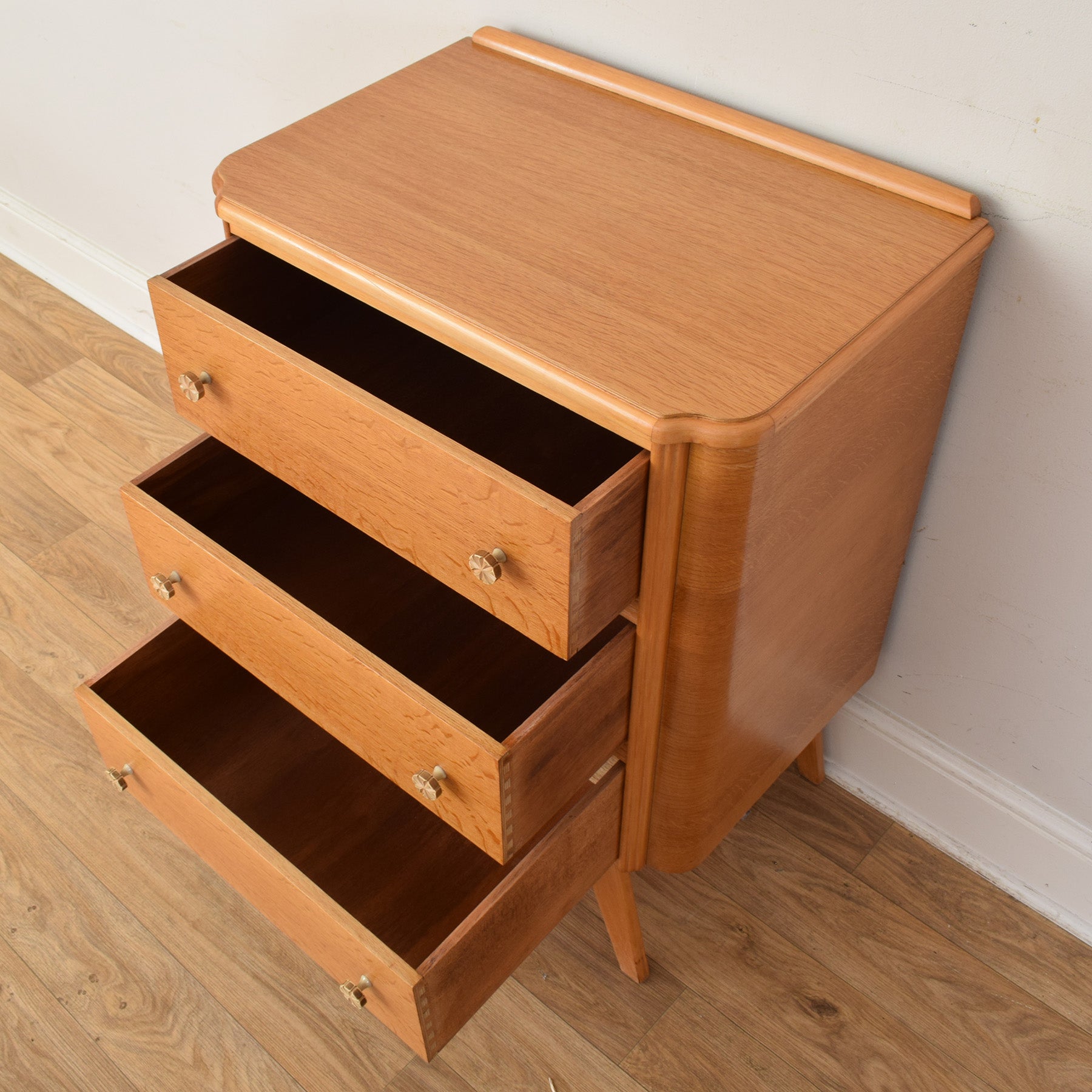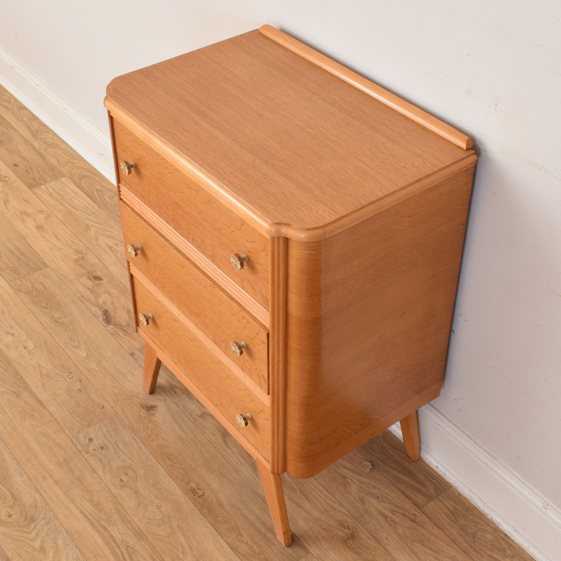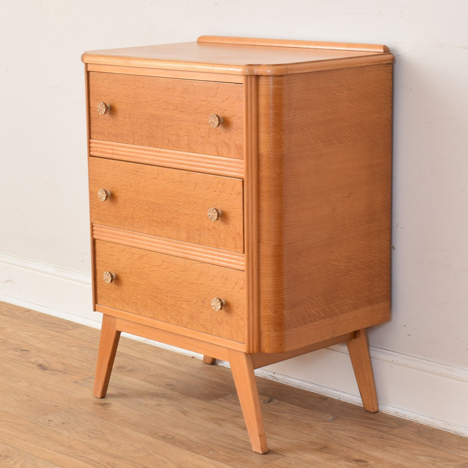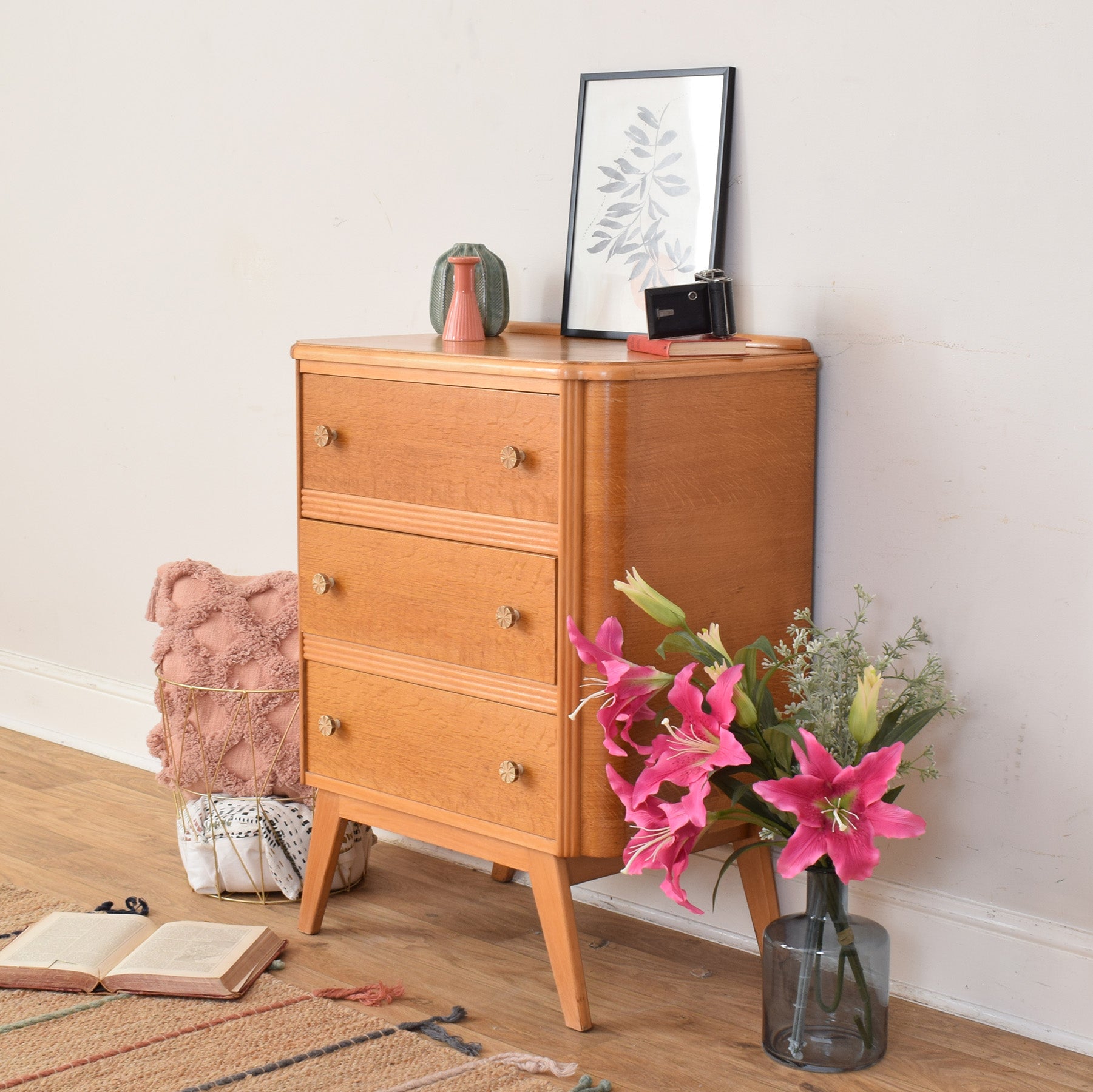 This oak chest of drawers features a compact, well-balanced design with three spacious drawers, ideal for storing clothing or everyday essentials. The gently rounded front edges soften its overall look, while the simple round wooden knobs complement the clean lines. Raised on angled legs, the chest has a subtle mid-century feel that gives it a light and airy presence. The natural grain of the oak veneer runs consistently across the drawer fronts, adding texture and visual interest.