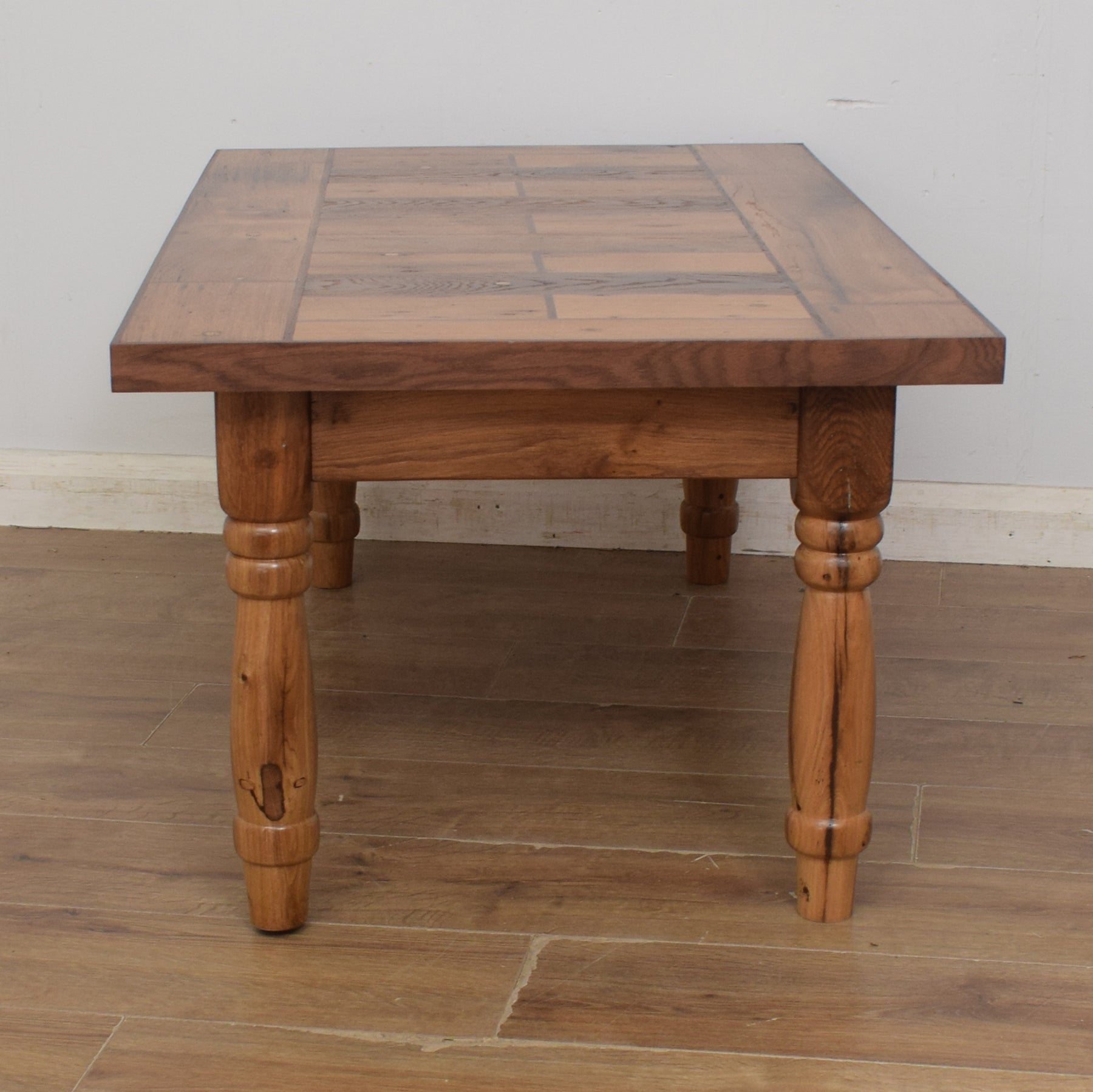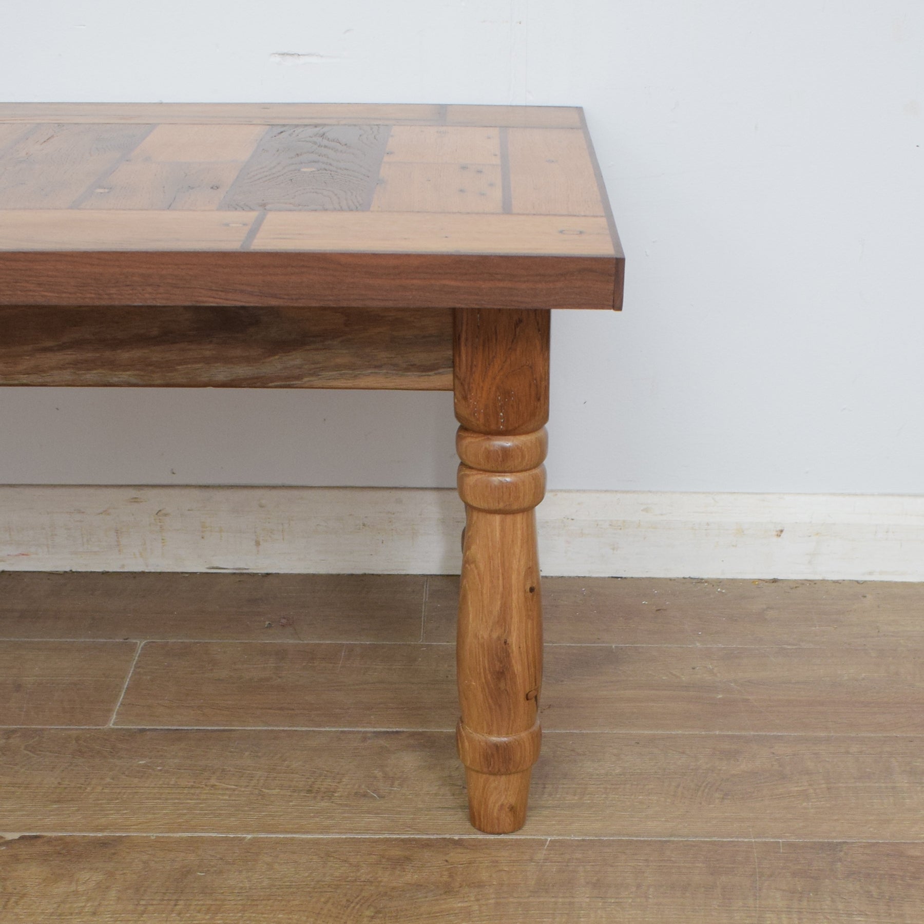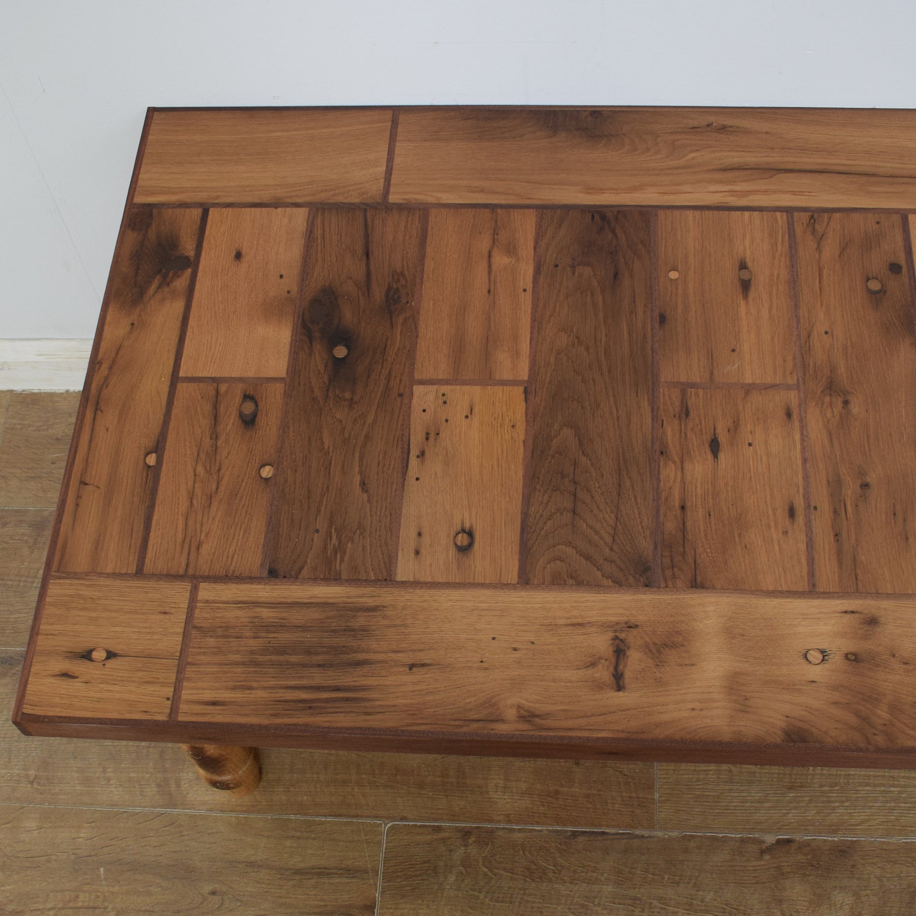 The legs were hand-made on a lathe and provide an attractive feature and a stable base to this coffee table. Right across this piece are details which reflect the fact that this wood was once part of a workbench. There are dowels and other visible features which have been smoothed over and give this table lots of industrial character.