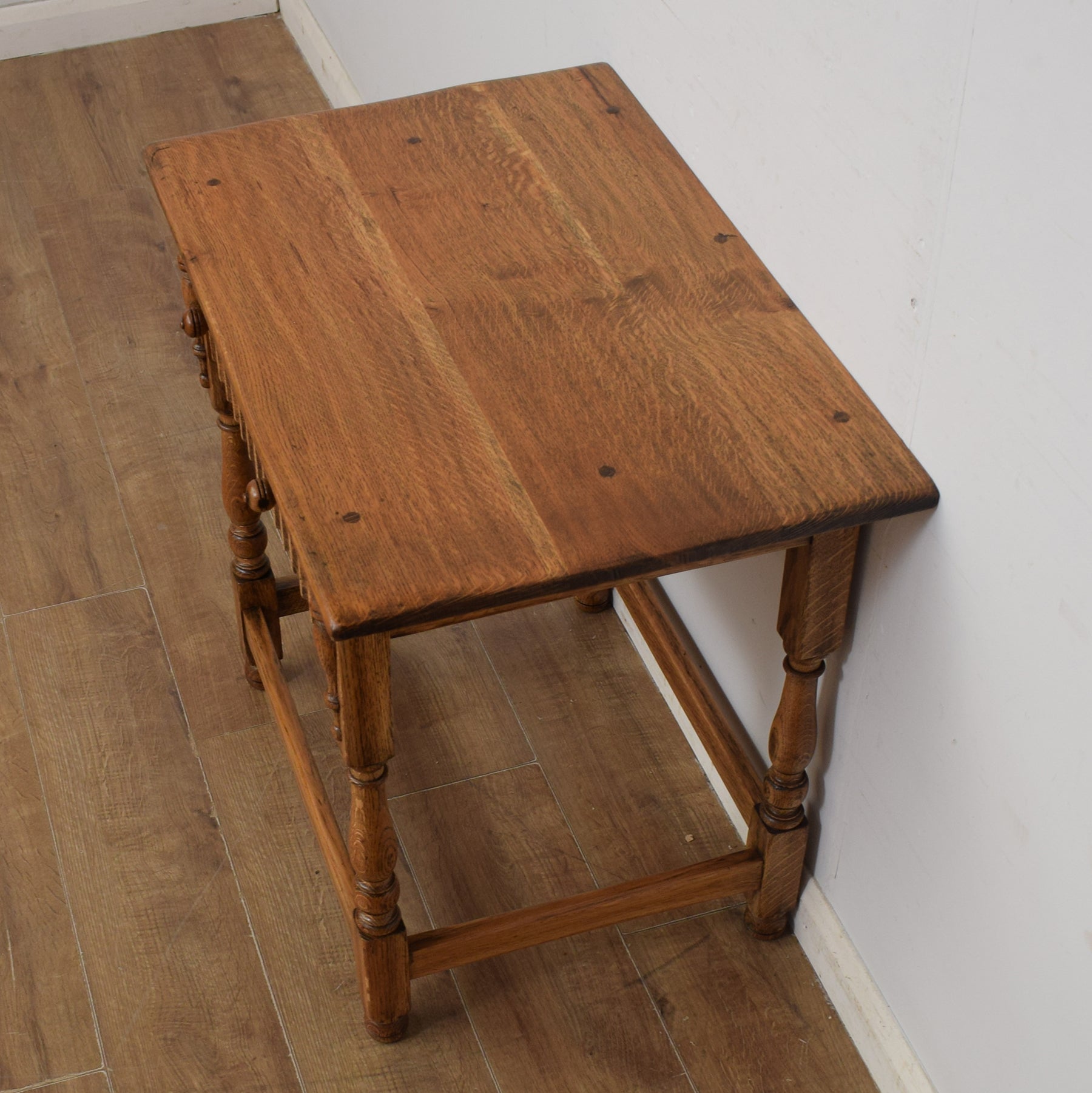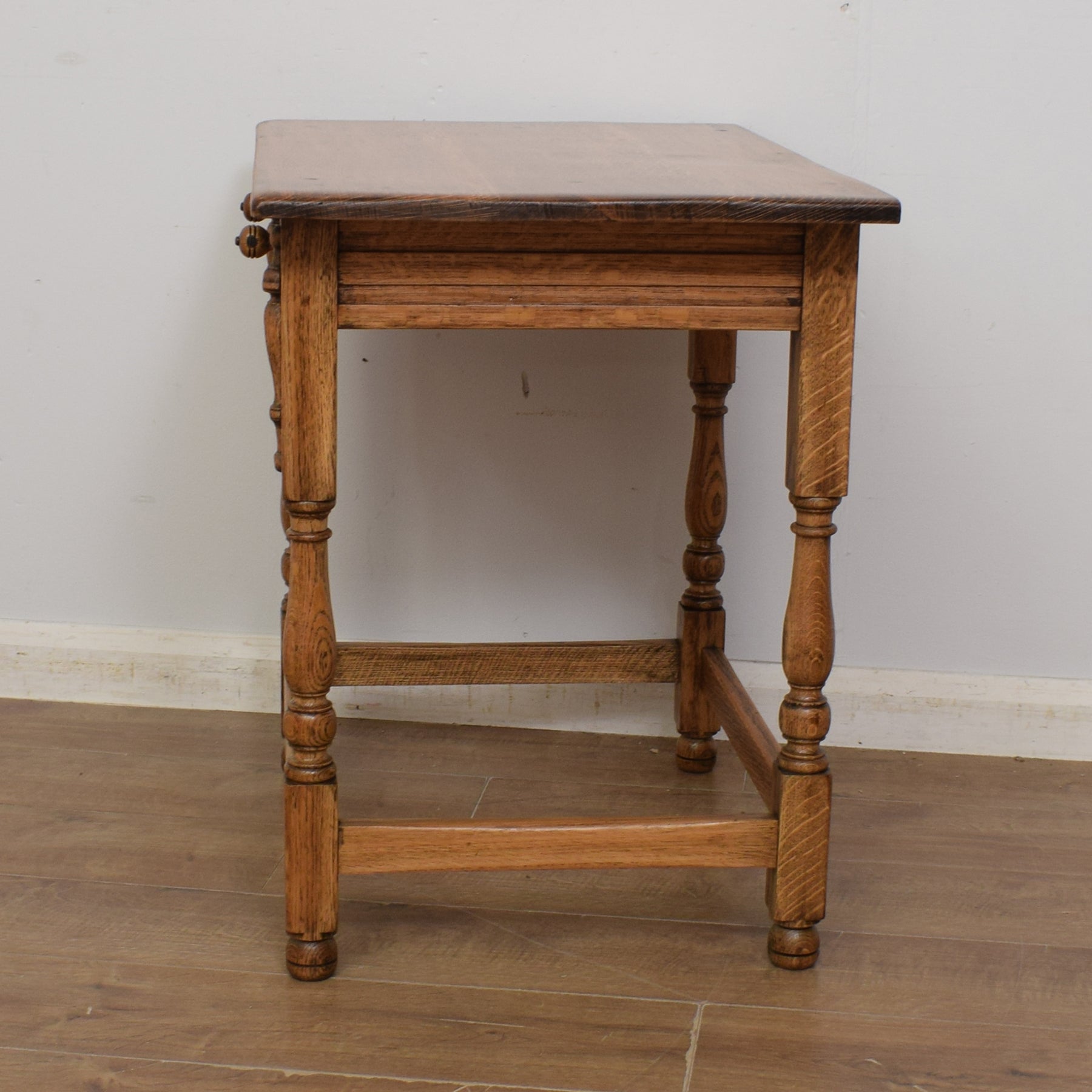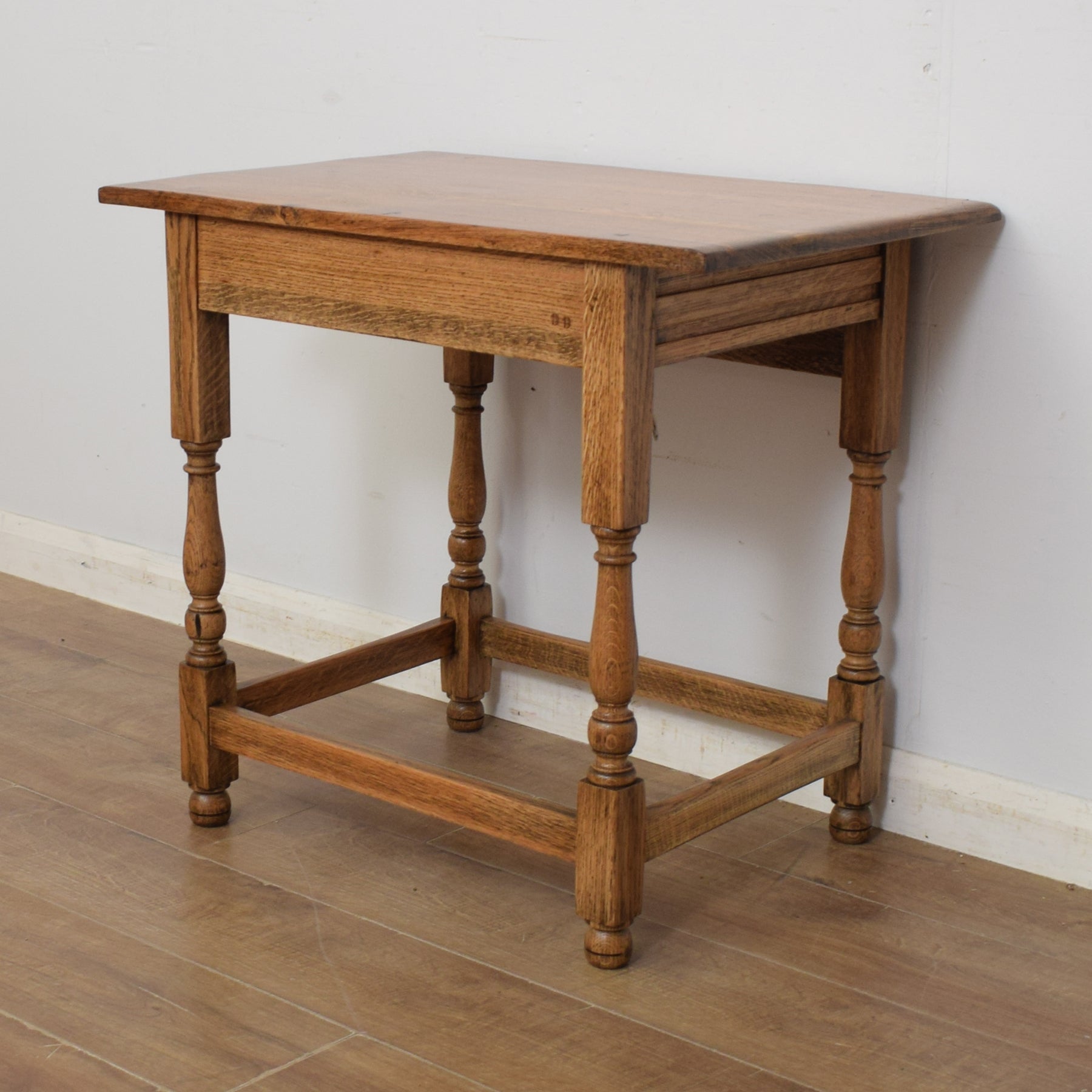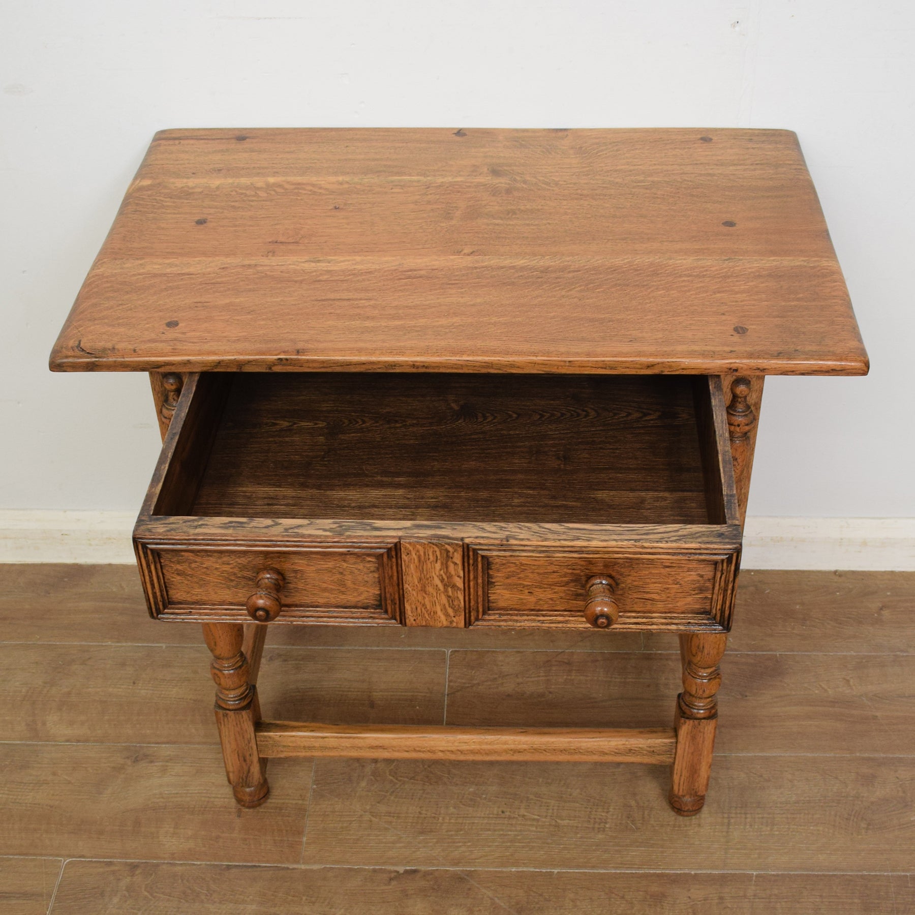 There is a single, full-width drawer offering some convenient storage for those small essentials, such as keys, phone chargers and pens. There is a good amount of space on the oak top for a vase of freshly picked flowers and a selection of favourite ornaments. There are attractive details on either side of the drawer, and the turned legs and support stretchers give this table a sturdy, robust feel. This is a vintage piece which has a few marks and imperfections that can be seen in the attached photos.