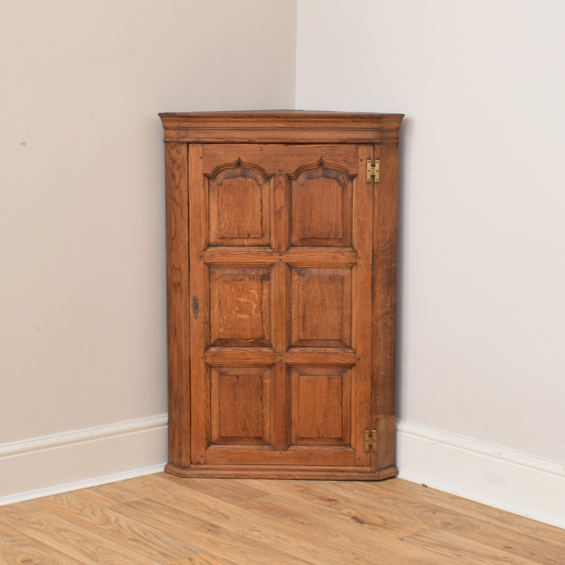 The cabinet features a warm oak tone with a simple, well-proportioned design. Inside, shaped corner shelves offer space for books, ceramics, or everyday items, while the single door keeps contents neatly hidden when closed. The panelled door and moulded top add subtle character without feeling heavy, allowing the natural oak to remain the main focus.
