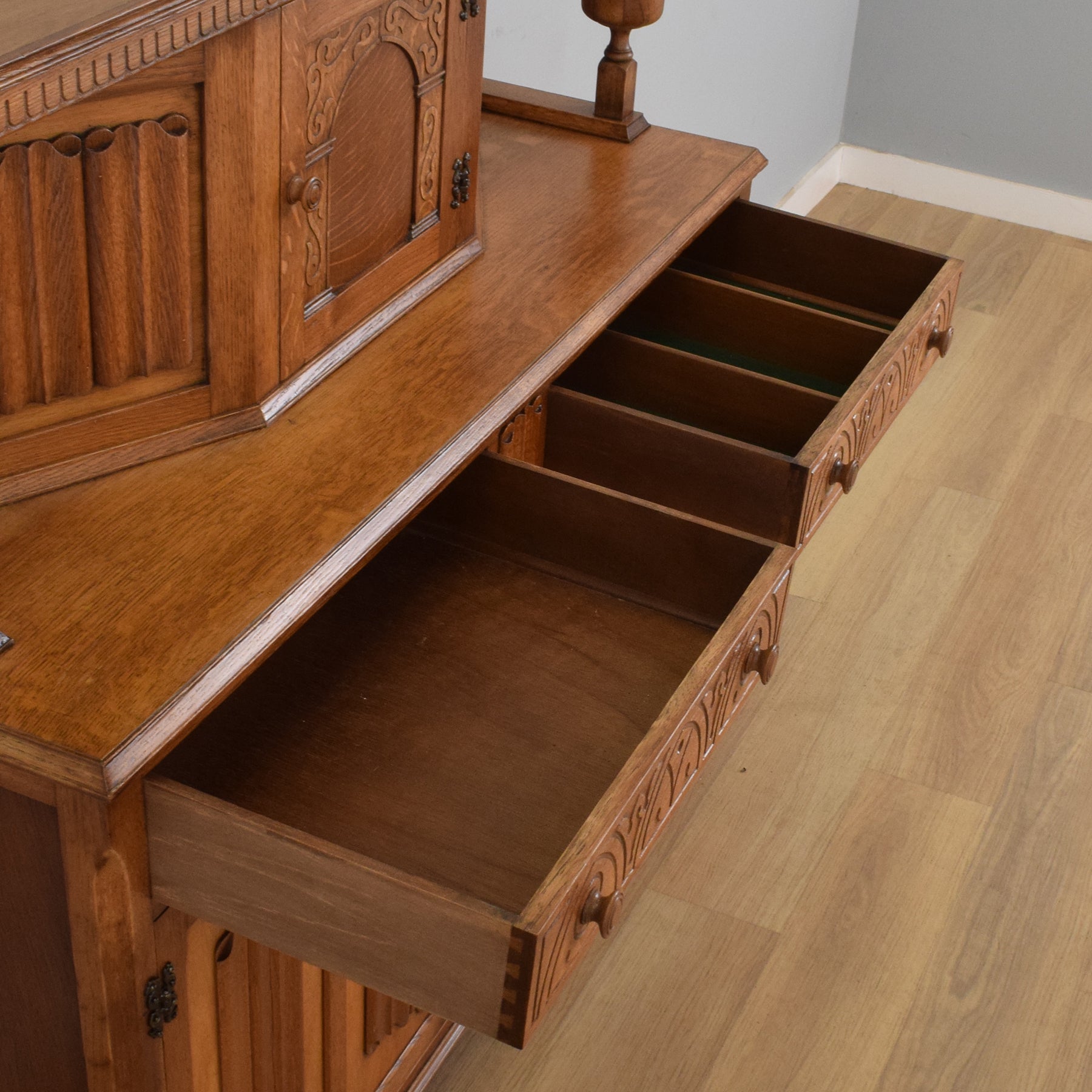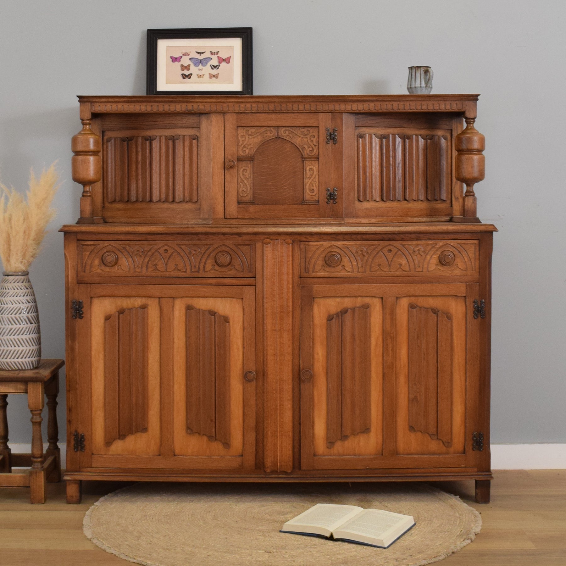 This oak court cabinet exudes grandeur and traditional craftsmanship, making it a striking feature for a dining room, living space, or hallway. Its intricate detailing and practical design combine beautifully, offering both visual appeal and functional storage.