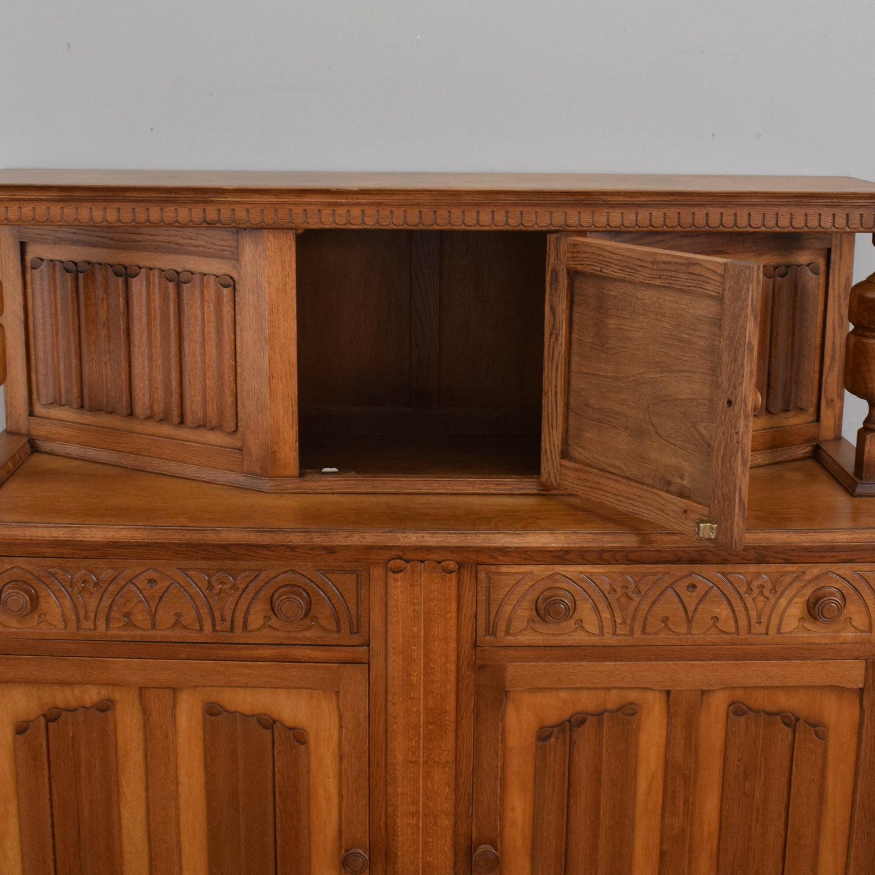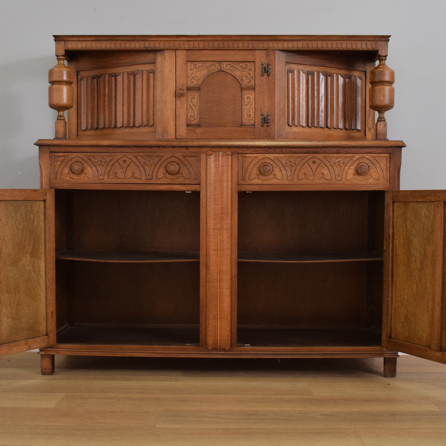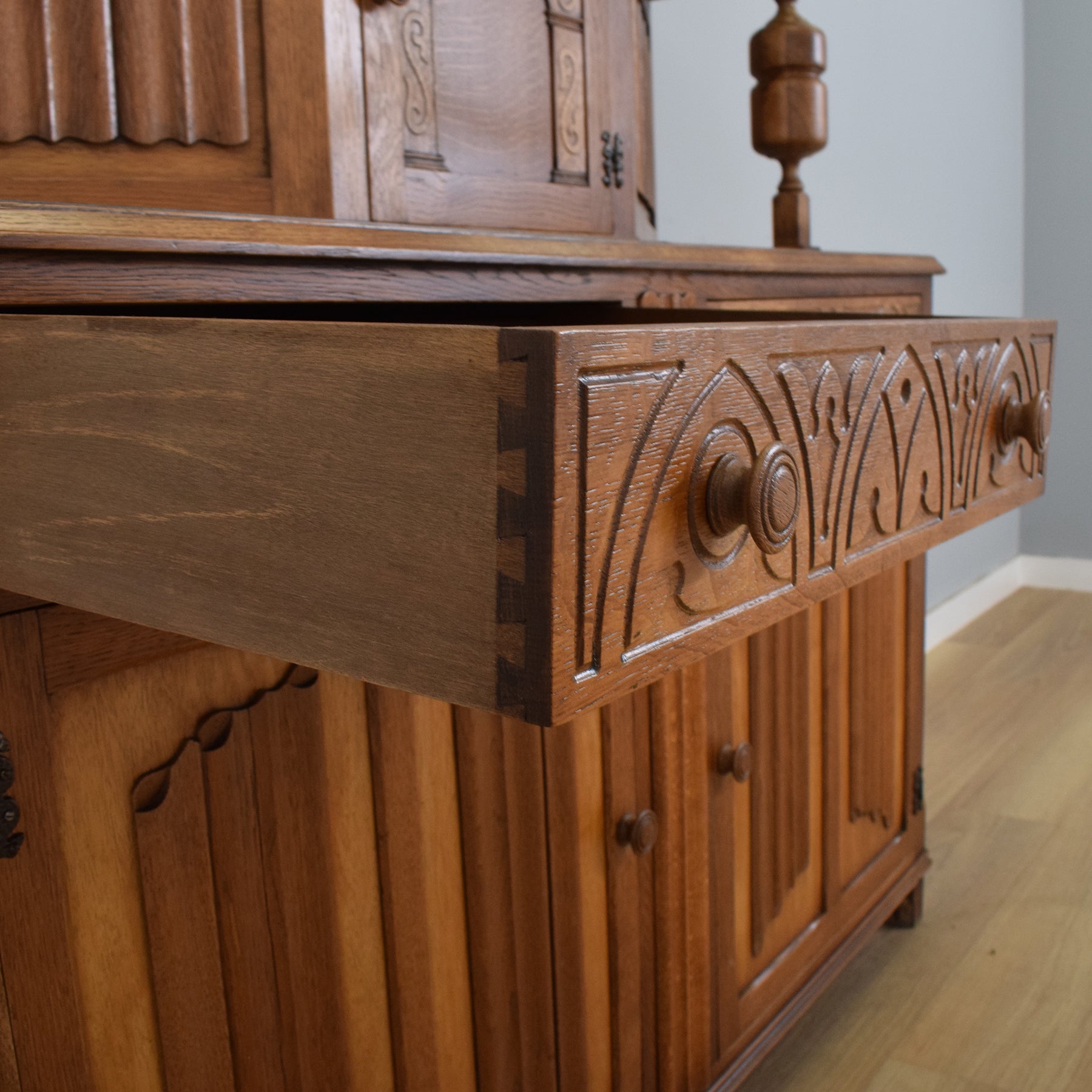 The cabinet is constructed from a mix of solid oak and oak veneer, with a plywood back and drawer bases for added strength and durability. The upper section features decorative turned columns and ornate carved panels, framing a central cupboard flanked by two detailed side compartments. Below, the main cabinet showcases arched carvings and molded panel doors that open to reveal spacious interior shelving. Subtle metal hinges and rounded knobs complement the piece, blending function with elegant design.