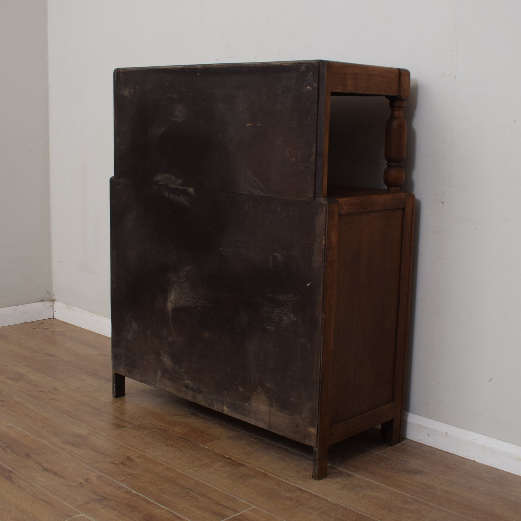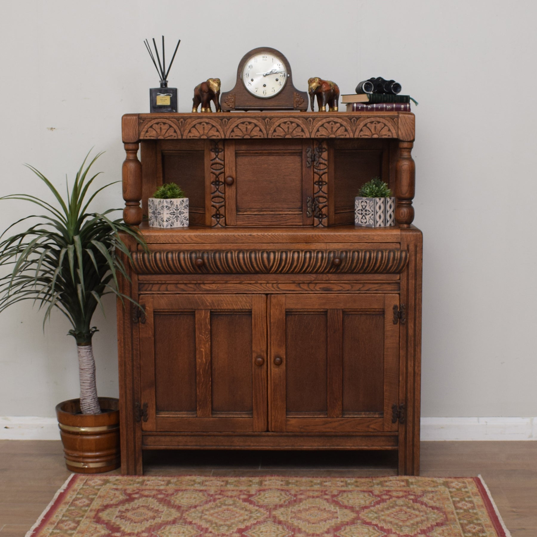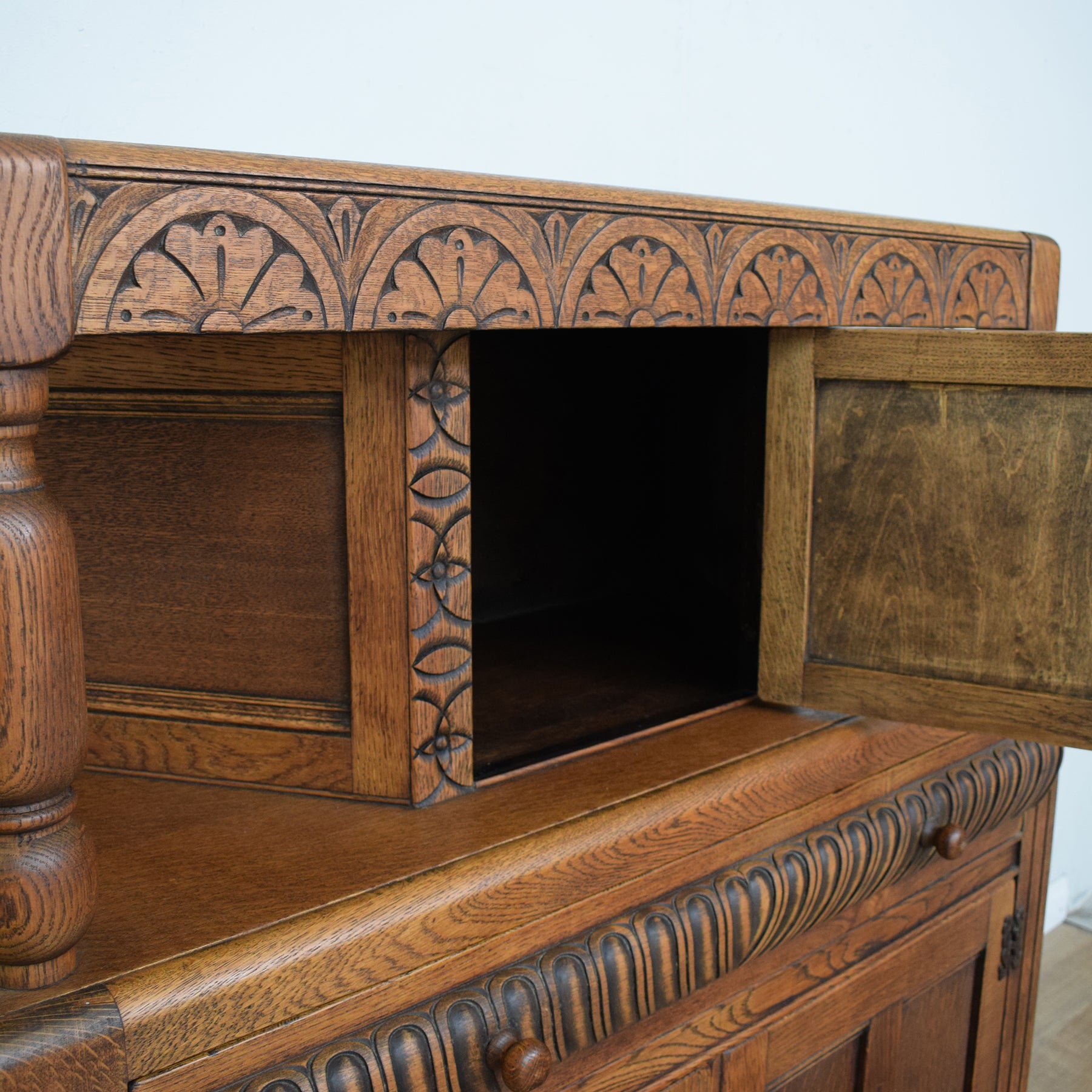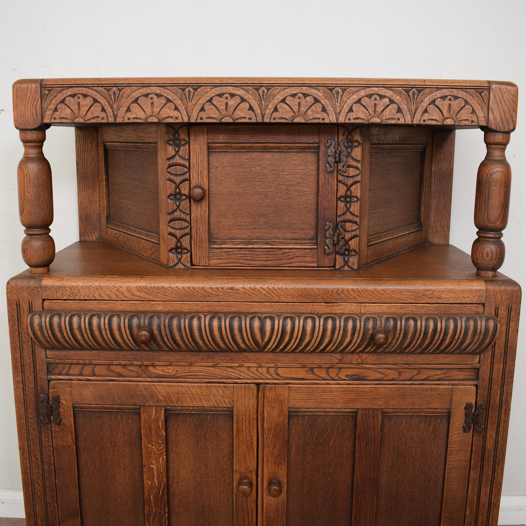 The lower section of this lovely cabinet consists of a large shelved cupboard which is ideal for storing away plates, crockery, and a wide variety of other items. Above the cupboard is a beautifully carved, full-width drawer. The top section, traditionally used for storing drinks, provides some useful extra storage with its single door cupboard. The attractive carvings, ornate hinges and beautiful oak grain all contribute to the visual appeal of this piece.