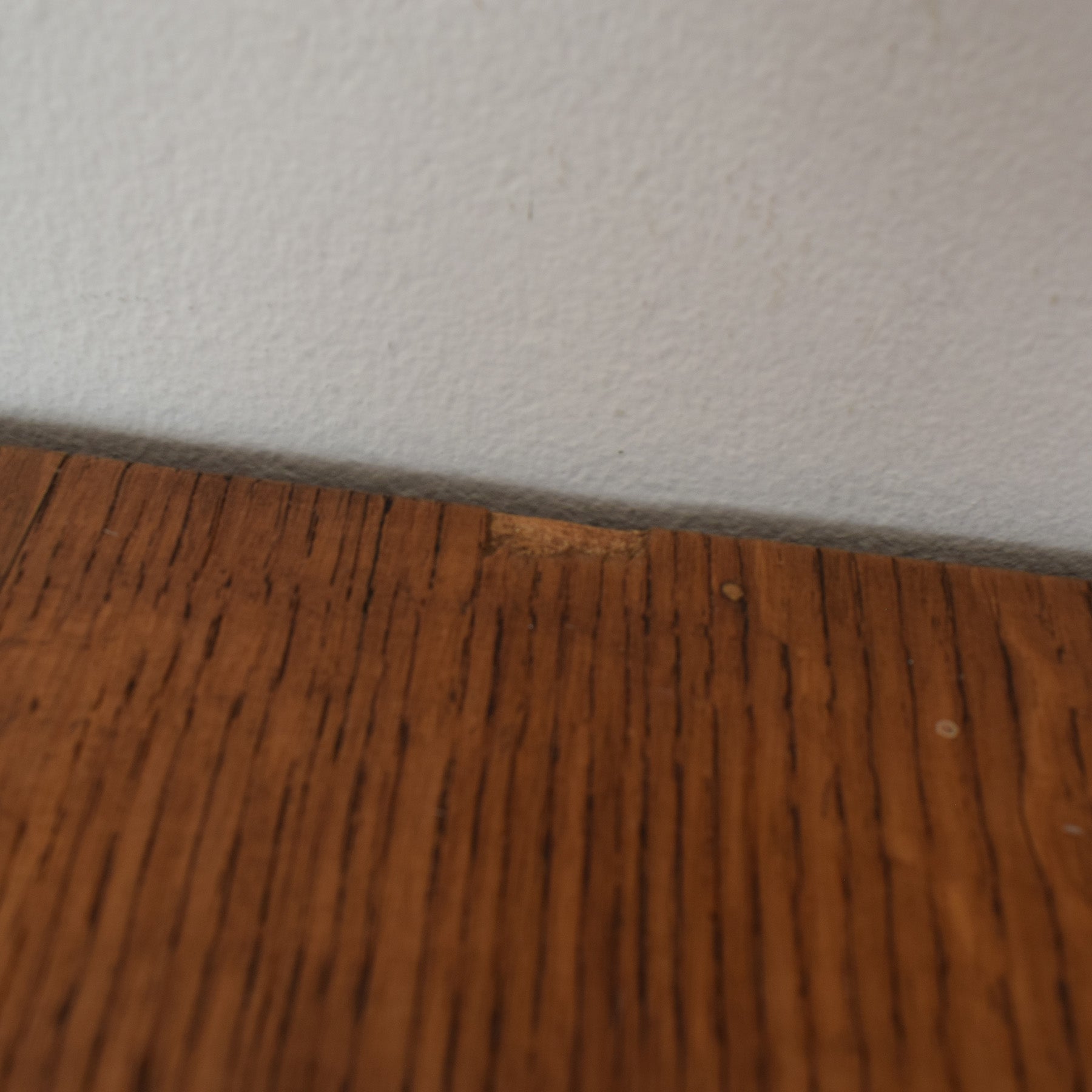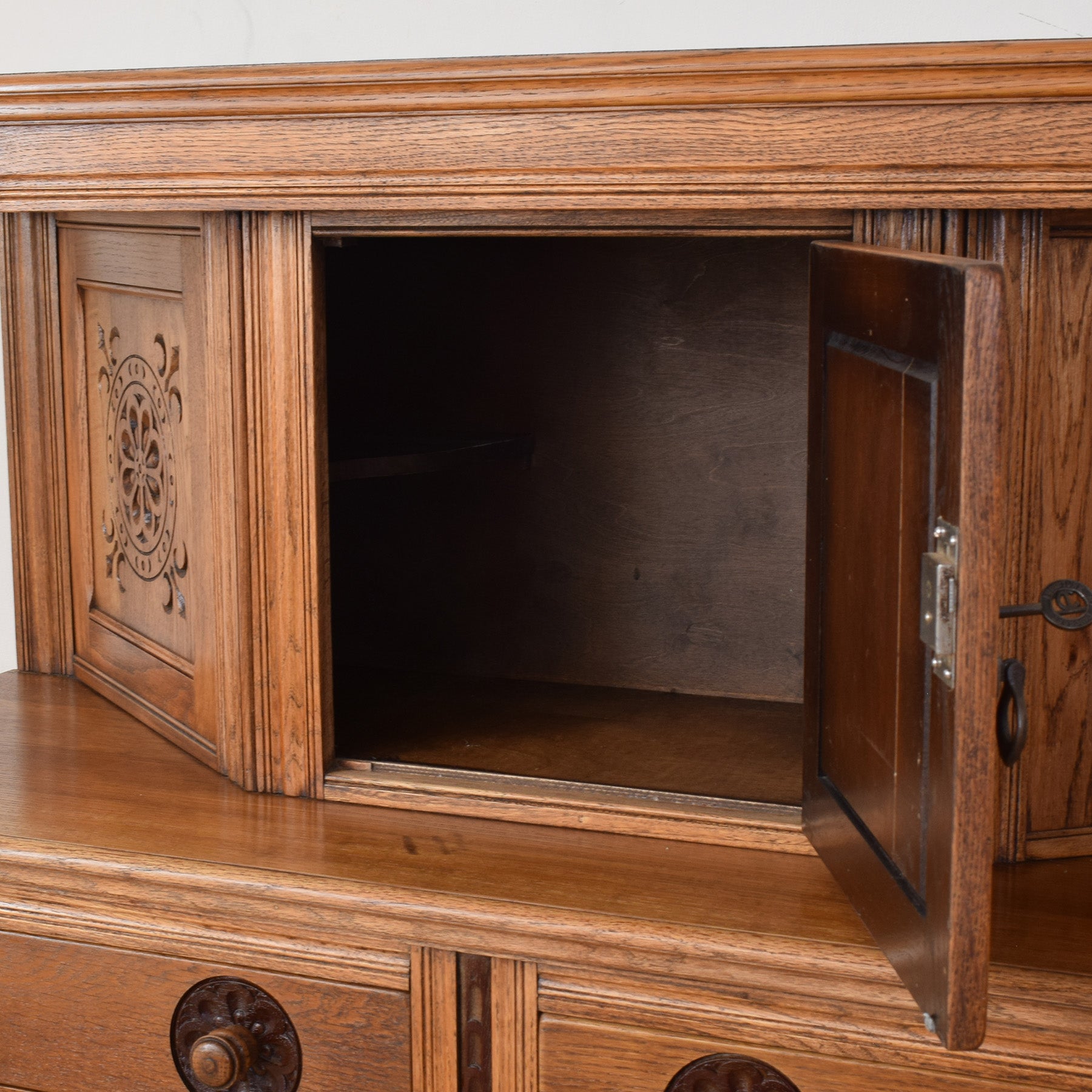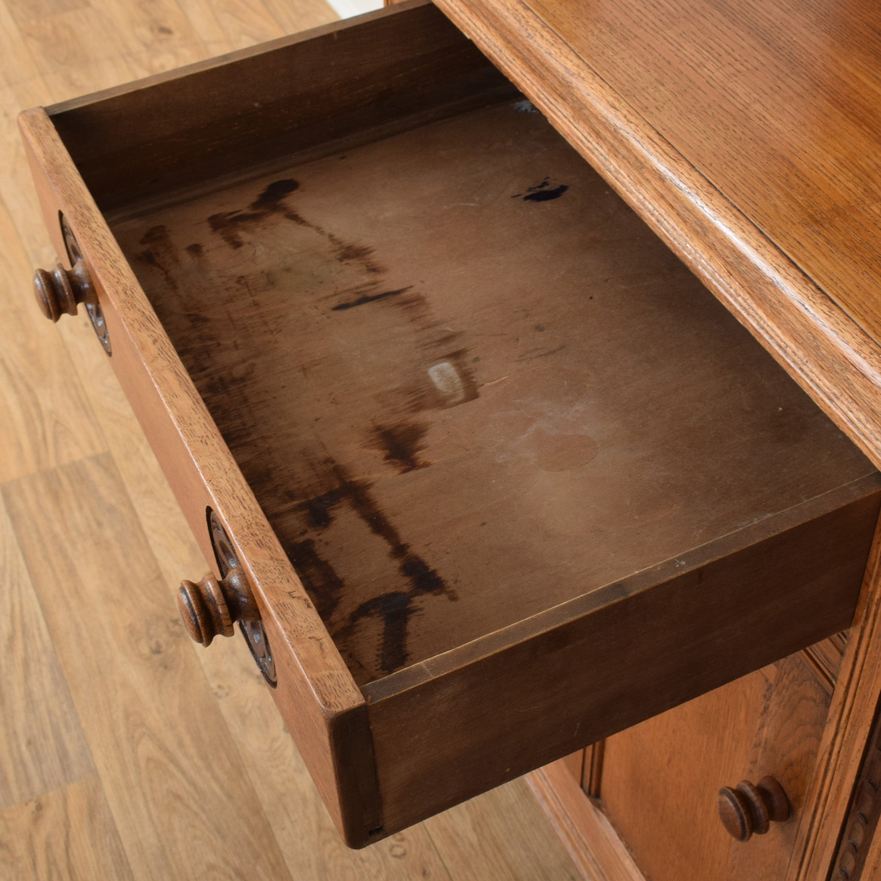 The previous darker finish has been stripped back, and the cabinet has been carefully prepared before multiple coats of hard-wearing matte lacquer were applied. This provides a durable, long-lasting finish while allowing the natural oak grain to remain visible. There is a small chip to the veneer on the top surface, a dark mark in front of the upper cupboard door, a split down this door, and dark marks in one of the drawers all of which are visible in the photographs and reflected in the overall character of the piece. This item is made from a mixture of solid oak and oak veneer. The rear panel and drawer bases are made from plywood.