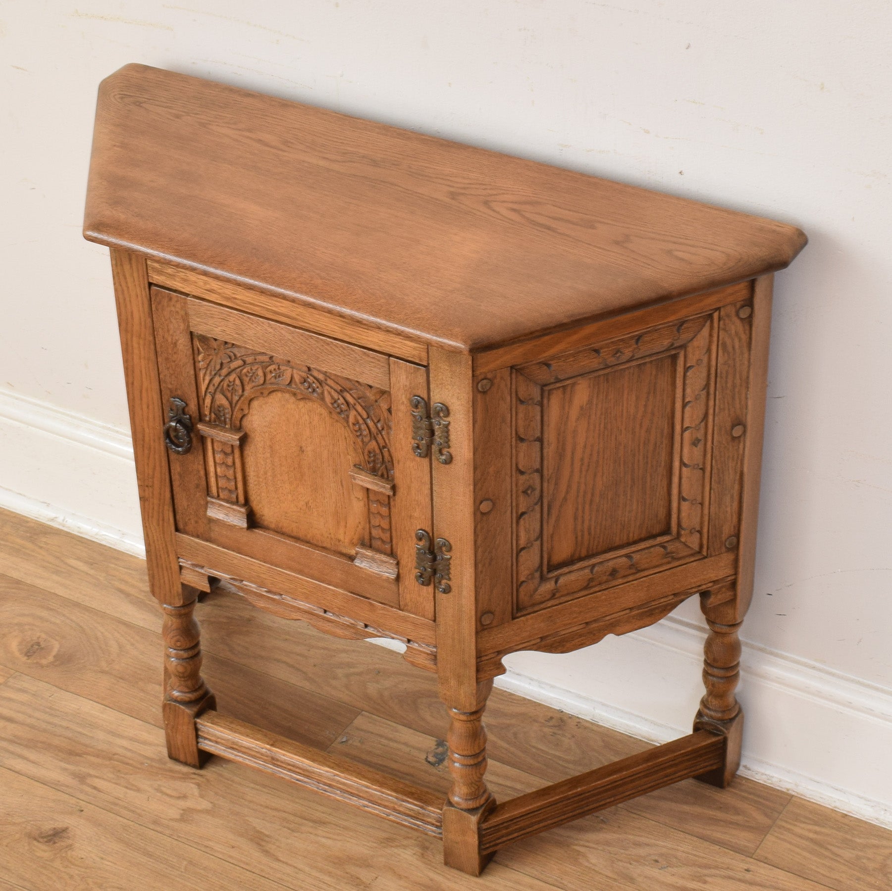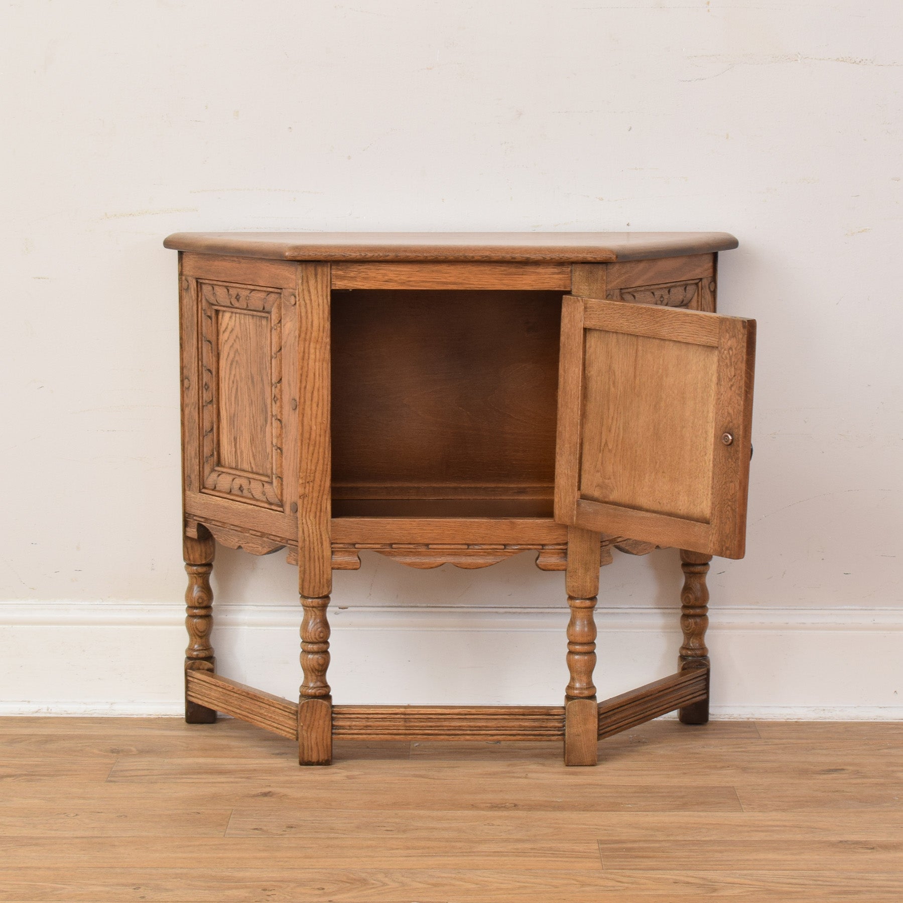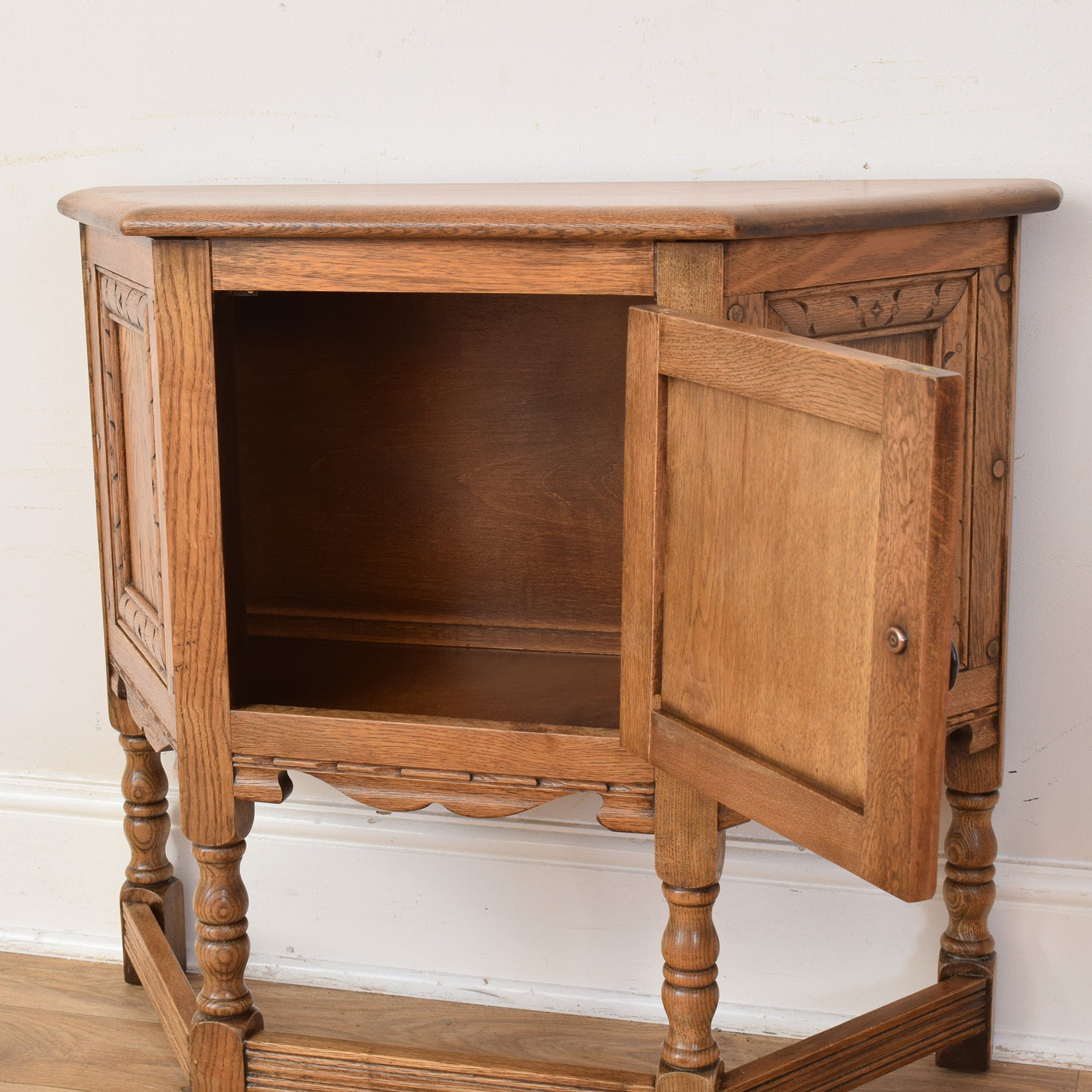 The cabinet features a shaped top, turned legs, and a single door with decorative carved panel detailing that draws the eye. The rich oak grain is clearly visible throughout, complemented by simple metal hinges and handle that suit the traditional style. Inside, the cupboard offers convenient storage for everyday items, making it both attractive and functional.