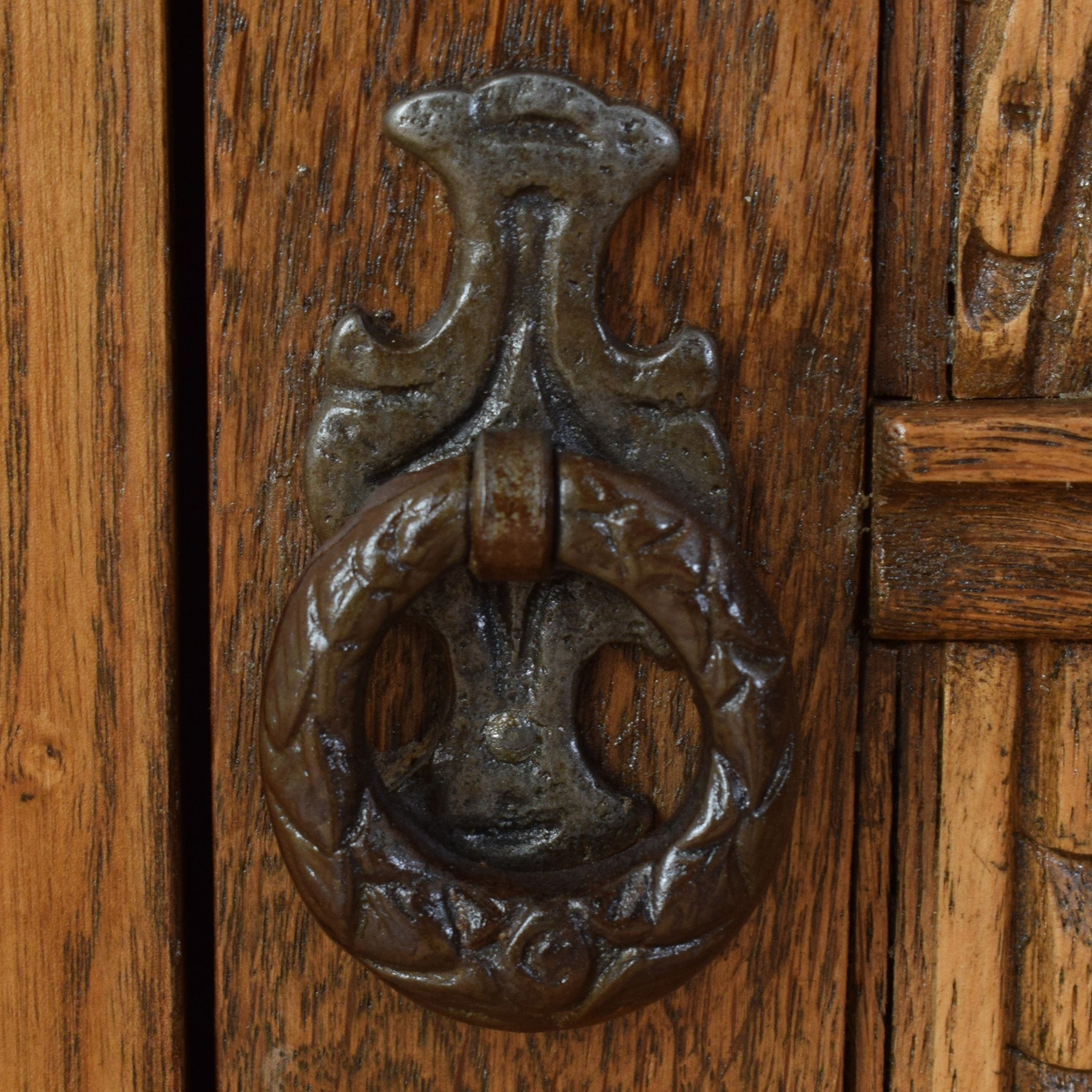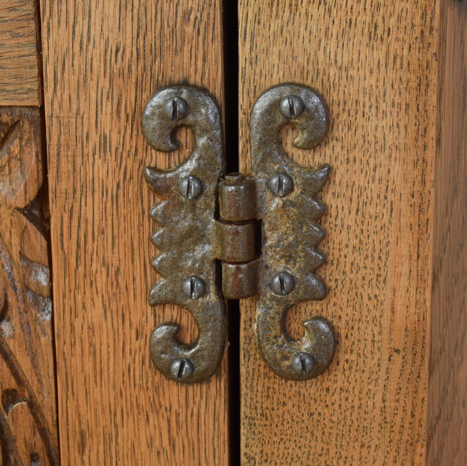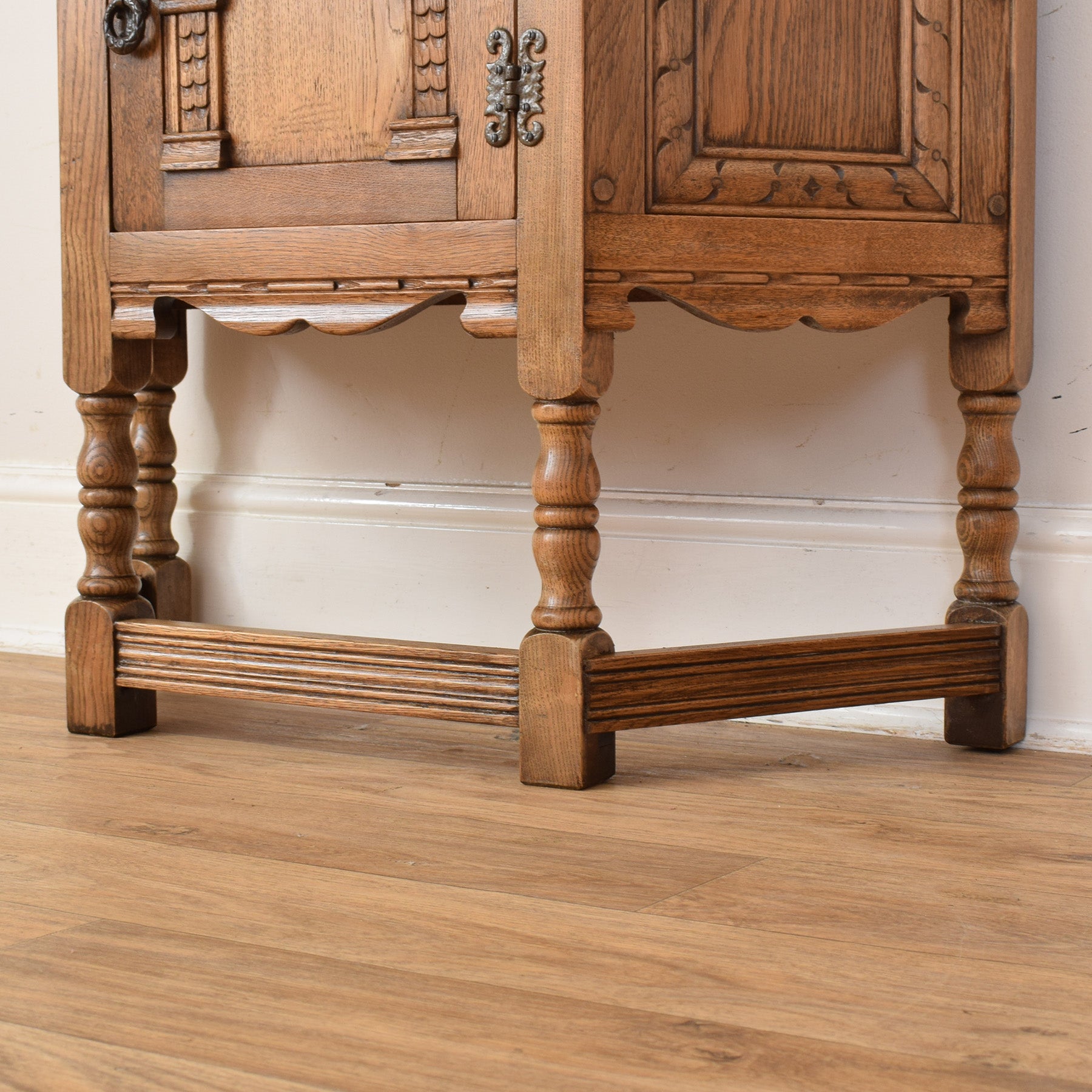 The cabinet features a shaped top, turned legs, and a single door with decorative carved panel detailing that draws the eye. The rich oak grain is clearly visible throughout, complemented by simple metal hinges and handle that suit the traditional style. Inside, the cupboard offers convenient storage for everyday items, making it both attractive and functional.