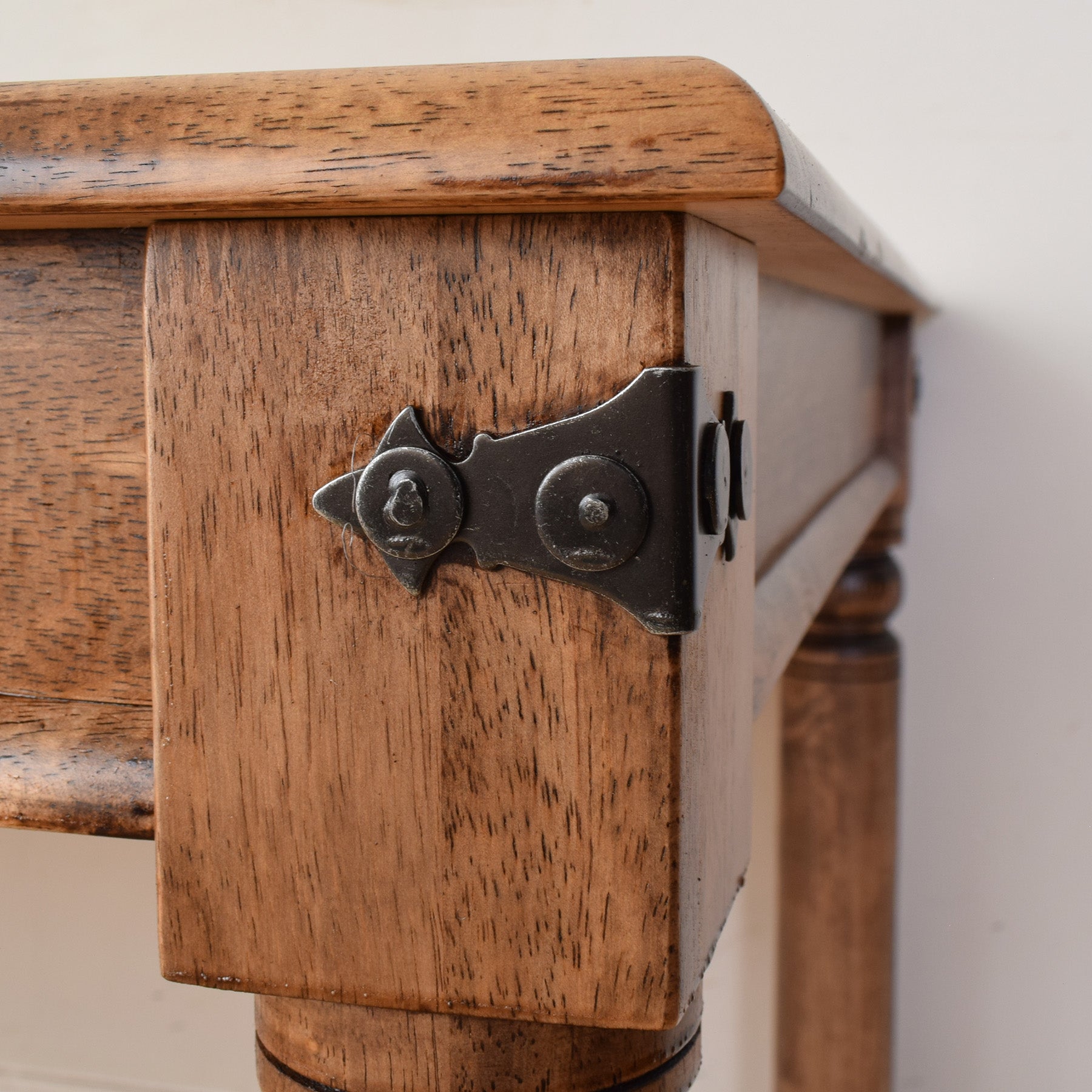 The previous darker finish has been stripped back, and multiple coats of hard-wearing matte lacquer have been applied. This provides a durable, long-lasting finish while enhancing the natural grain and tone of the wood. The table is made entirely from solid oak.