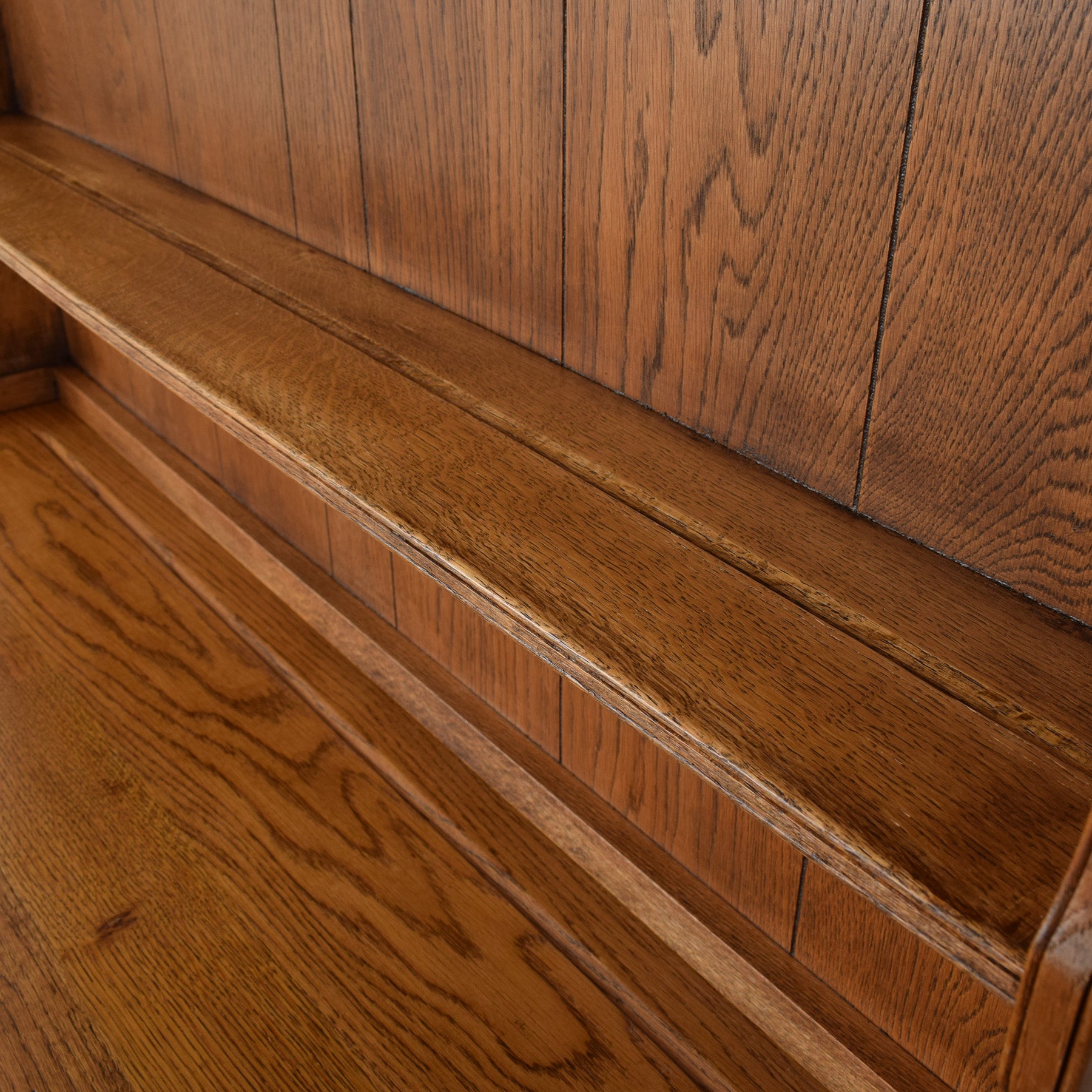 The upper section features two open shelves framed by gently shaped supports and a decorative scalloped edge beneath the cornice, giving the piece a traditional country feel. The lower section includes two drawers with carved detailing and turned wooden knobs, set above a pair of cupboard doors with raised and carved panels. The carved motifs and vertical detailing along the sides add depth and interest, while the warm oak tones highlight the natural grain throughout. The generous surface area between the top and base provides additional space for serving dishes or decorative pieces.