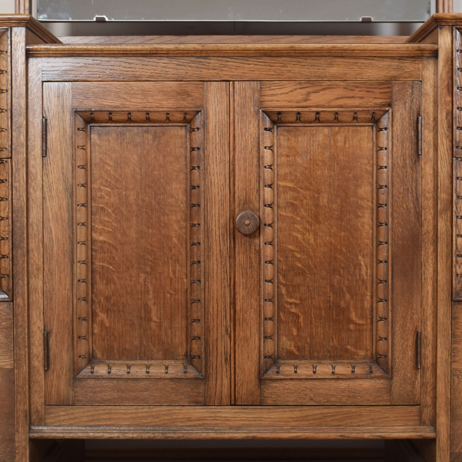 The split-level top surface has a generous amount of space for treasured ornaments and dressing table essentials. On each side there are three progressively deeper drawers, while the centre features a double-door cupboard with a single shelf offering ample storage. The fitted mirror tilts to provide a clear relfection whether you are seated or standing. Made largely of oak, this dressing table has some oak-veneered panels and plywood internal sections.