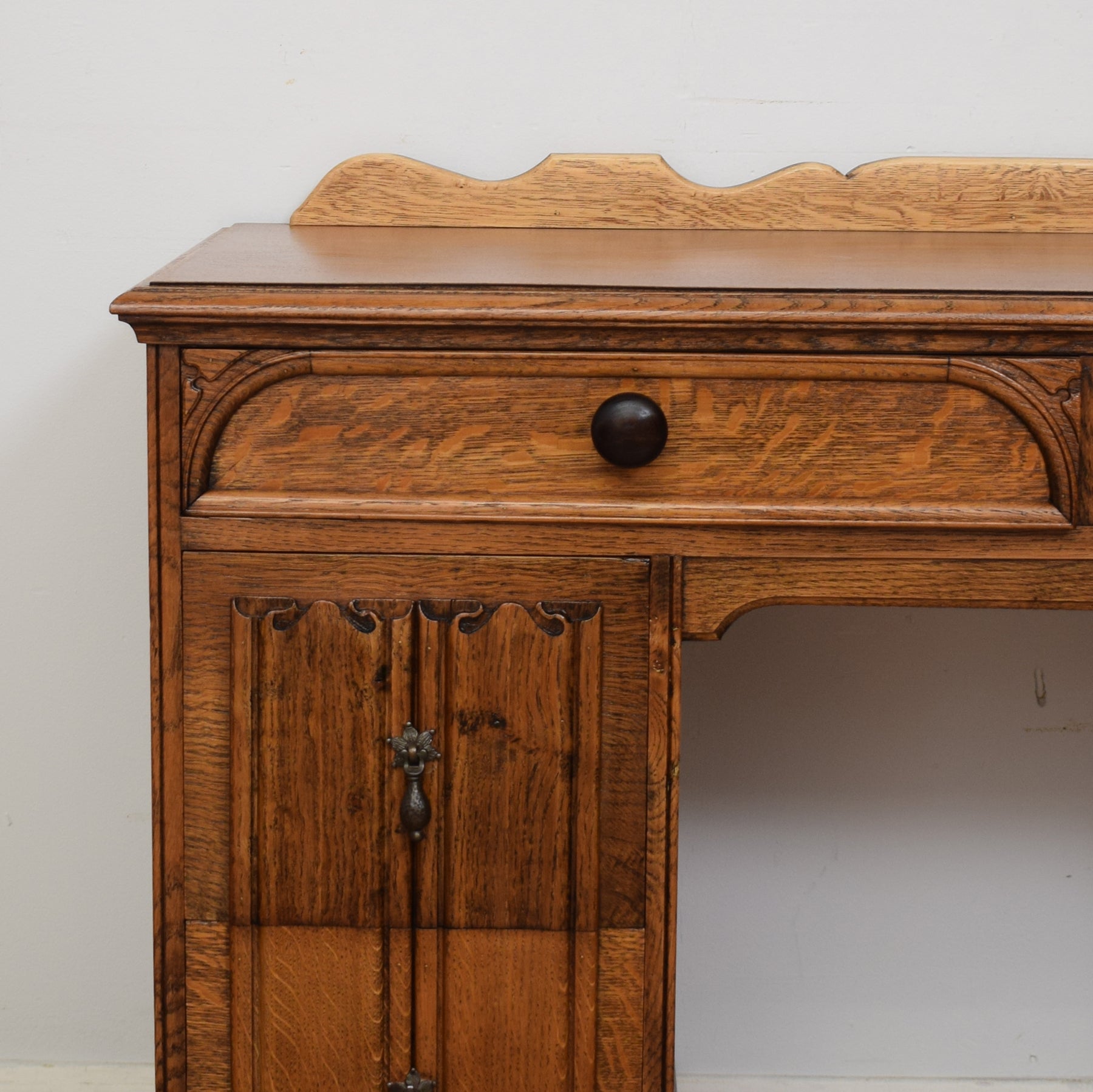 This charming oak dressing table would make a lovely bedroom addition, with its beautiful carvings and natural oak tones. Most likely made by 'Old Charm', this dressing table can easily lend itself as a petite desk.