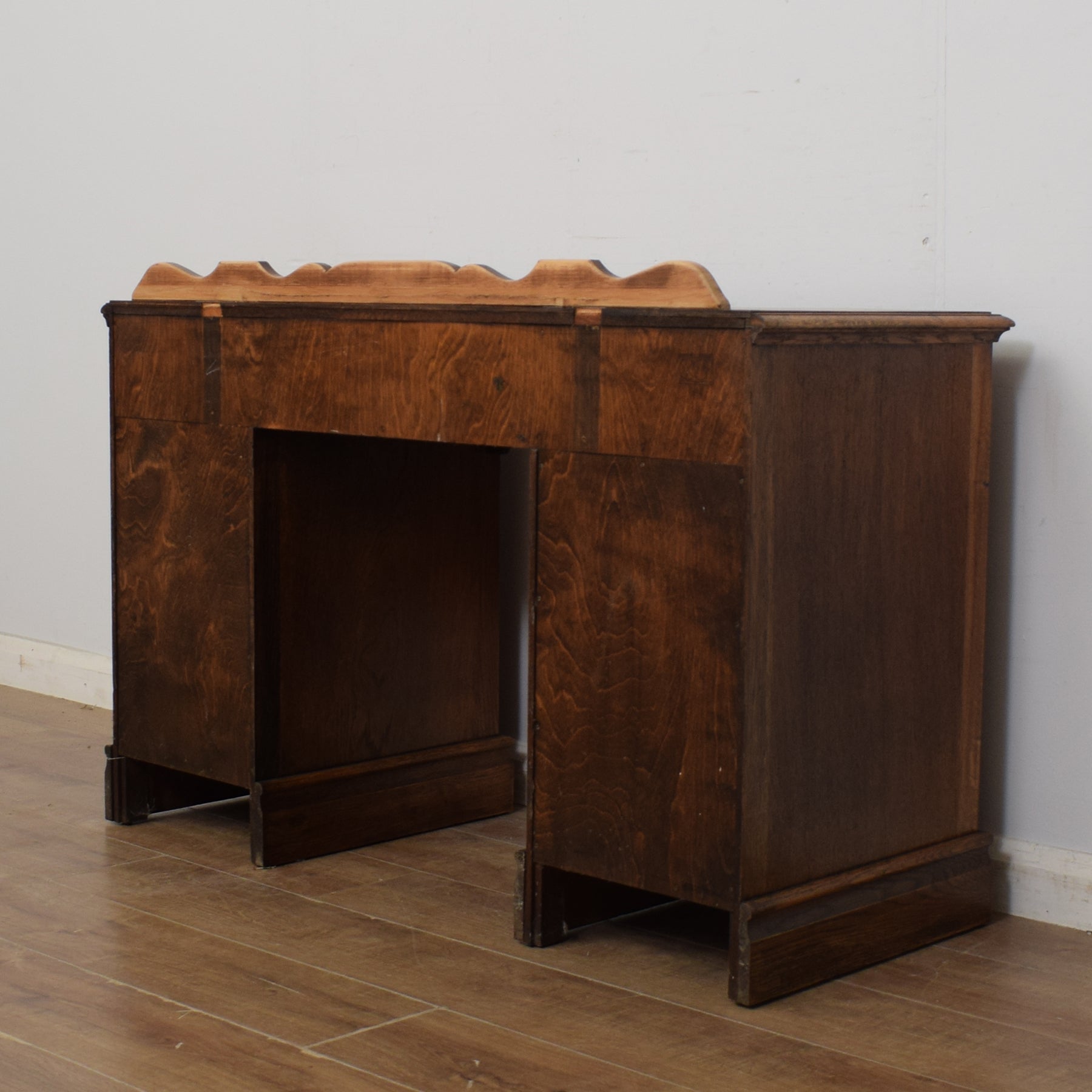 This piece of practical furniture has been beautifully restored by stripping off the old, tired dark finish before applying a clear lacquer for a robust finish. The construction of this desk is made predominantly from a mixture of woods, some solid oak and some veneer panels; the drawer bases and back are plywood.