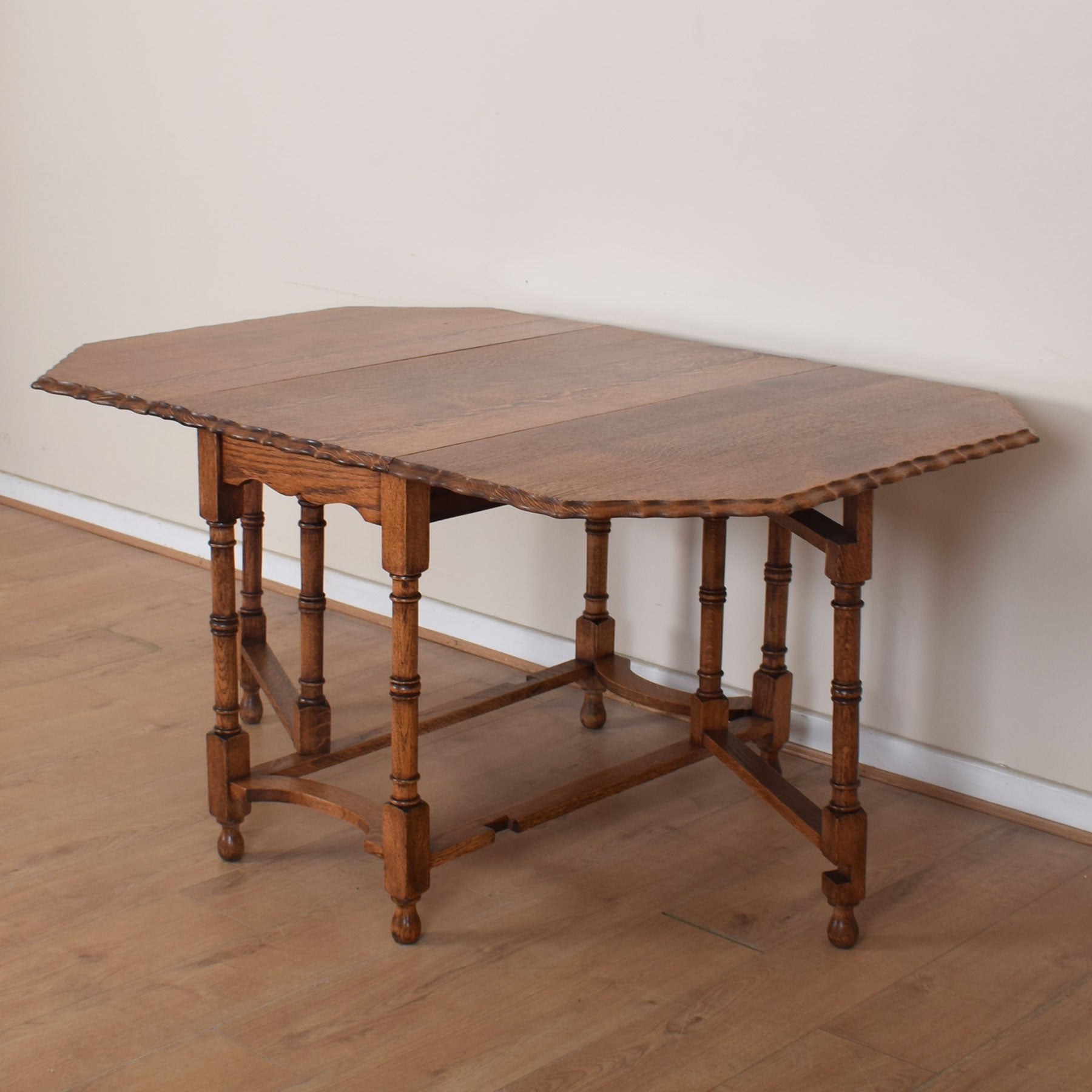 The elegant eight-sided table top offers a generous amount of space when fully extended, and is equally stable when used with one or two leaves lowered,  thanks to the traditional gate-leg frame. This nicely-crafted piece is solid oak.