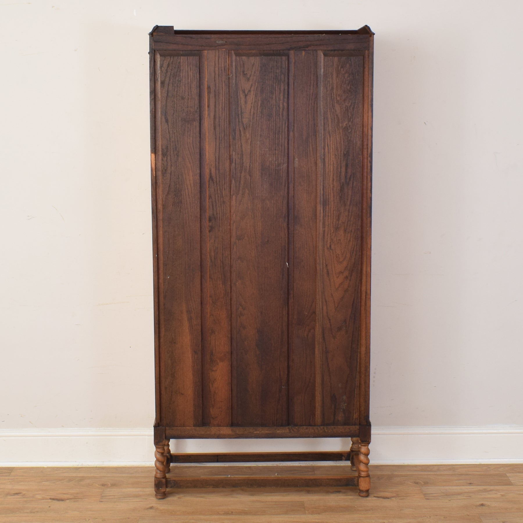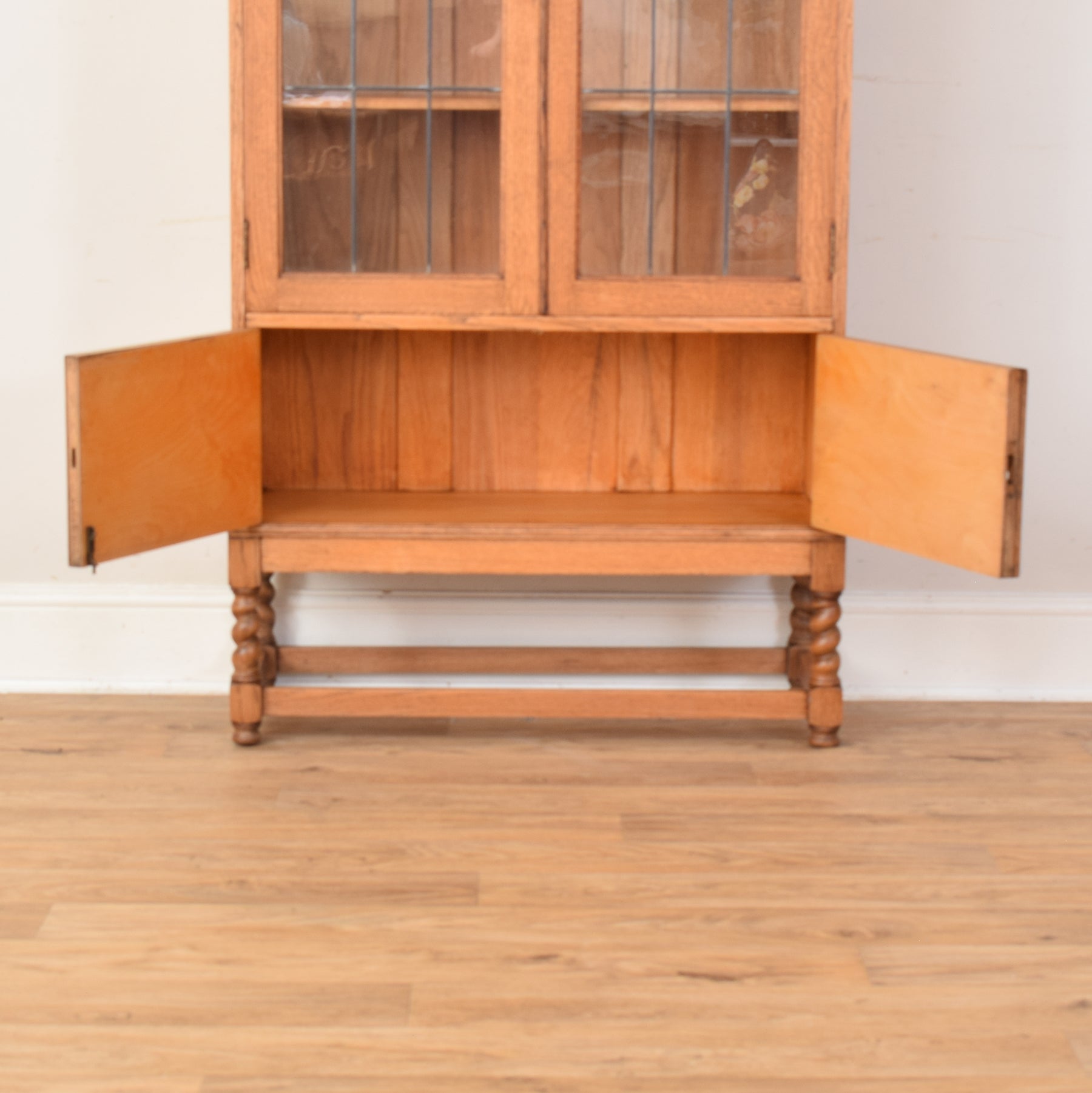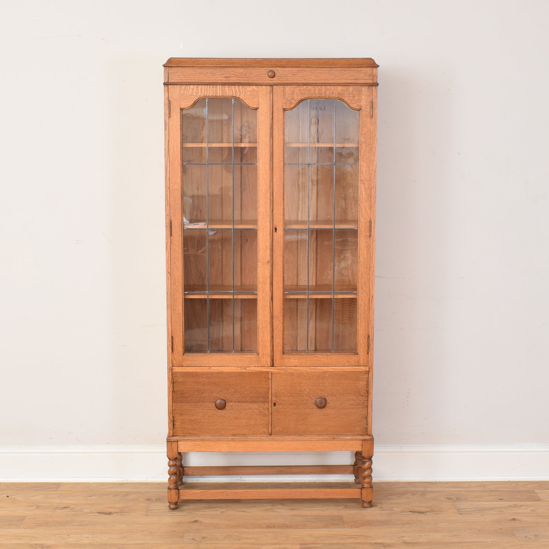 This oak glazed bookcase features classic framed glass doors with simple vertical glazing bars, giving a clear view of the shelves within. Beneath the glazed section are two small drawers with round wooden knobs, offering discreet storage. The bookcase stands on turned front legs connected by a stretcher, adding a touch of character while keeping the overall design understated.