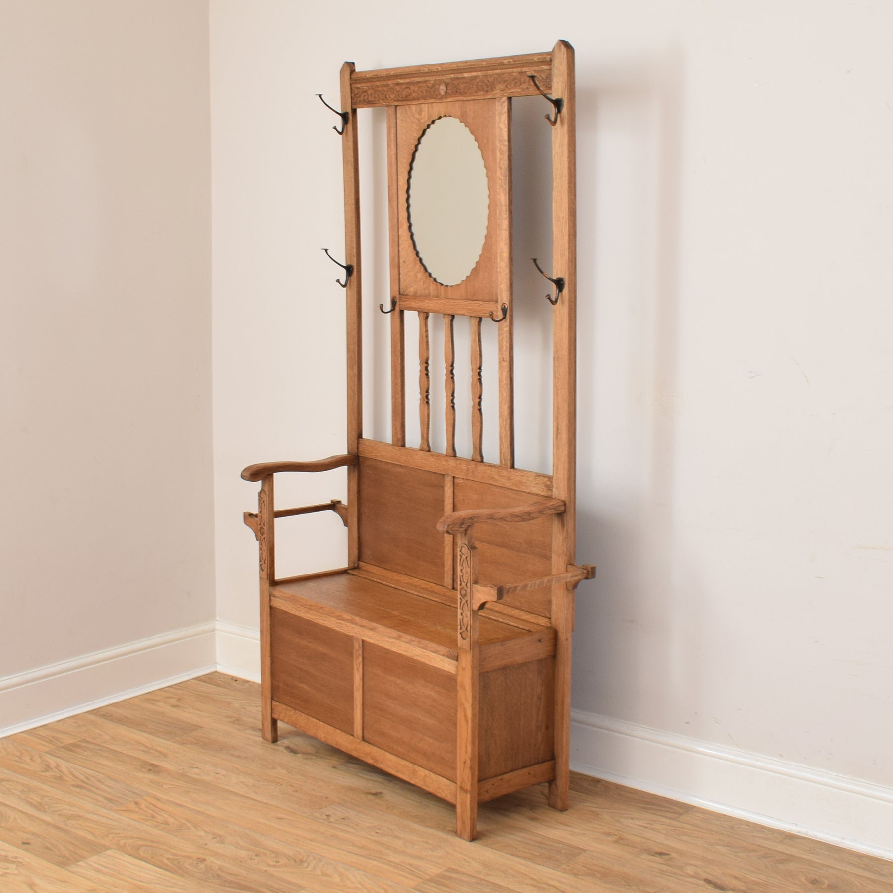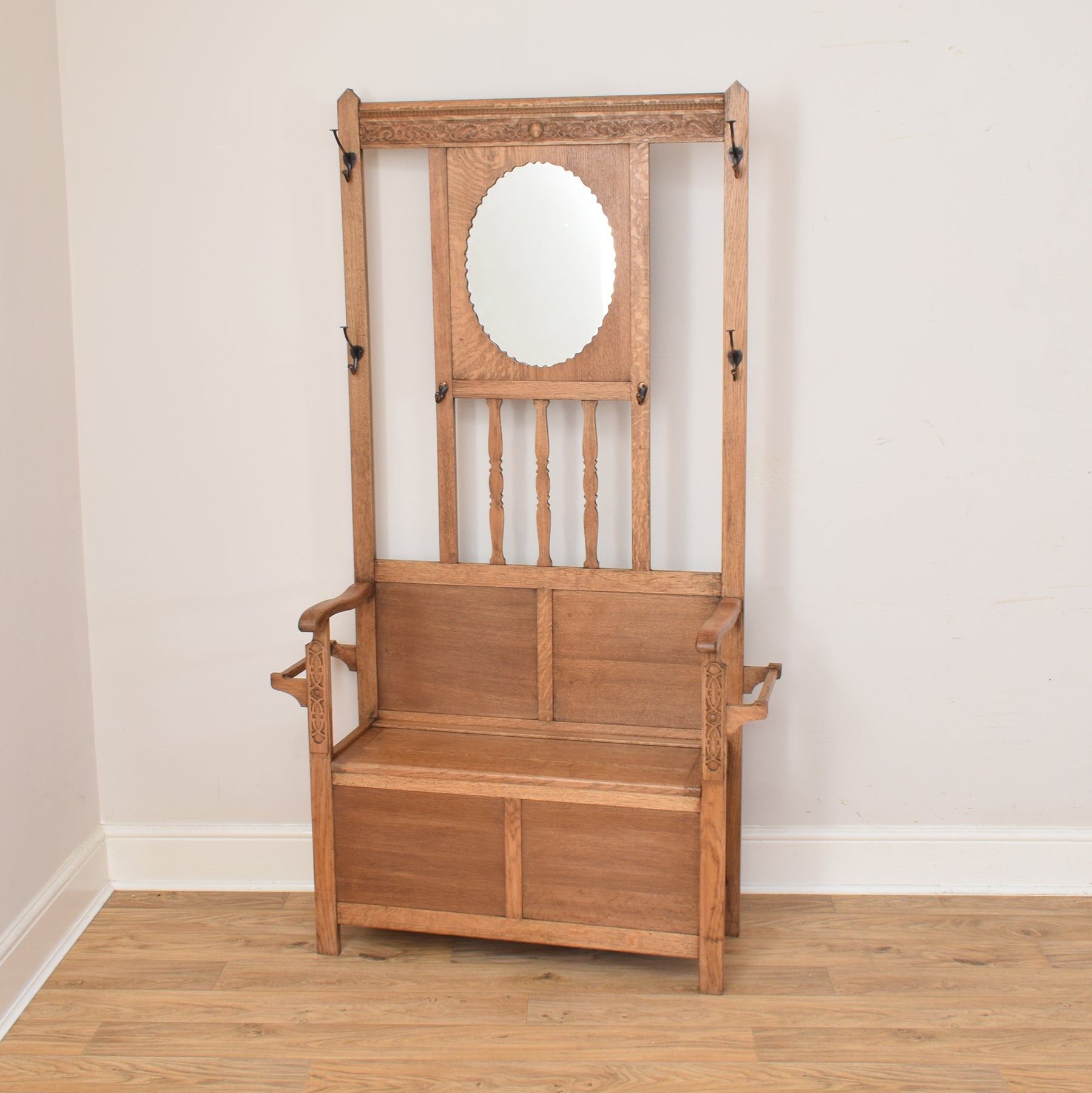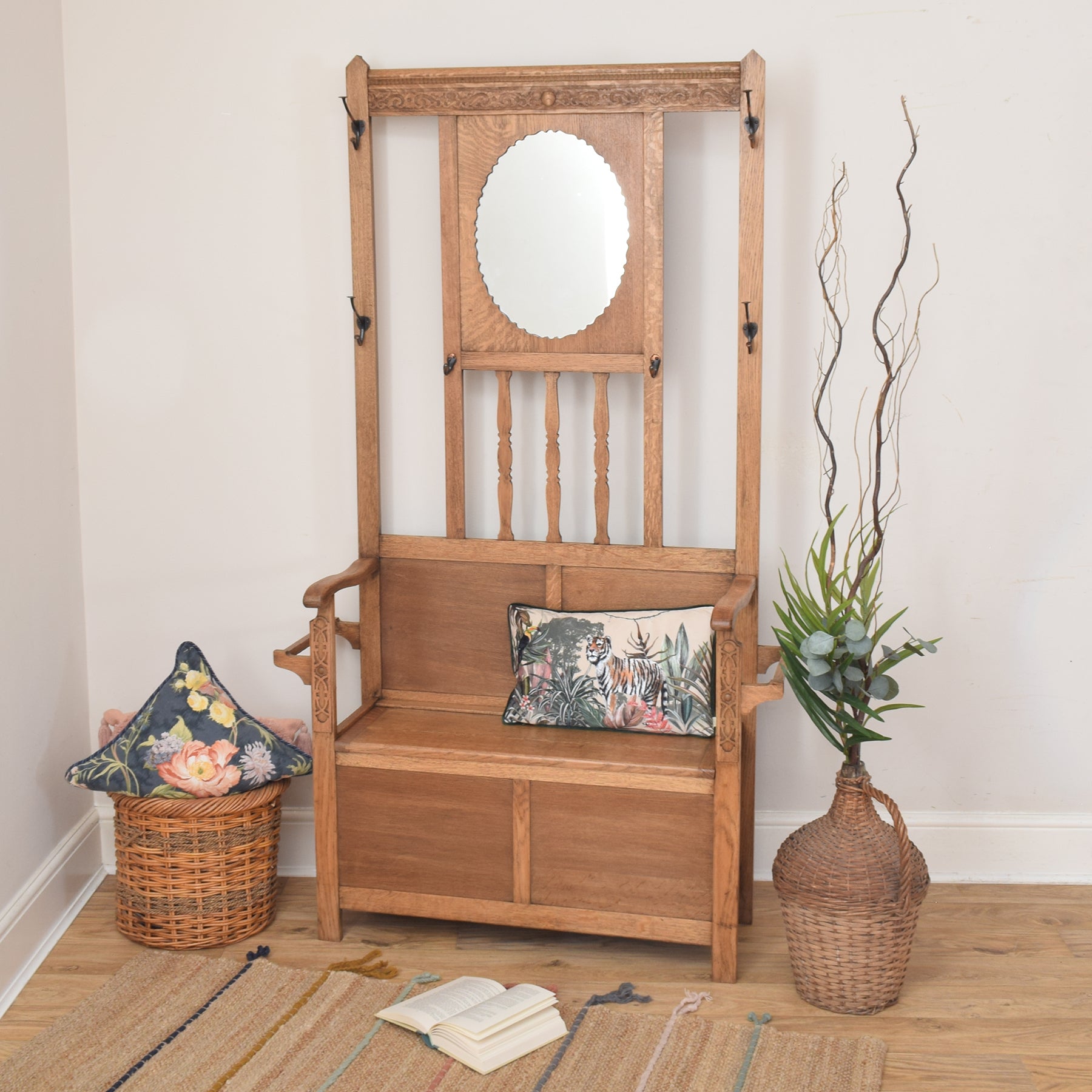 The design combines a classic hall stand with a settle-style seat, providing both seating and storage in one piece. The bench seat offers a comfortable place to sit while putting on or removing shoes, while the storage compartment beneath is ideal for footwear or bags. Above, the framed mirror adds light and depth to the space, and the surrounding hooks provide convenient hanging for coats, scarves, and hats. Subtle carved details and shaped arms add interest without detracting from the overall simplicity.