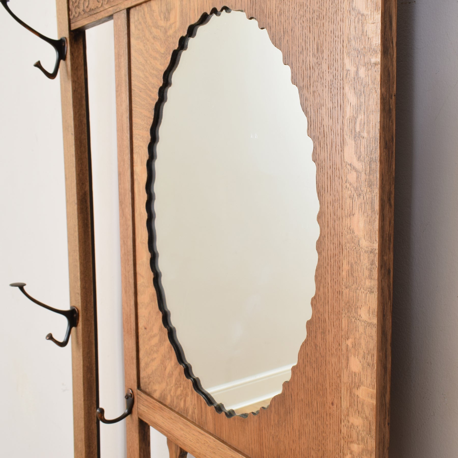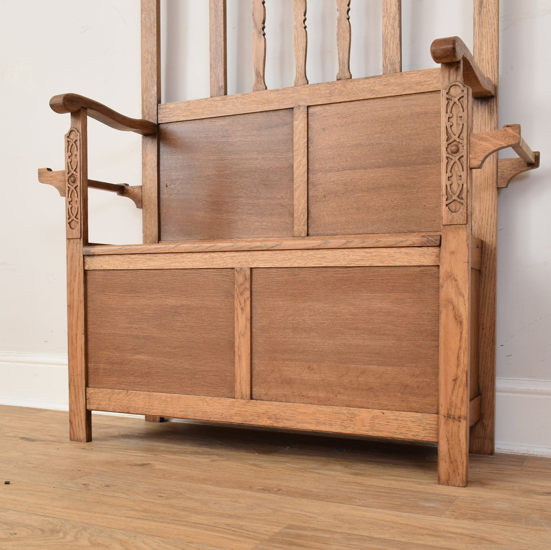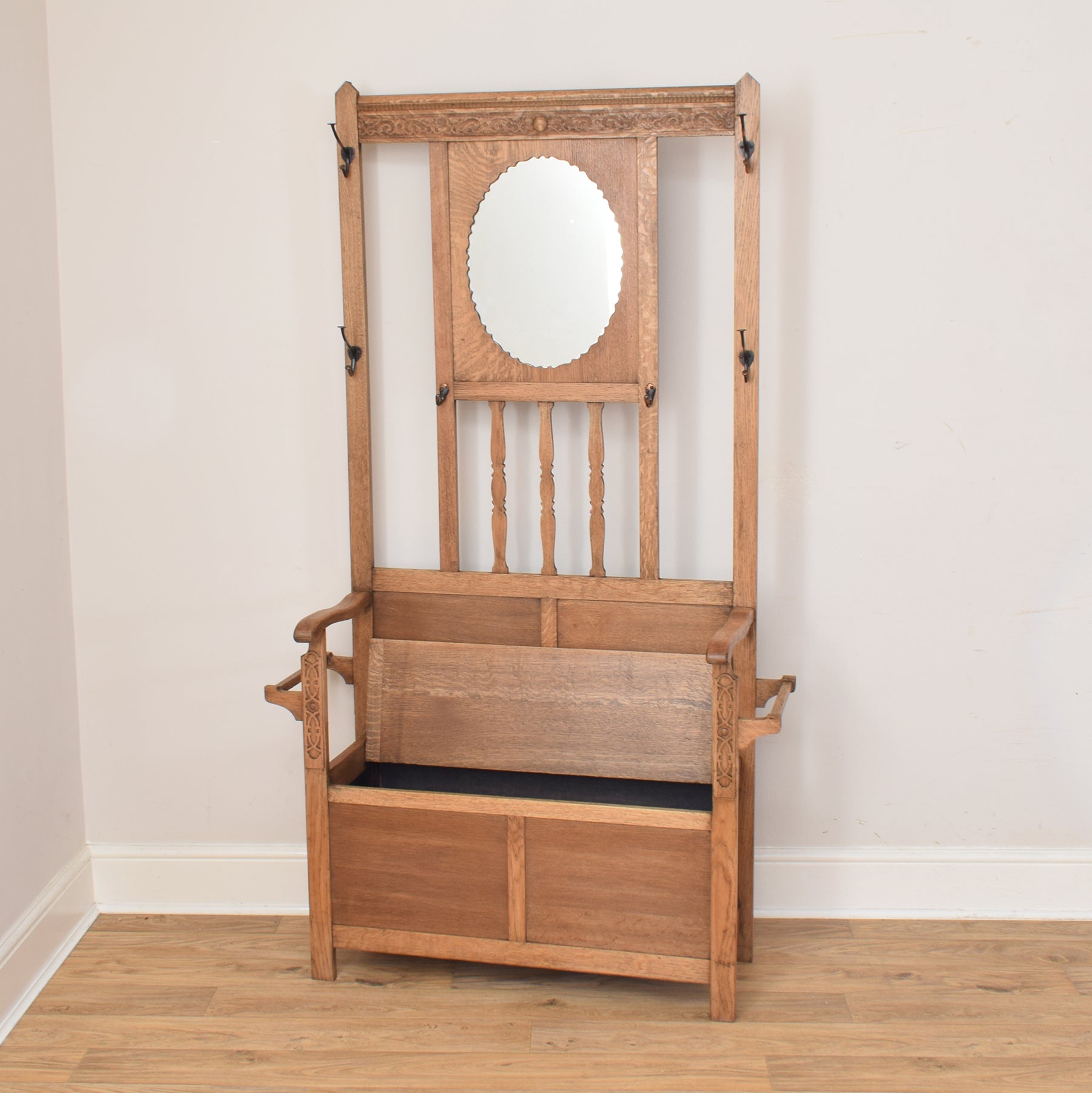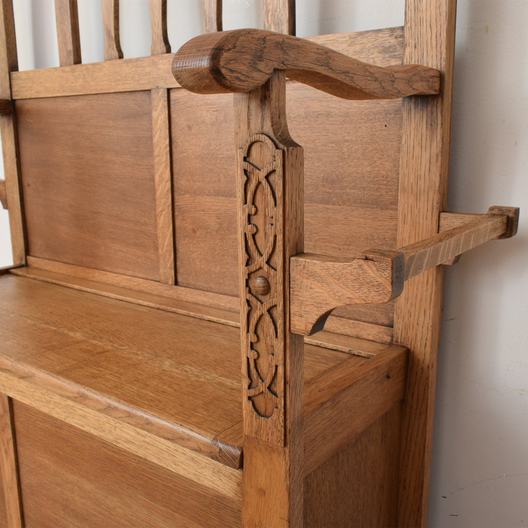The design combines a classic hall stand with a settle-style seat, providing both seating and storage in one piece. The bench seat offers a comfortable place to sit while putting on or removing shoes, while the storage compartment beneath is ideal for footwear or bags. Above, the framed mirror adds light and depth to the space, and the surrounding hooks provide convenient hanging for coats, scarves, and hats. Subtle carved details and shaped arms add interest without detracting from the overall simplicity.