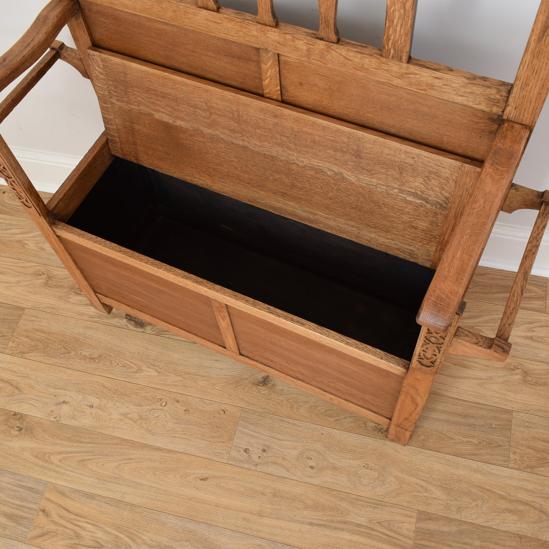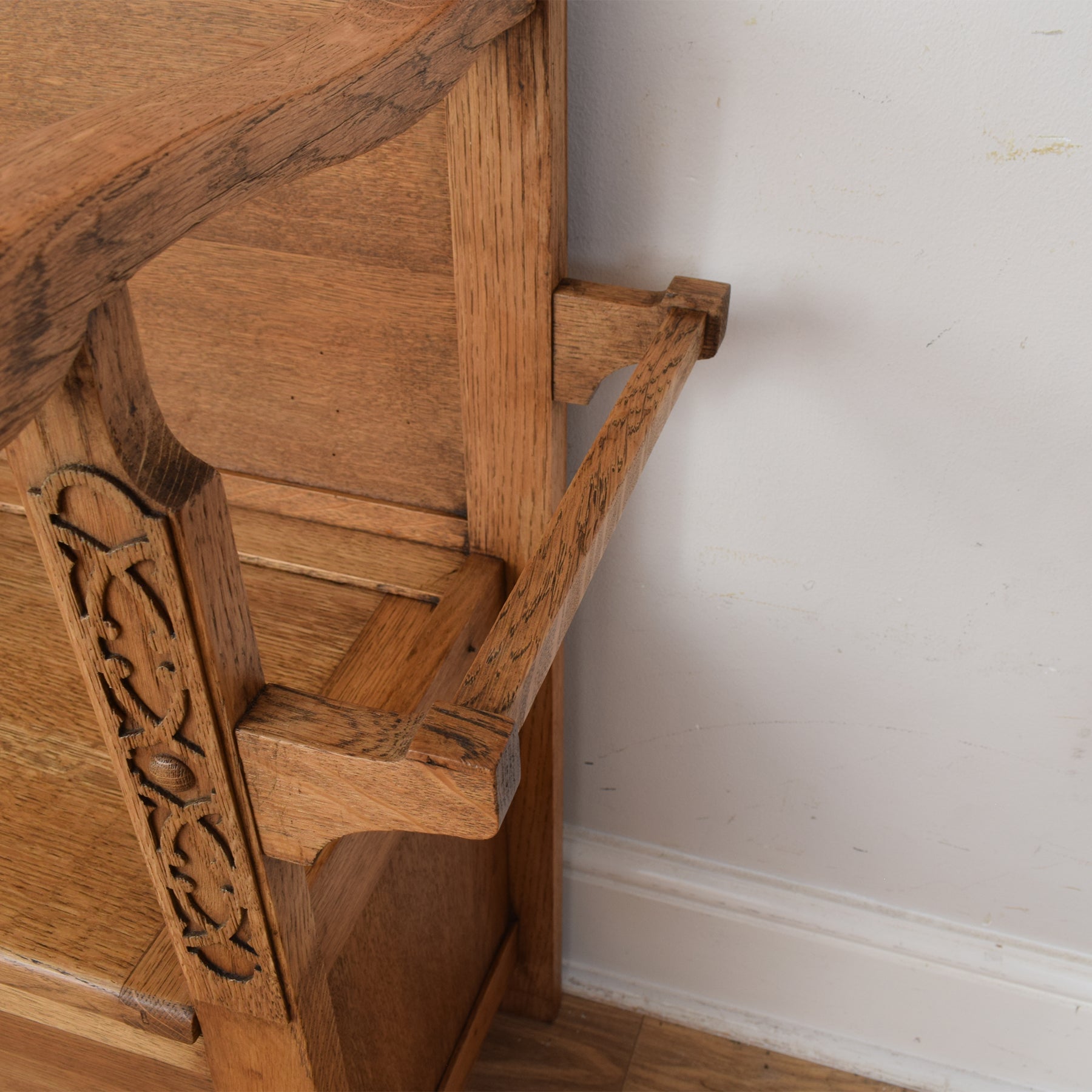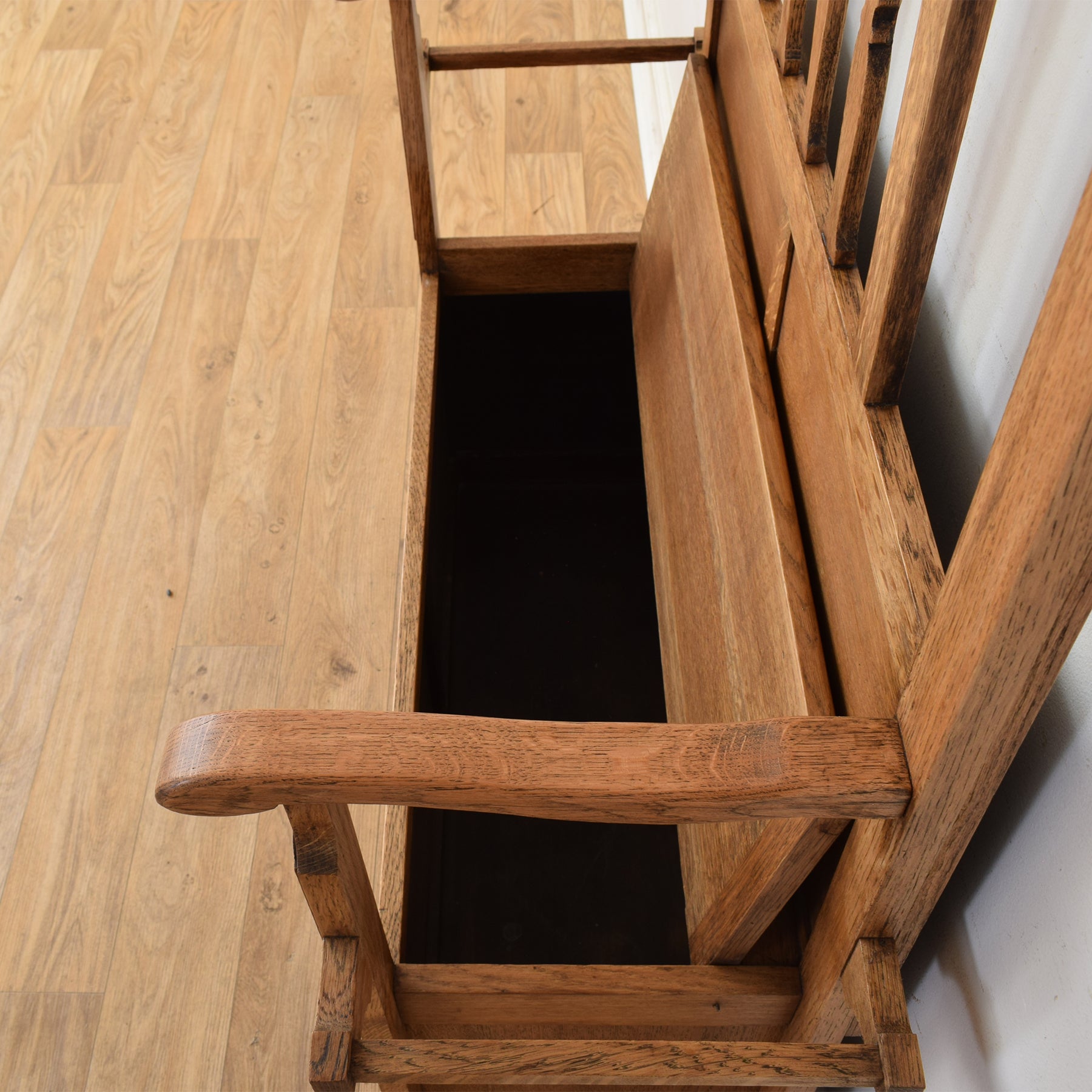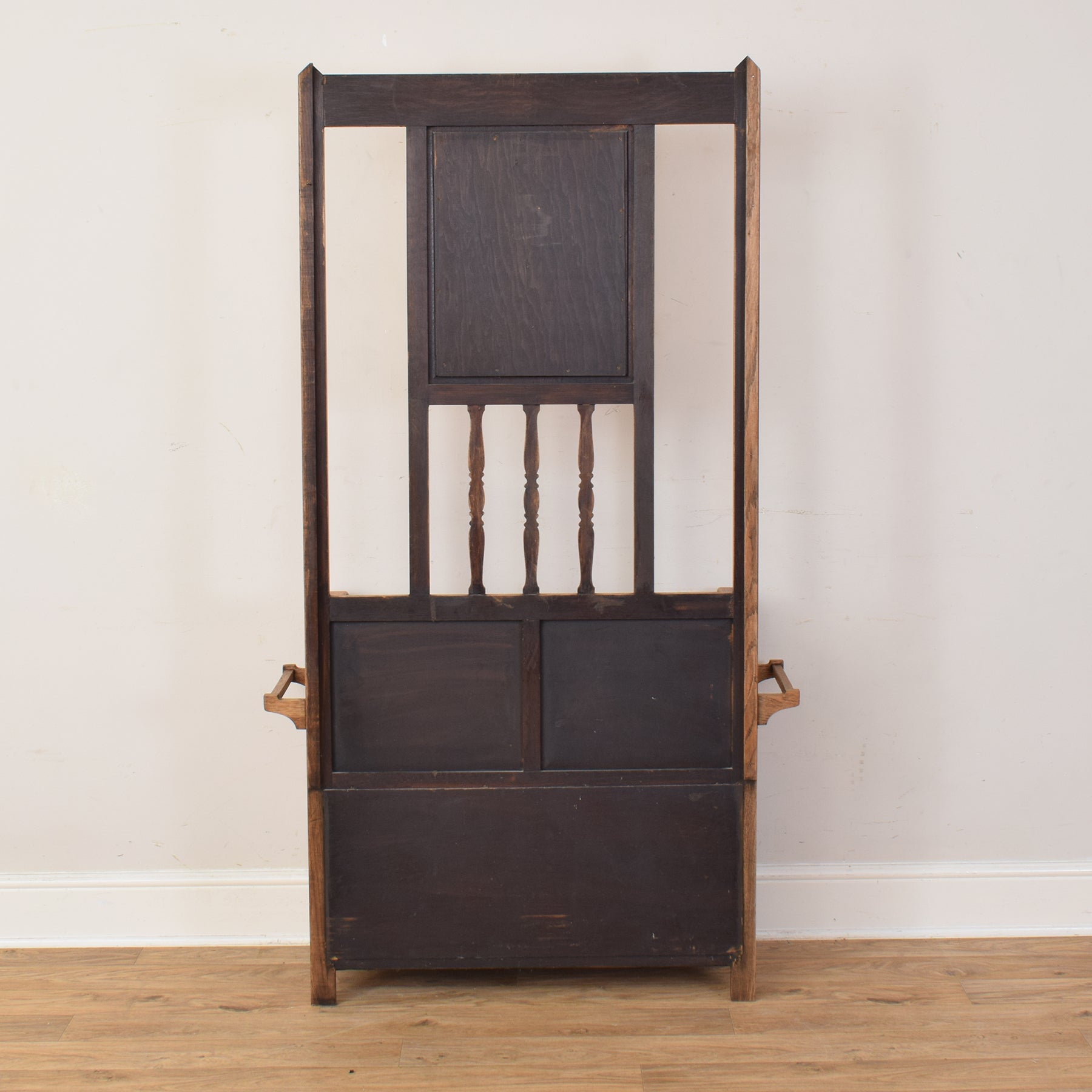 This is a characterful and useful hallway piece that brings together seating, storage, and hanging space, making it a practical addition to a traditional or period-style home.