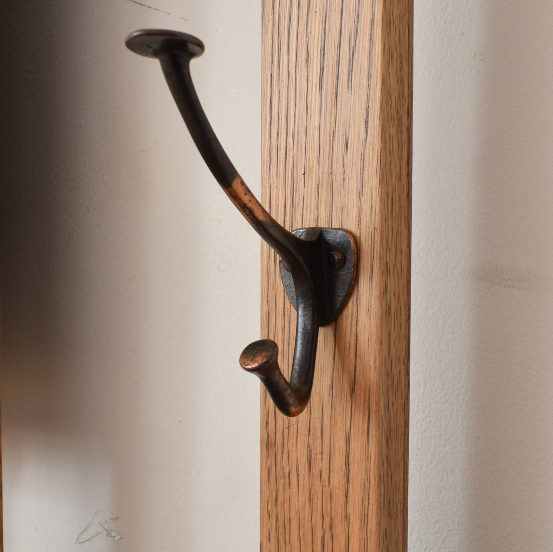 The previous finish has been stripped back, and the piece has been carefully prepared before multiple coats of hard-wearing matte lacquer were applied. This creates a durable, long-lasting surface while highlighting the natural oak grain. The hall stand is made from solid oak with oak veneer panels, and the bottom panel is made from plywood.