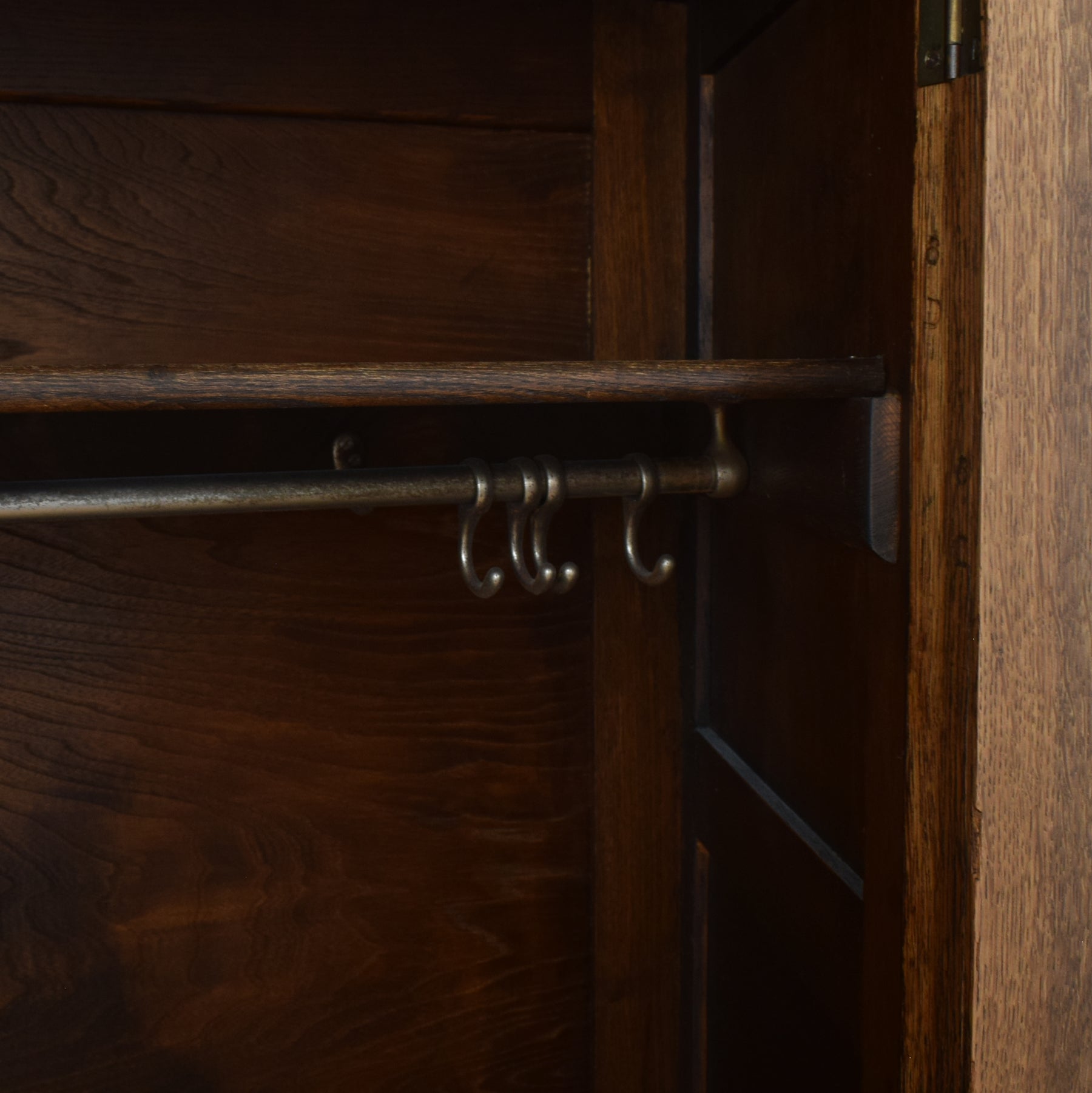 The previous darker finish has been carefully stripped away, followed by several coats of hard-wearing matte lacquer. This treatment provides a smooth, long-lasting surface that enhances the natural oak grain and protects the wood. The robe is made from solid oak with veneered oak panels, and the rear panel is constructed from plywood for added stability. There is no key with this wardrobe but the door latches securely shut.