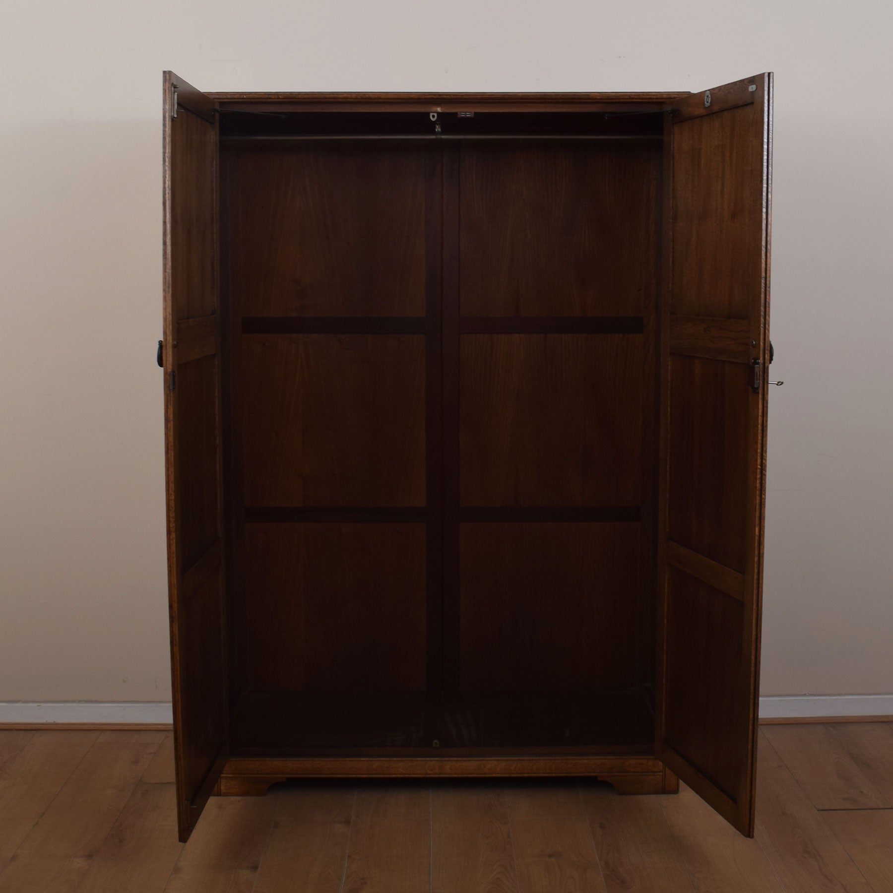 We have meticulously restored this beautiful item by hand, carefully removing the previous darker stain before applying multiple layers of a clear lacquer to achieve a durable and attractive finish. This wardrobe is primarily made of oak and oak veneer, with plywood used for the interior and back panels. The dimensions show the external measurements for this wardrobe. For reference, the hanging rail is 118cm in width and gives a hanging depth of 48cm and a hanging height of 140cm.