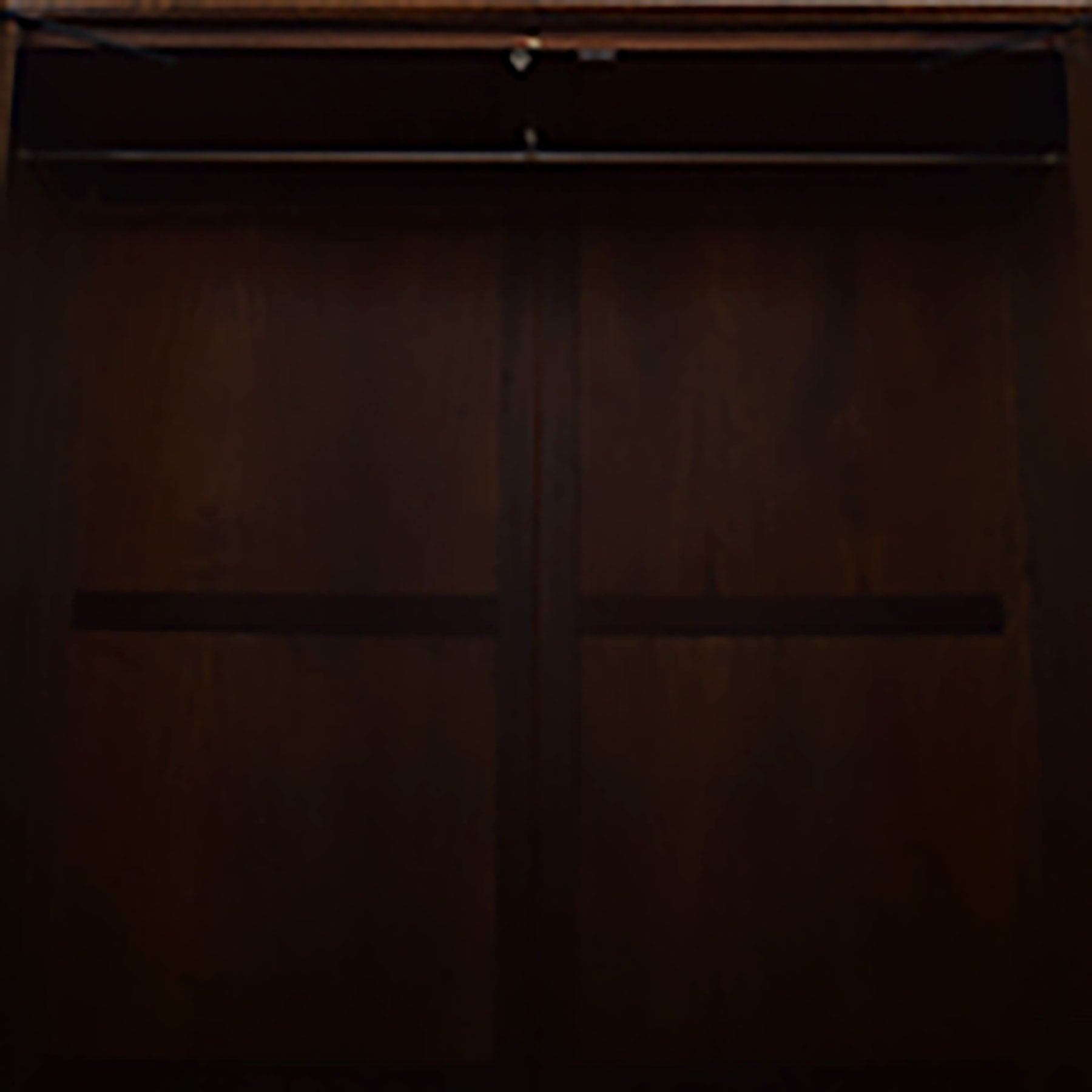 The wardrobe is designed with classic linenfold panelled doors, embellished with carved details along the centre rail and fitted with traditional metal hinges. Its proportions are robust and well-balanced, providing practical storage behind the double doors while highlighting the texture and diversity of the oak grain. The overall appearance is timeless, featuring decorative elements that are subtle rather than extravagant. As illustrated in the photos, there is a metal hanging rail positioned in the upper section, which is ideal for hanging your garments.