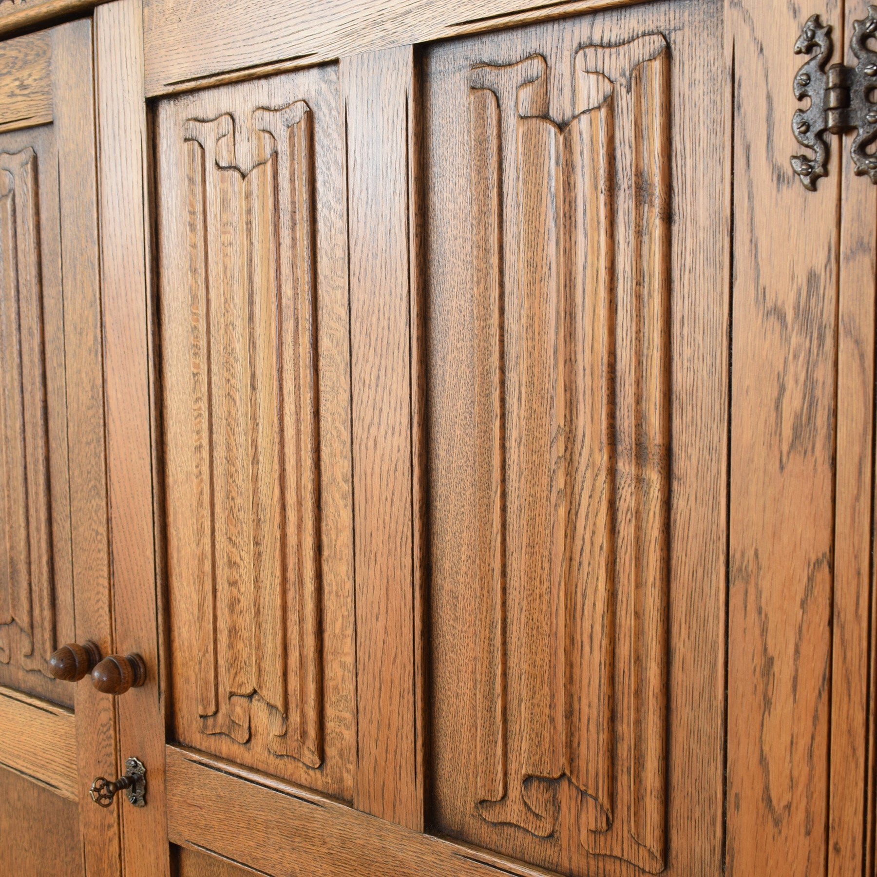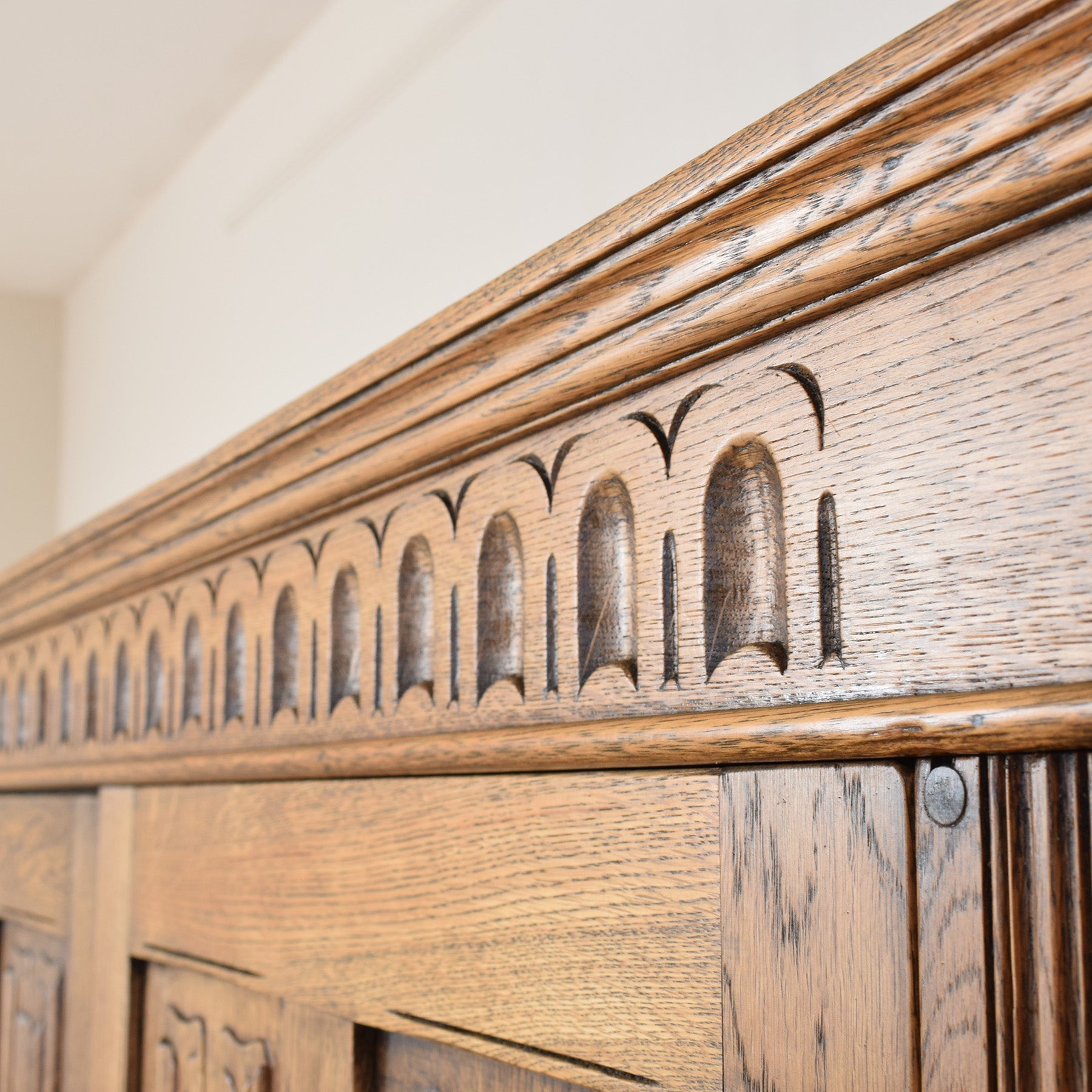 The exterior features classic linenfold carved panels to the upper doors, framed by simple vertical and horizontal panelling below. The carved frieze running along the top edge adds subtle decorative interest, while the warm oak tones highlight the natural grain throughout. Inside, the wardrobe provides a spacious hanging area with a fitted rail and an upper shelf to one side, offering flexible storage for clothing, shoes, or folded items. The interior has a deeper, rich tone that contrasts attractively with the lighter outer finish.