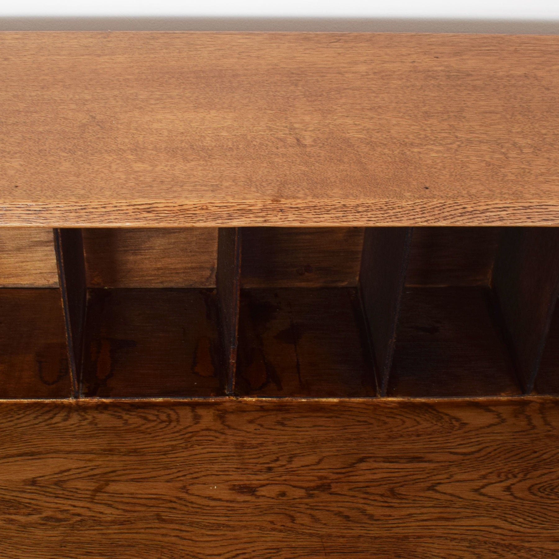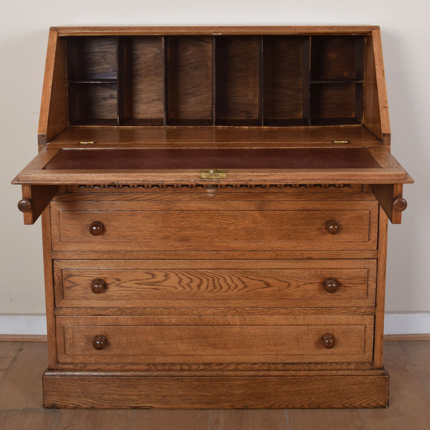 Our restoration workshop has stripped the original varnish from this bureau before finishing with a professional matt lacquer that enhances the rich tones of the oak and also provides a good level of everyday protection. The dimensions show the depth and height of this bureau with the lid closed, followed in brackets by the total depth and the height of the writing surface with the lid open and resting on the supports. It should be noted that the bureau lid has been forced open in the past, resulting in a repair to the top edge, which can be seen in the photographs. We have also fitted a wooden knob over the original keyhole in the bureau lid.