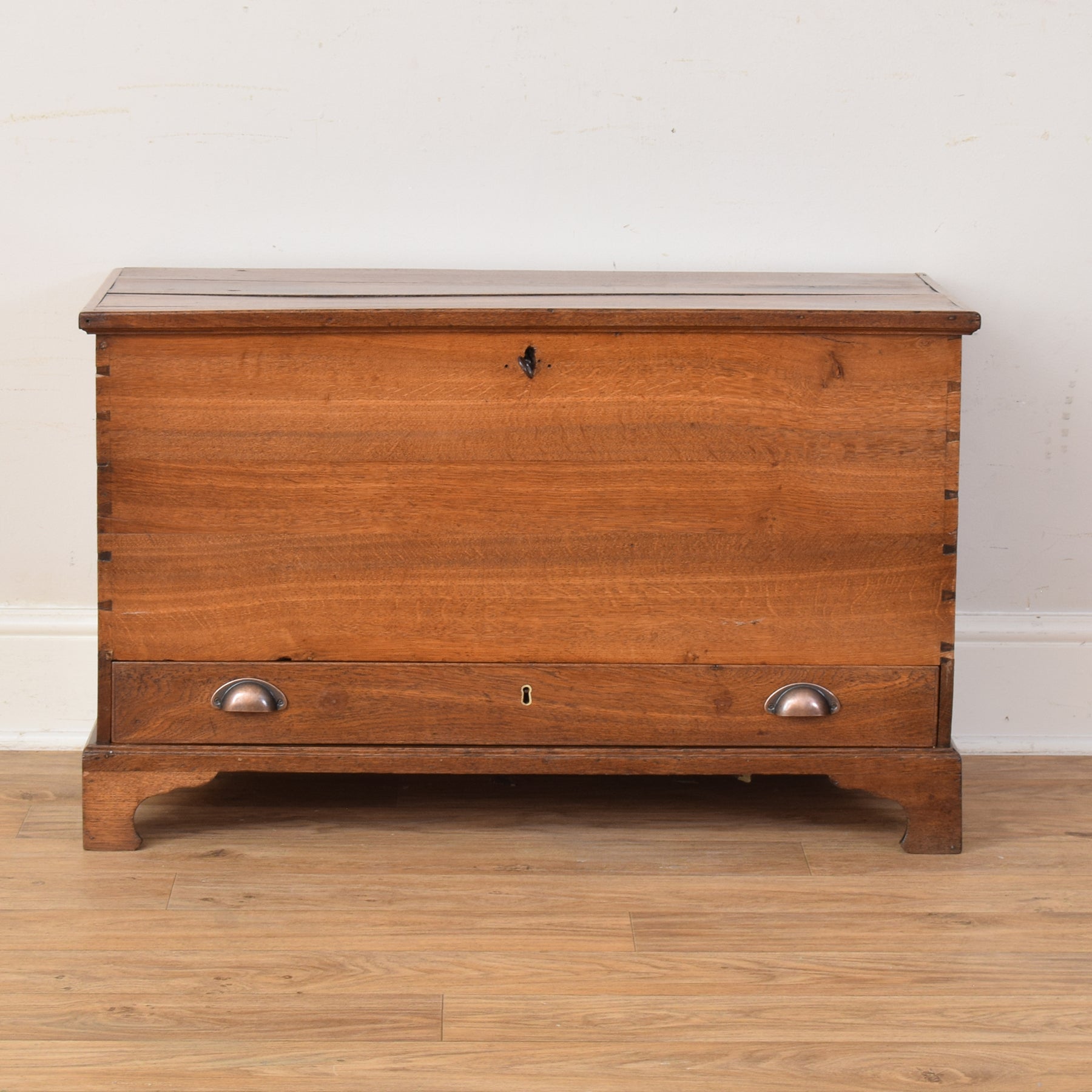 This oak mule chest presents a classic, understated design with clean lines, gently curved bracket feet, and a lower drawer fitted with simple metal pulls. The warm tone of the oak grain is visible across every surface, giving the piece an inviting and familiar look. Some marks and natural splits on the lid add authenticity, suggesting a long and well-lived history that enhances its appeal rather than detracts from it.