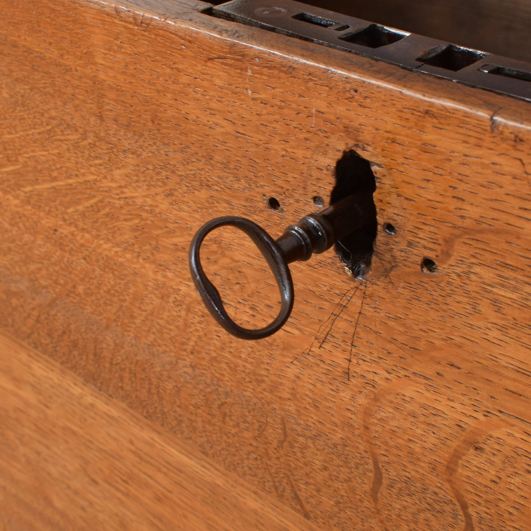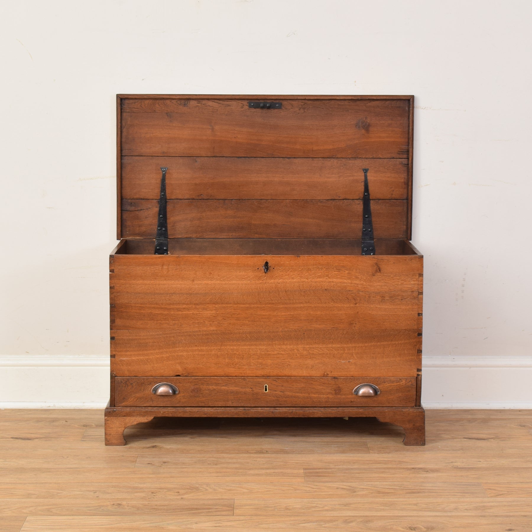 The previous darker finish has been fully stripped, followed by multiple coats of hard-wearing matte lacquer that protect the surface while drawing out the depth of the oak. These marks and splits on the lid have been sensitively preserved as part of the piece’s character. This item is made from solid oak, with the main chest base constructed from plywood.