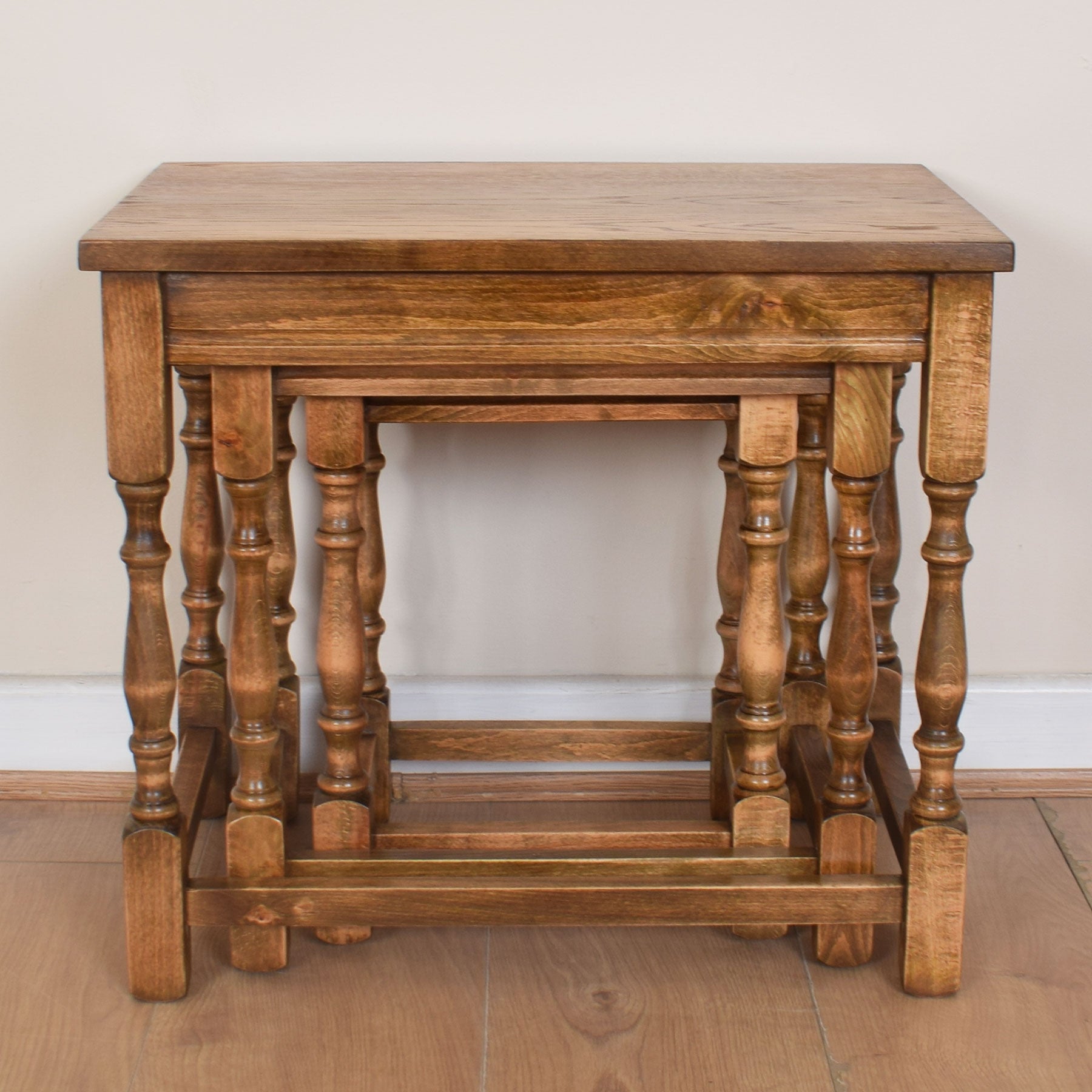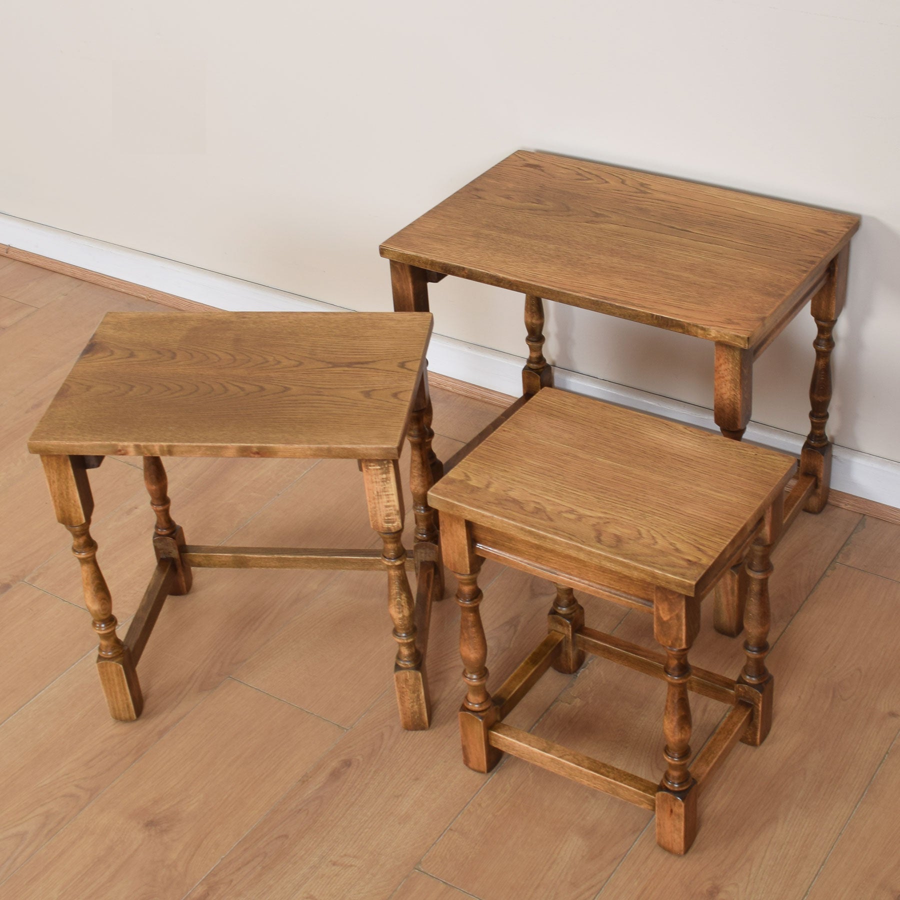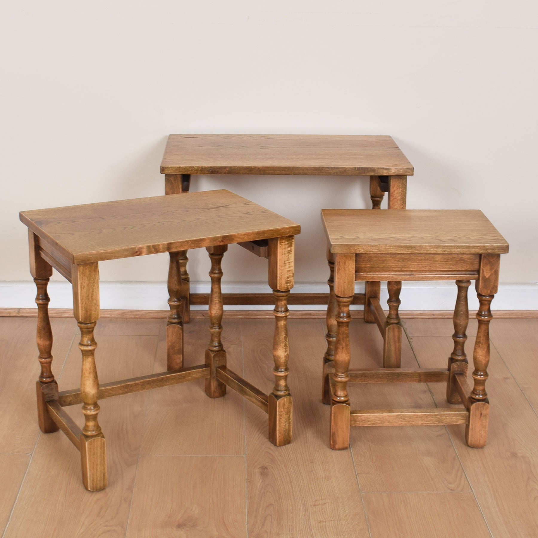 Our restoration workshop has stripped and cleaned these tables before applying a professional matt lacquer that enhances the oak finish as well as providing a good level of everyday protection. The dimensions show the measurements for each of the three tables separated by '/'.