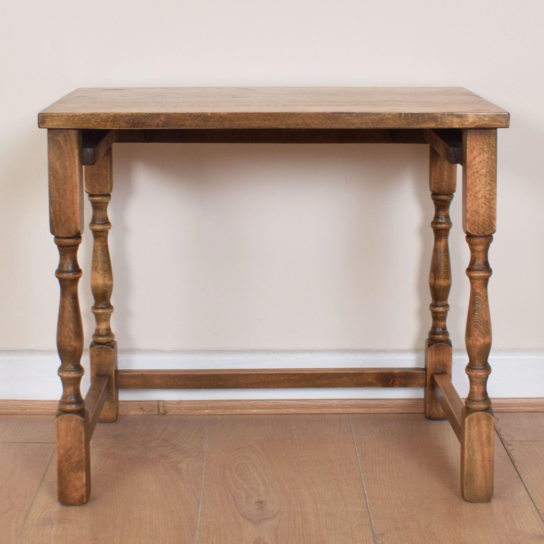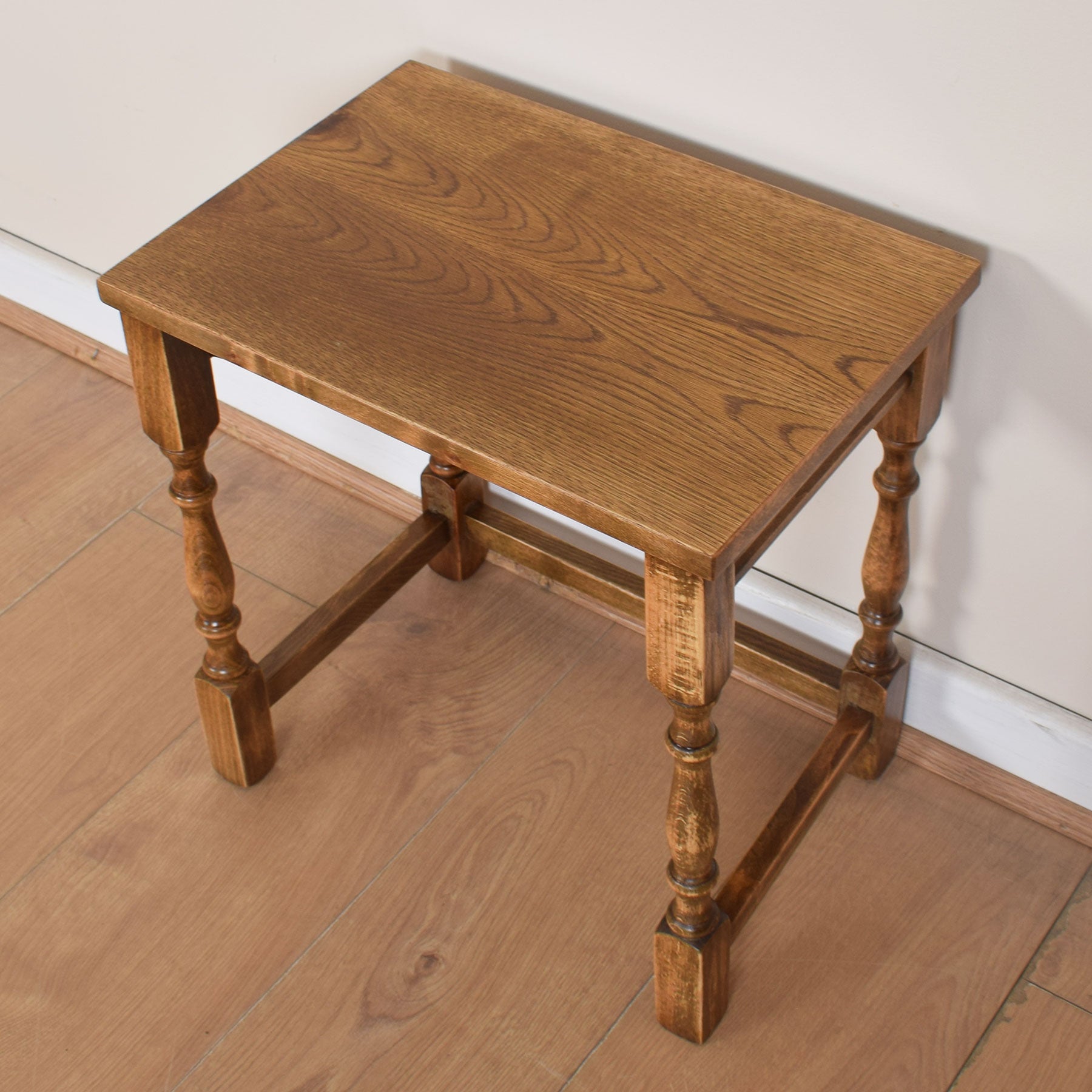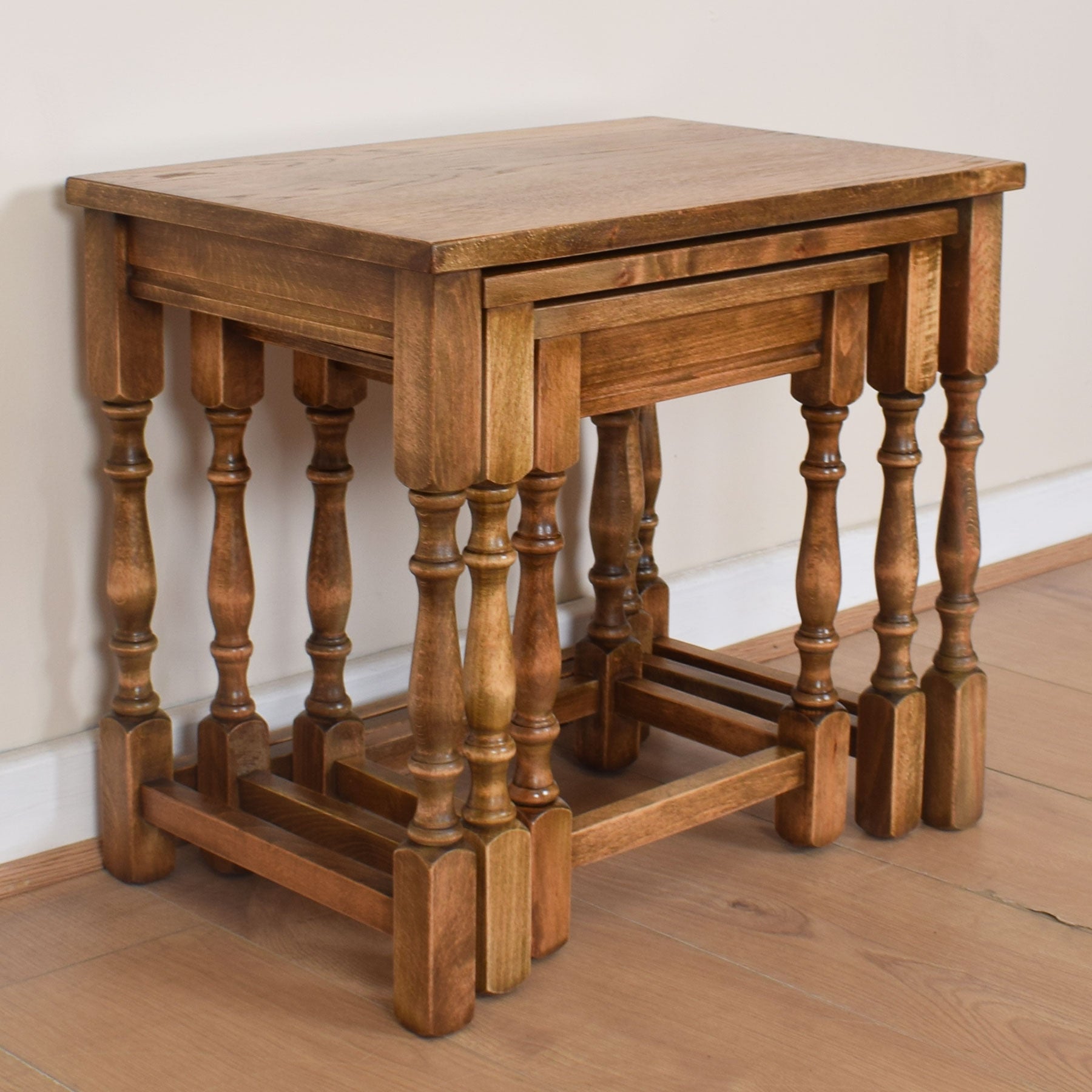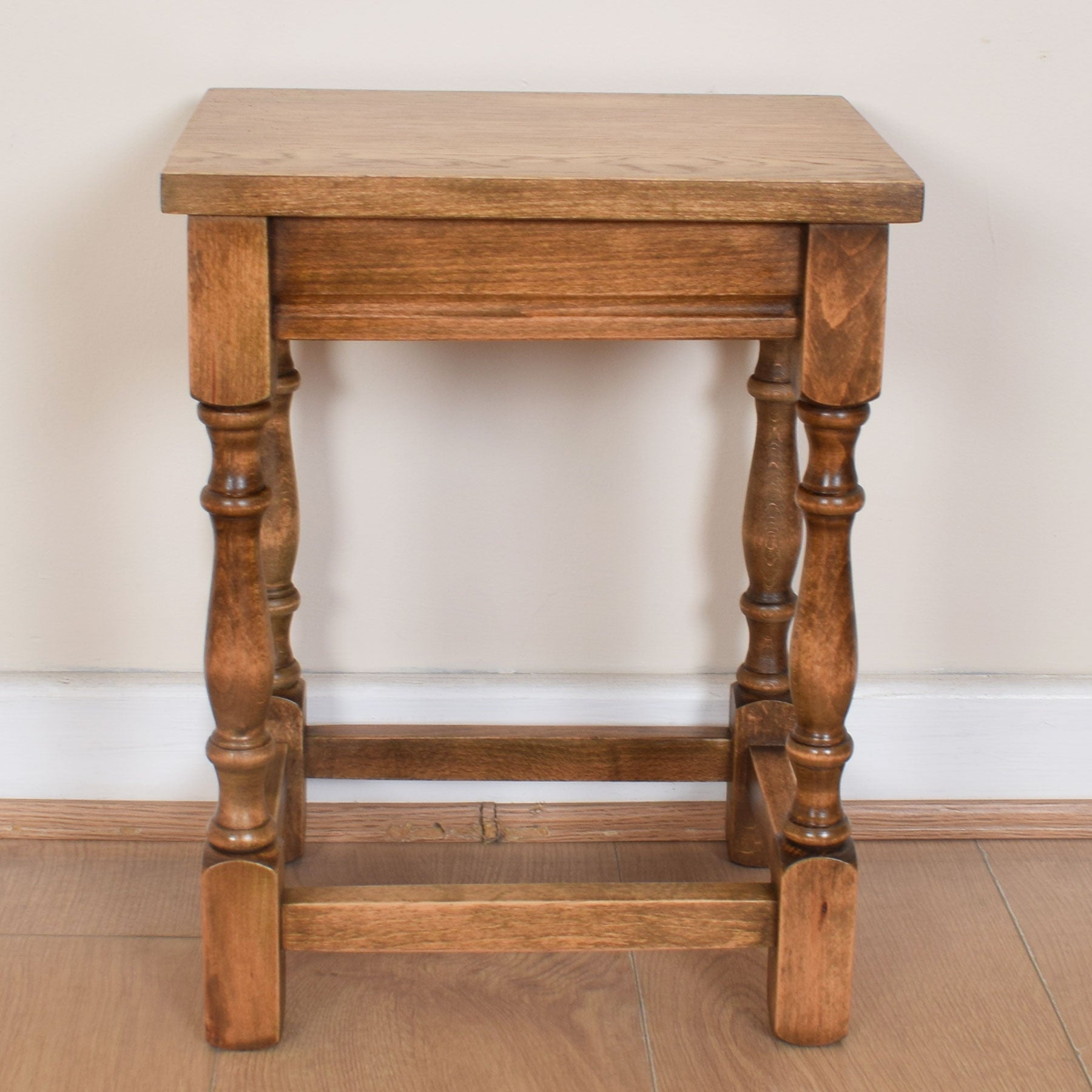 Our restoration workshop has stripped and cleaned these tables before applying a professional matt lacquer that enhances the oak finish as well as providing a good level of everyday protection. The dimensions show the measurements for each of the three tables separated by '/'.