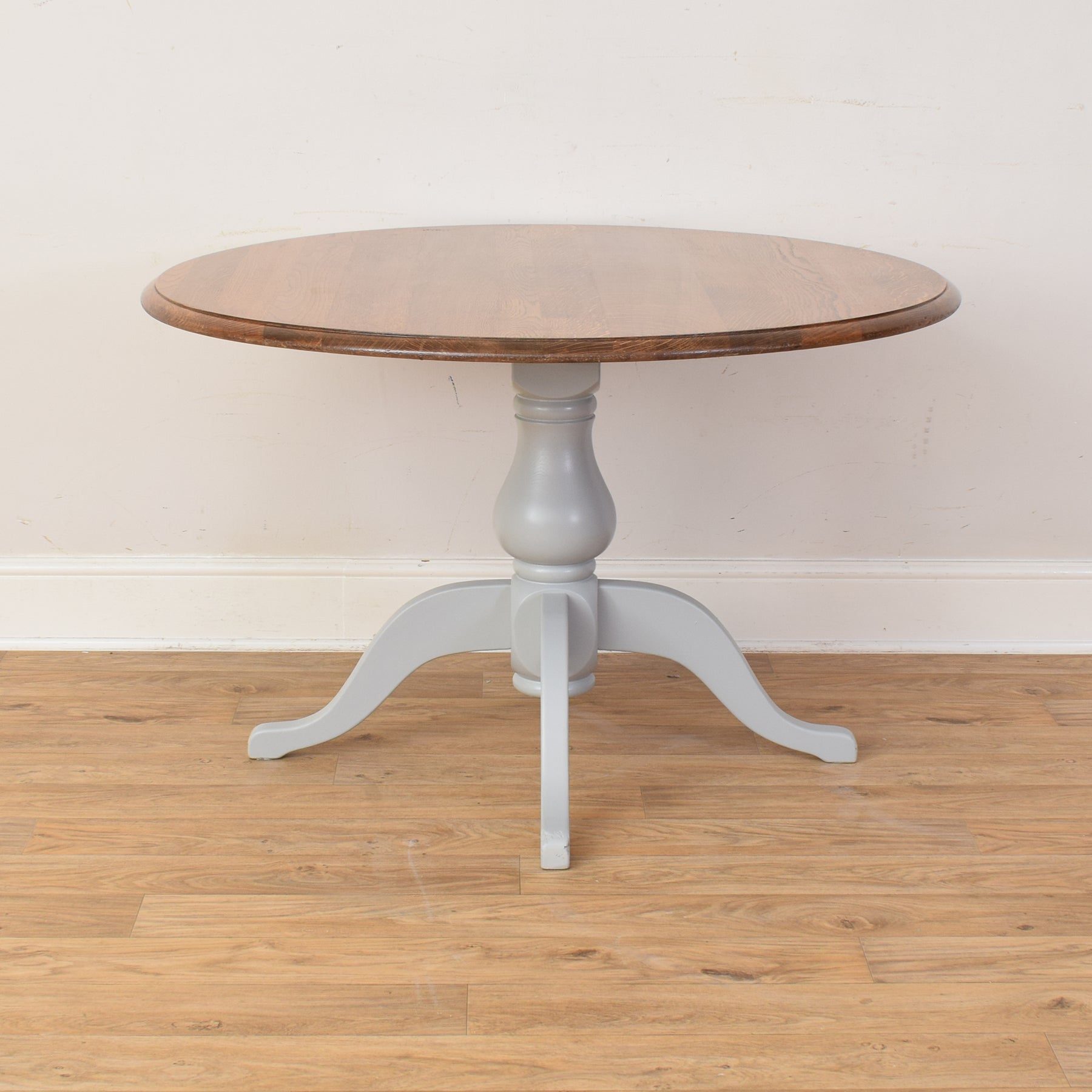 This set includes a round wooden table supported by a sturdy pedestal base, accompanied by four ladder-back chairs. The warm wooden seats and tabletop contrast neatly with the painted frames, while the gently shaped chair backs and turned finials give the set a timeless, homely character. Its compact footprint allows it to sit comfortably in both traditional and modern interiors.
