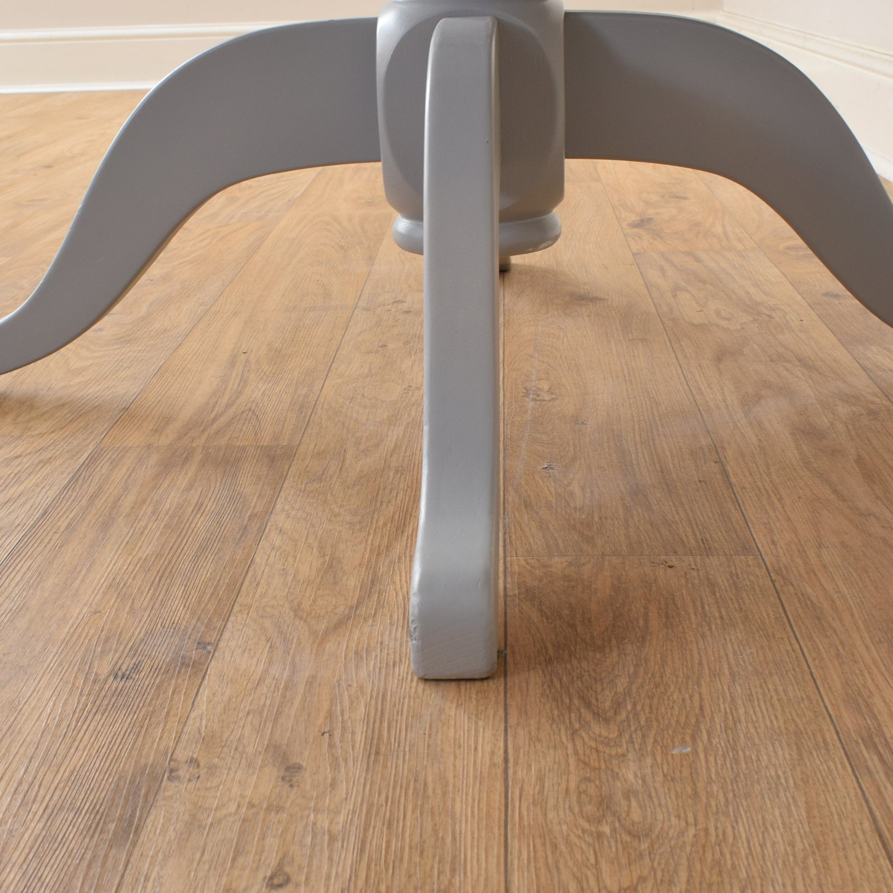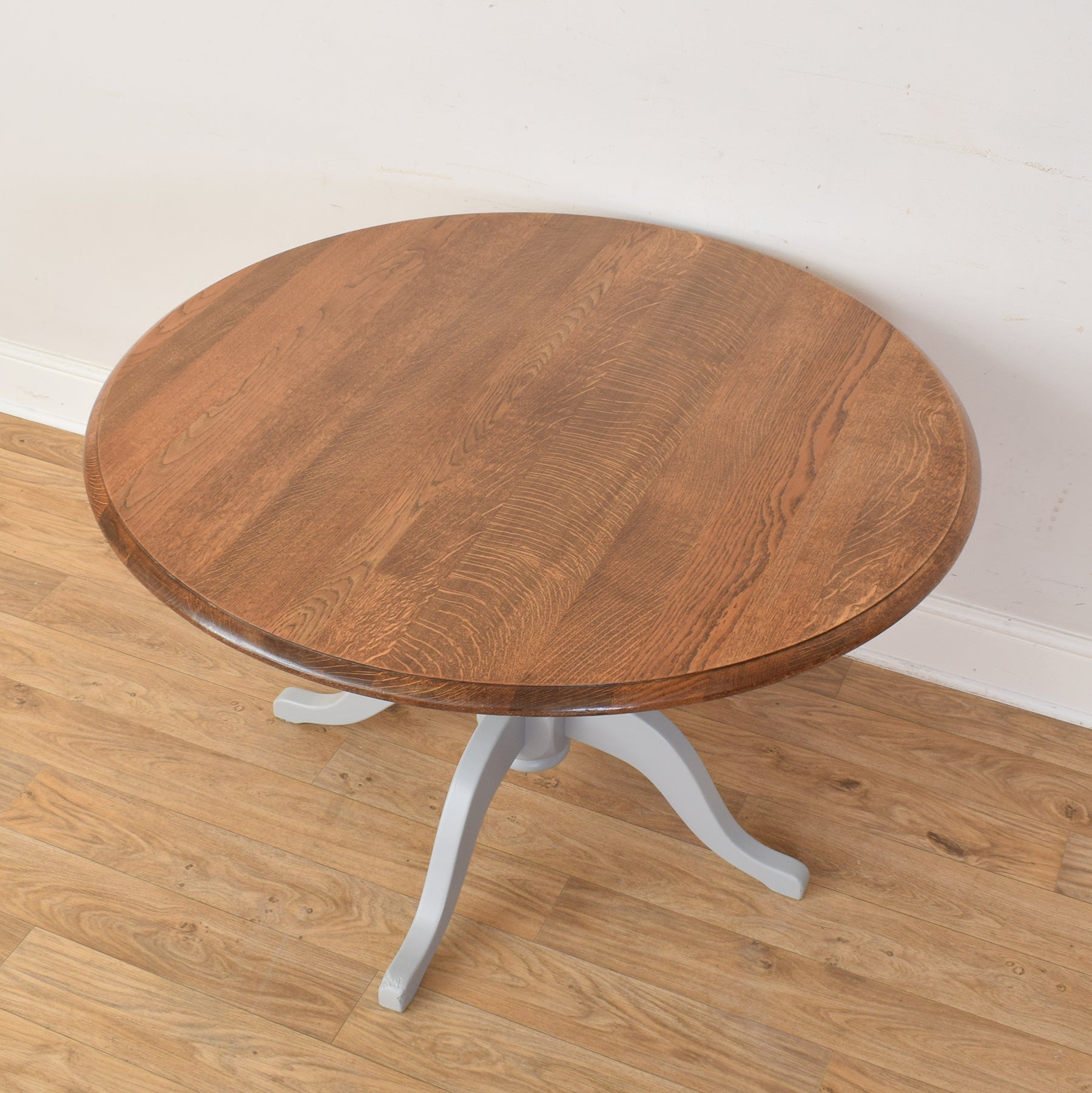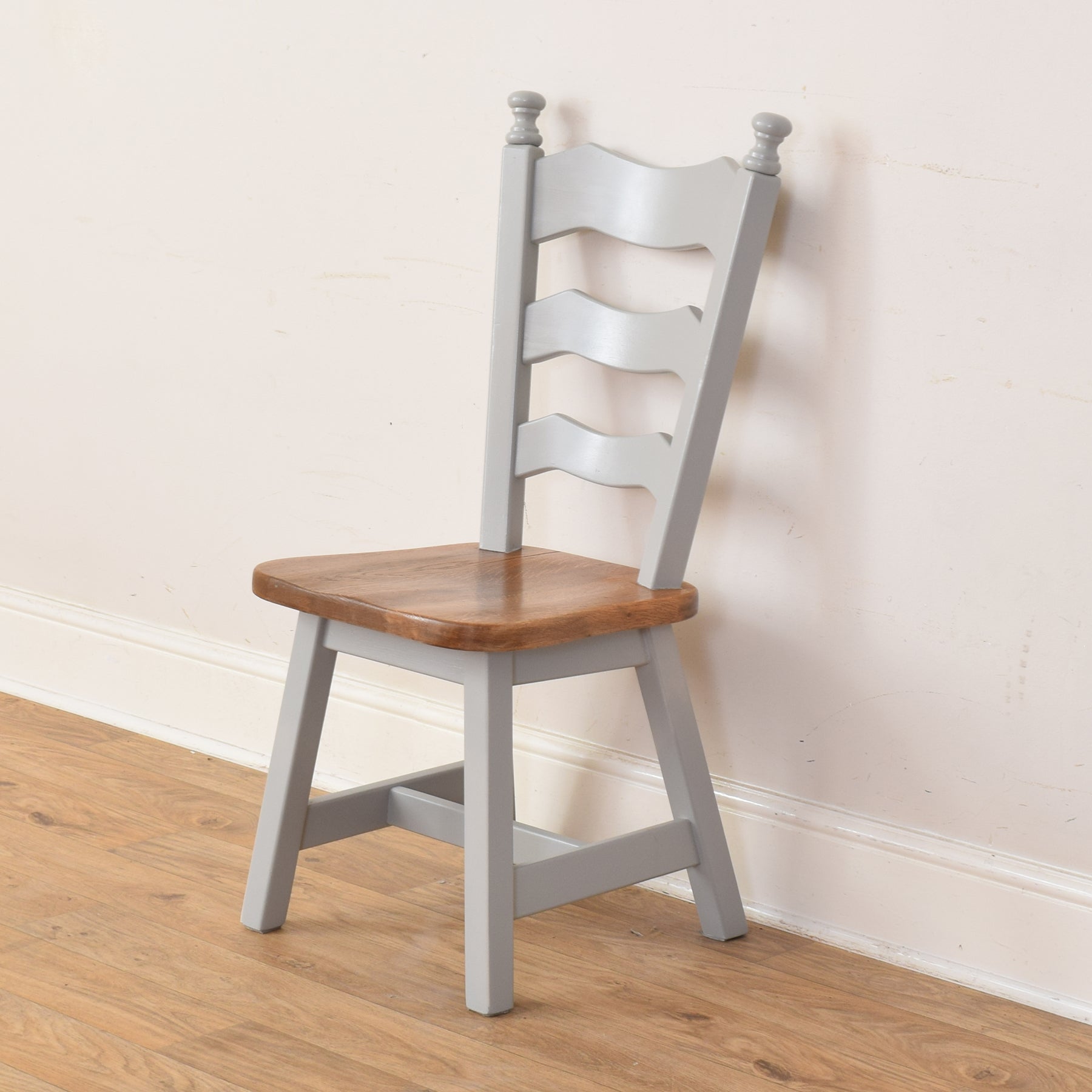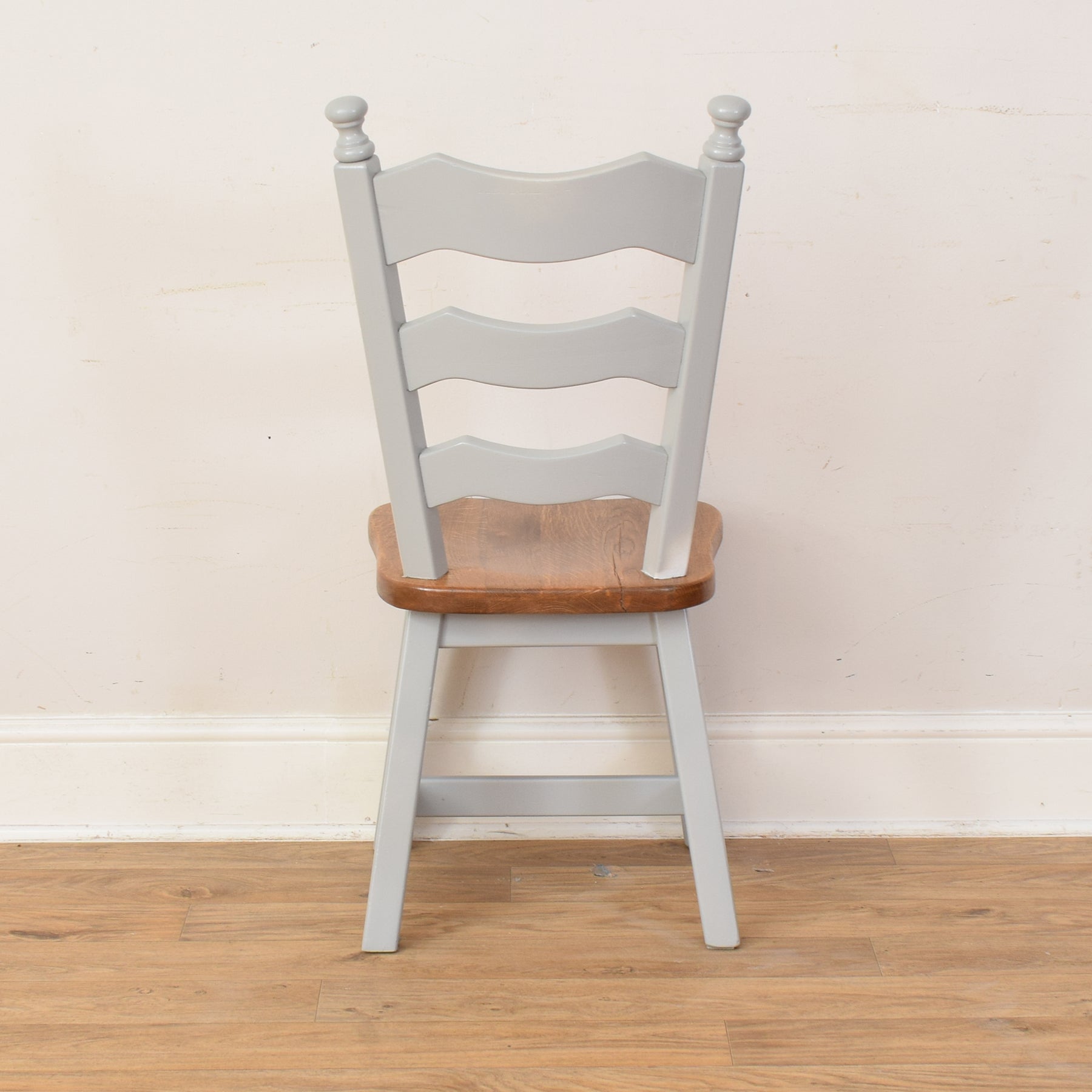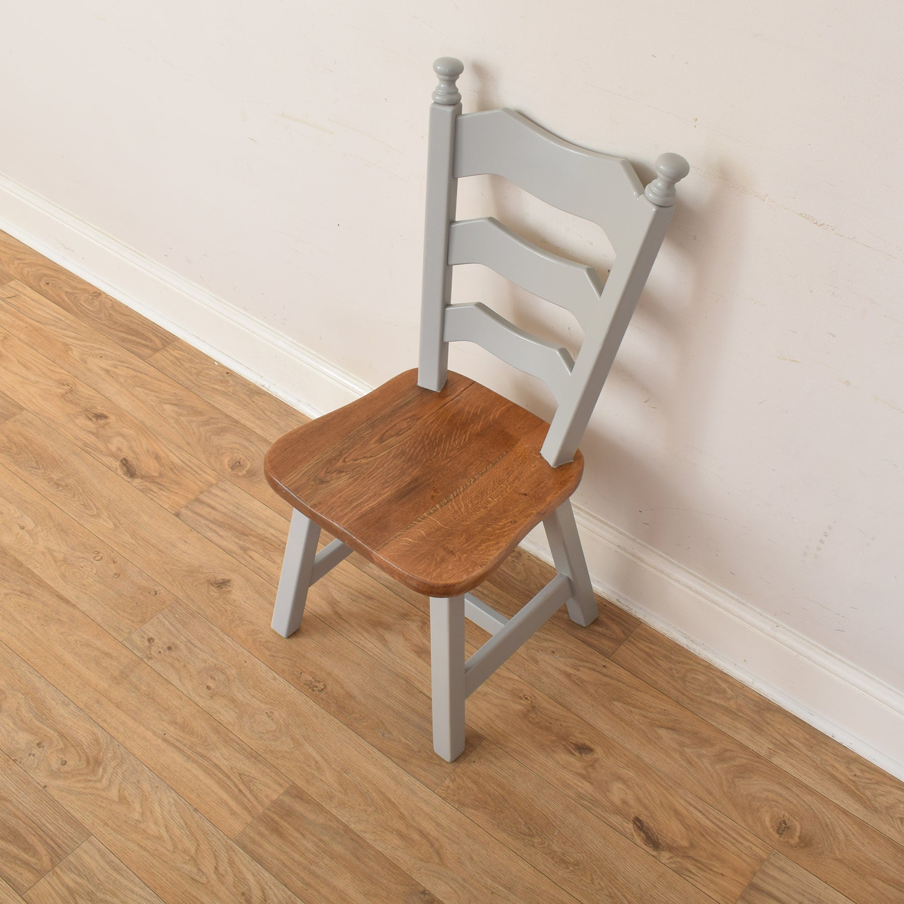 The item has been hand-sanded, cleaned, and multiple spray coats of Egyptian Grey paint have been applied, creating an appealing contrast to the natural wood tops. The wood surfaces have been treated to highlight their grain while providing a practical, long-lasting finish. This set is made from solid oak. There is a slight difference in the stretcher dimensions of one of the chairs, which is, however, minimal and does not detract from the set as a whole. This difference is visible in the photographs.
