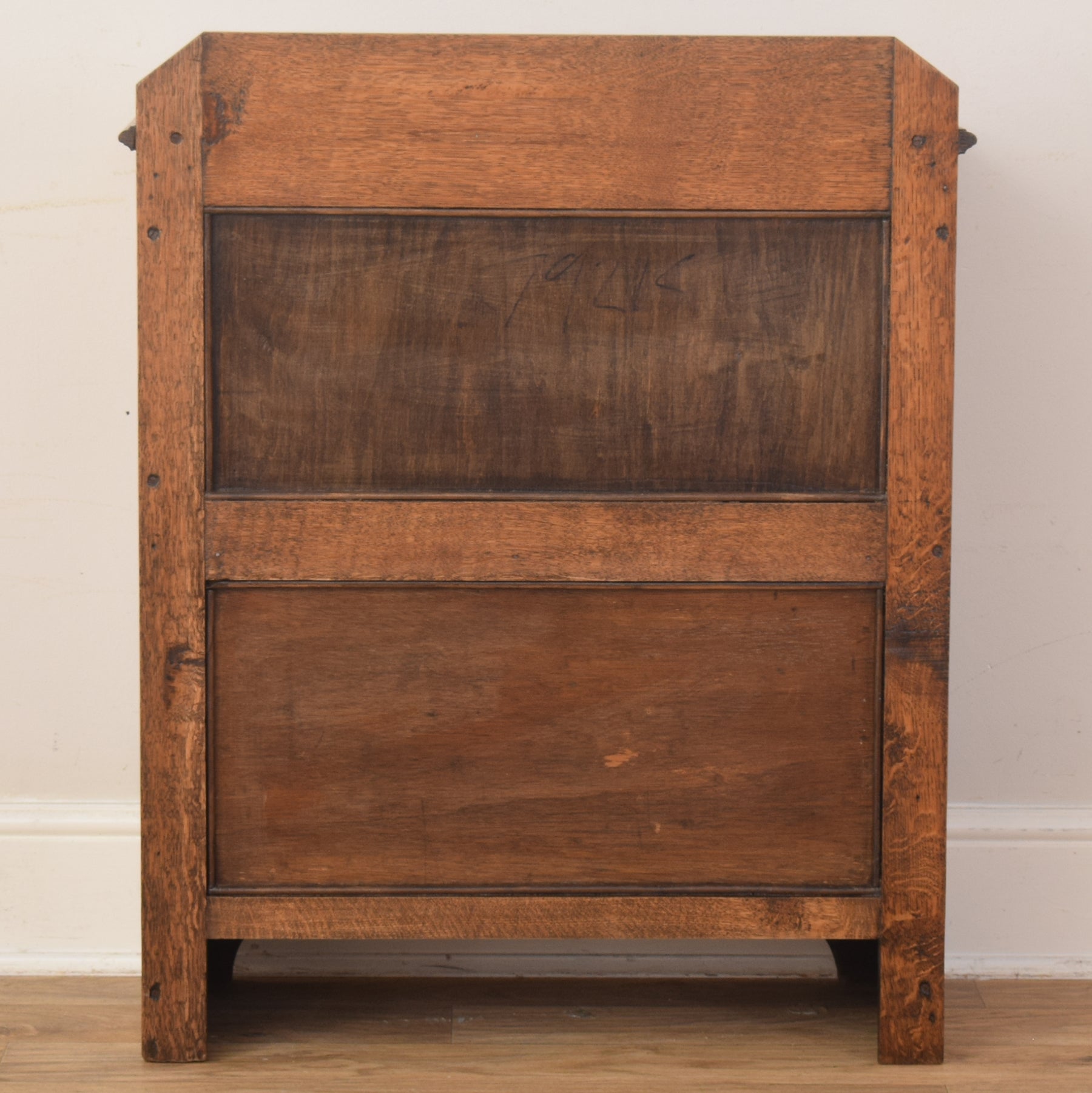 The previous darker stain has been carefully stripped away, and multiple coats of hard-wearing matte lacquer have been applied, providing a durable, long-lasting finish while highlighting the attractive oak grain. This item is constructed from a mixture of solid oak and oak veneer panels, with the rear panel made from plywood.