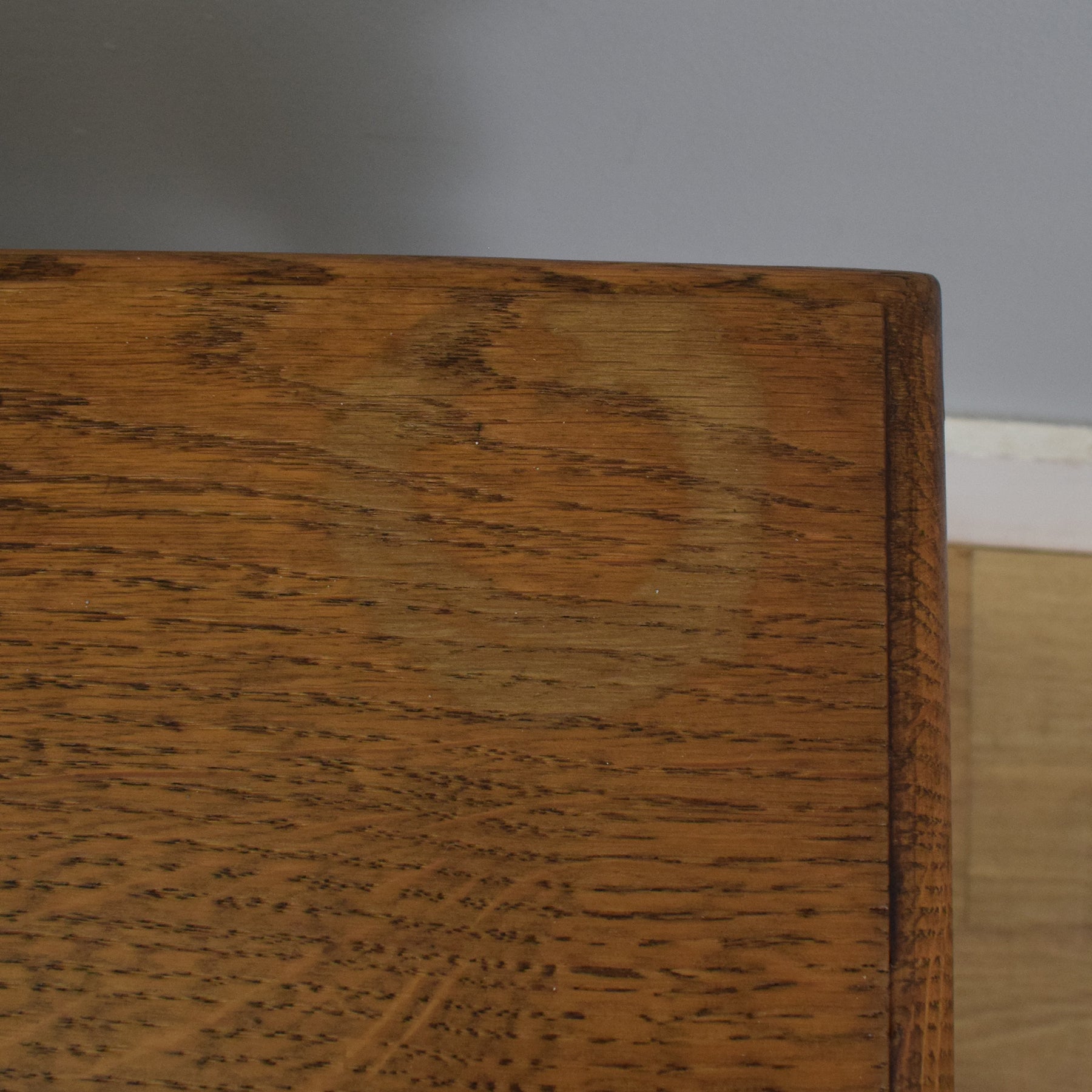 This set includes a large table with two smaller tables that slide neatly beneath it. Each piece features turned baluster legs, scalloped apron detailing, and a sturdy stretcher base. The solid oak tops display attractive natural variation in the grain, enhancing the set’s handcrafted feel. The proportions and detailing lend the tables a charming, farmhouse aesthetic while remaining highly functional.