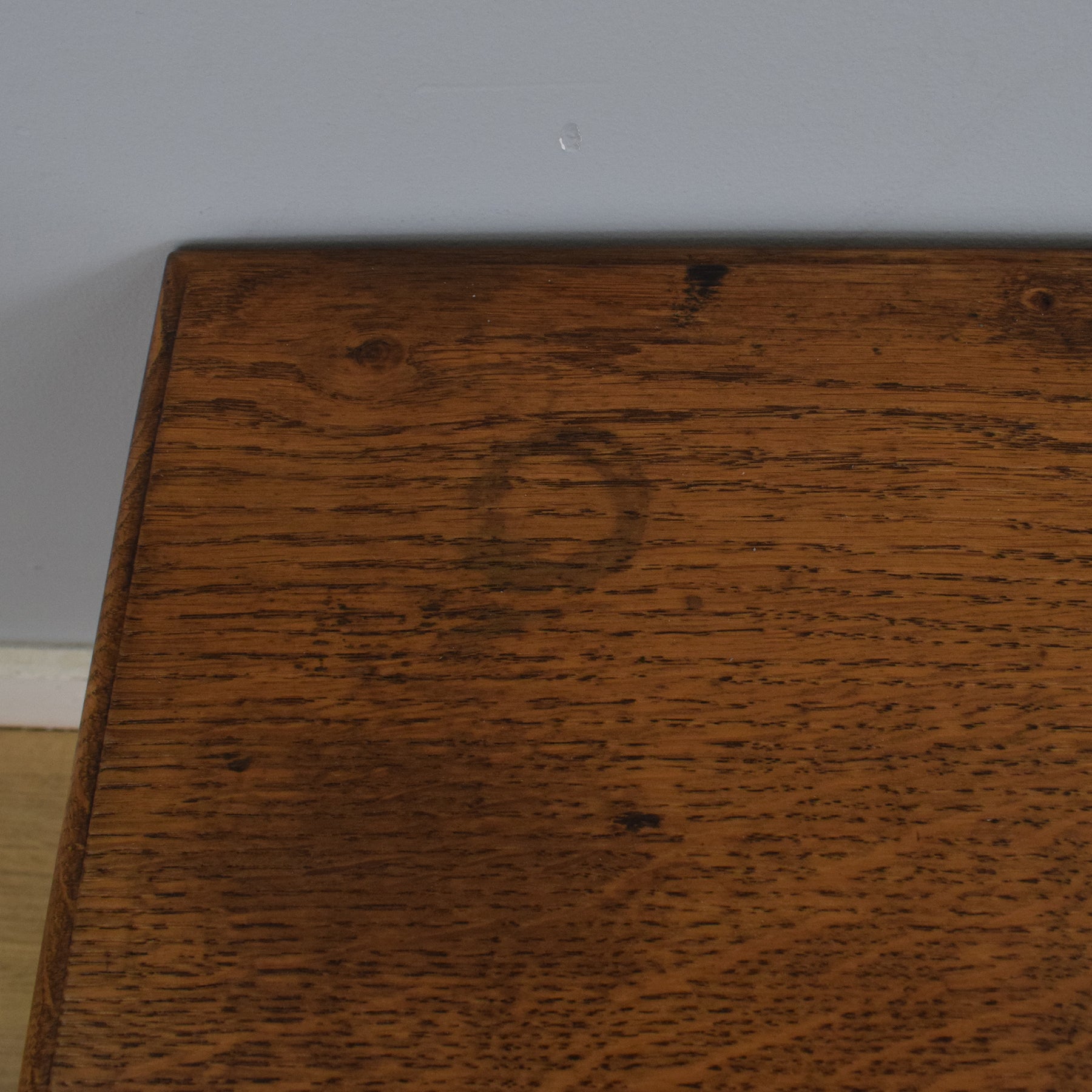 The previous darker finish has been stripped, and several coats of hard-wearing matte lacquer have been applied to provide a durable and lasting surface. This also highlights the rich tone and texture of the solid oak throughout. Some historic ring marks remain on the top surface of the main table and could not be fully removed, but they blend subtly with the natural grain and age of the piece. This item is made entirely from oak.