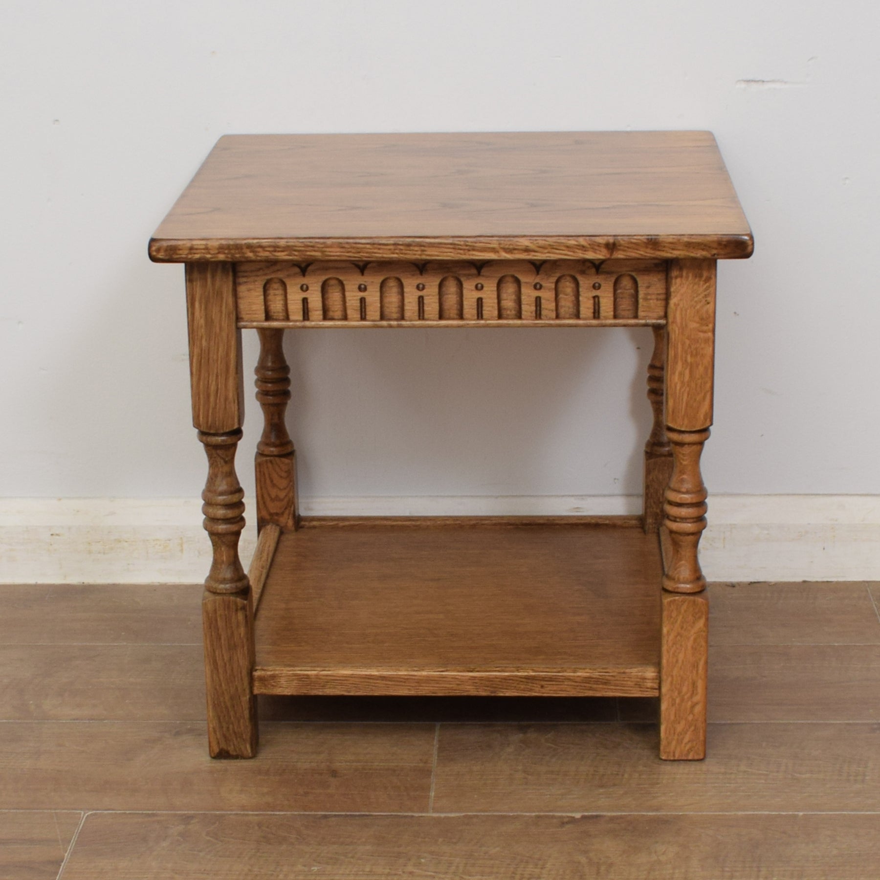 The oak top provides plenty of space for resting a cup of tea and a lamp, making it perfect for sitting next to a favourite armchair. At the bottom is a shelf which is ideal for reading material or favourite ornaments. The carvings around the top of this table are particularly attractive and provide a unique character to this piece.