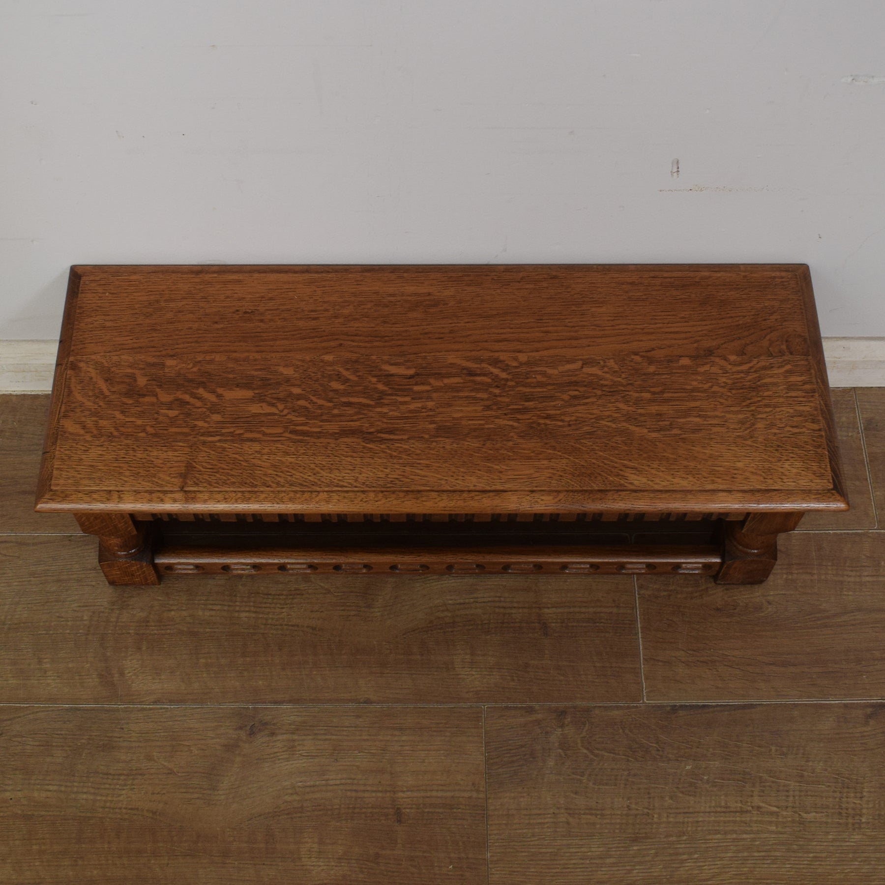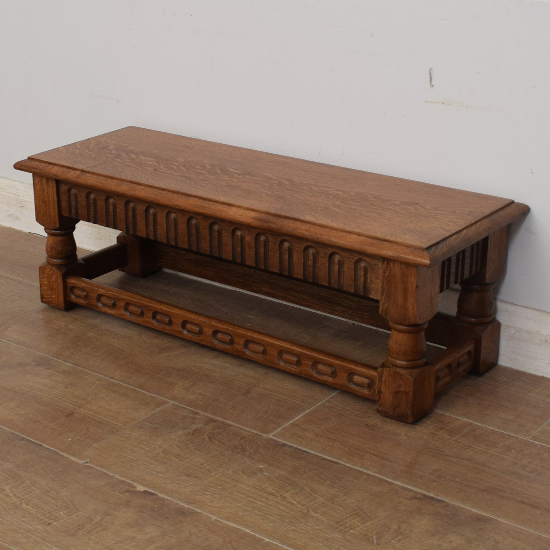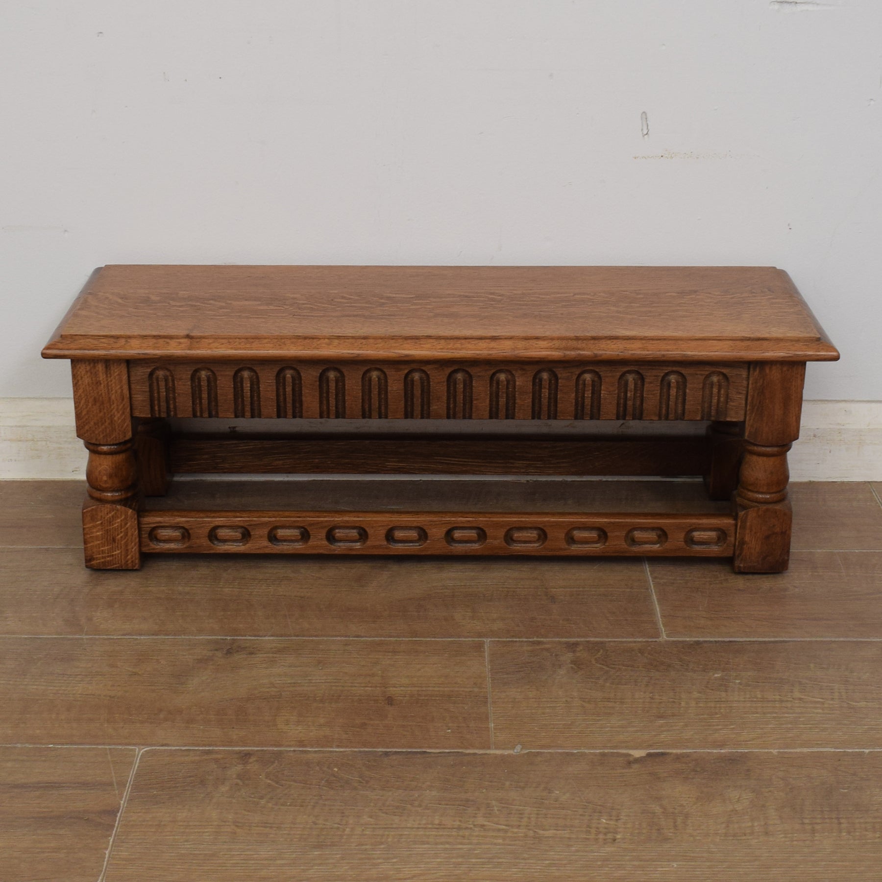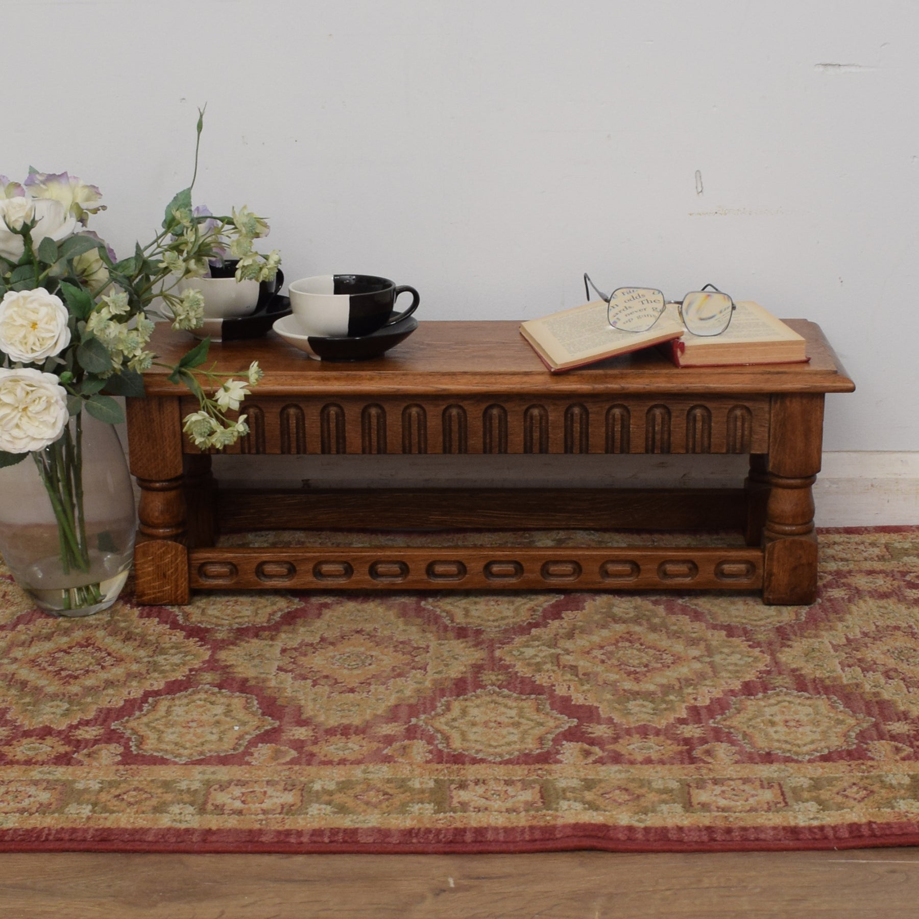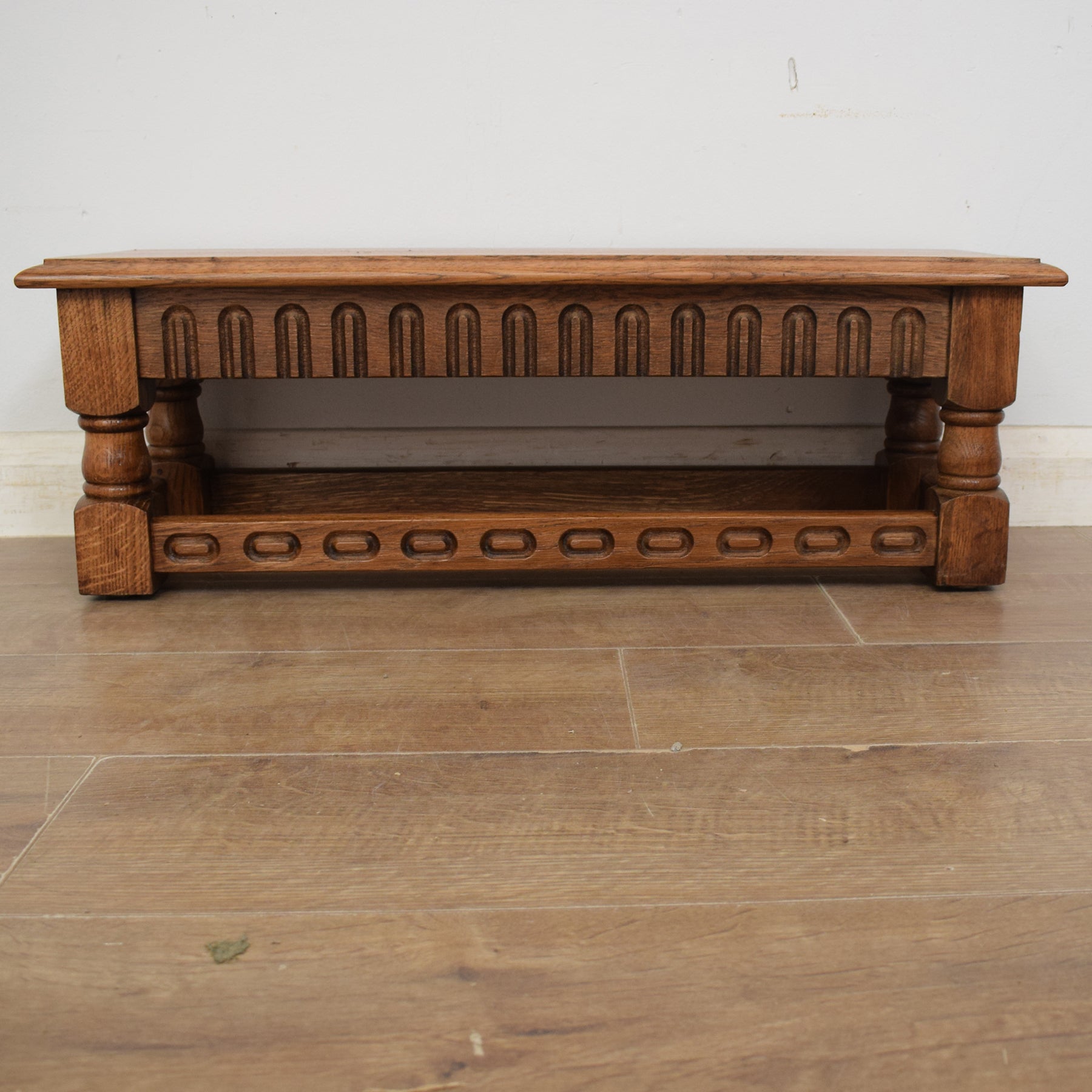 This solid oak table features a rectangular top, supported by turned legs and a lower stretcher for added stability. The standout detail is the carved apron just beneath the tabletop, and the detail along the stretcher base, adding a touch of vintage character. Its understated proportions make it easy to place in smaller spaces, while still offering a pleasing visual presence.