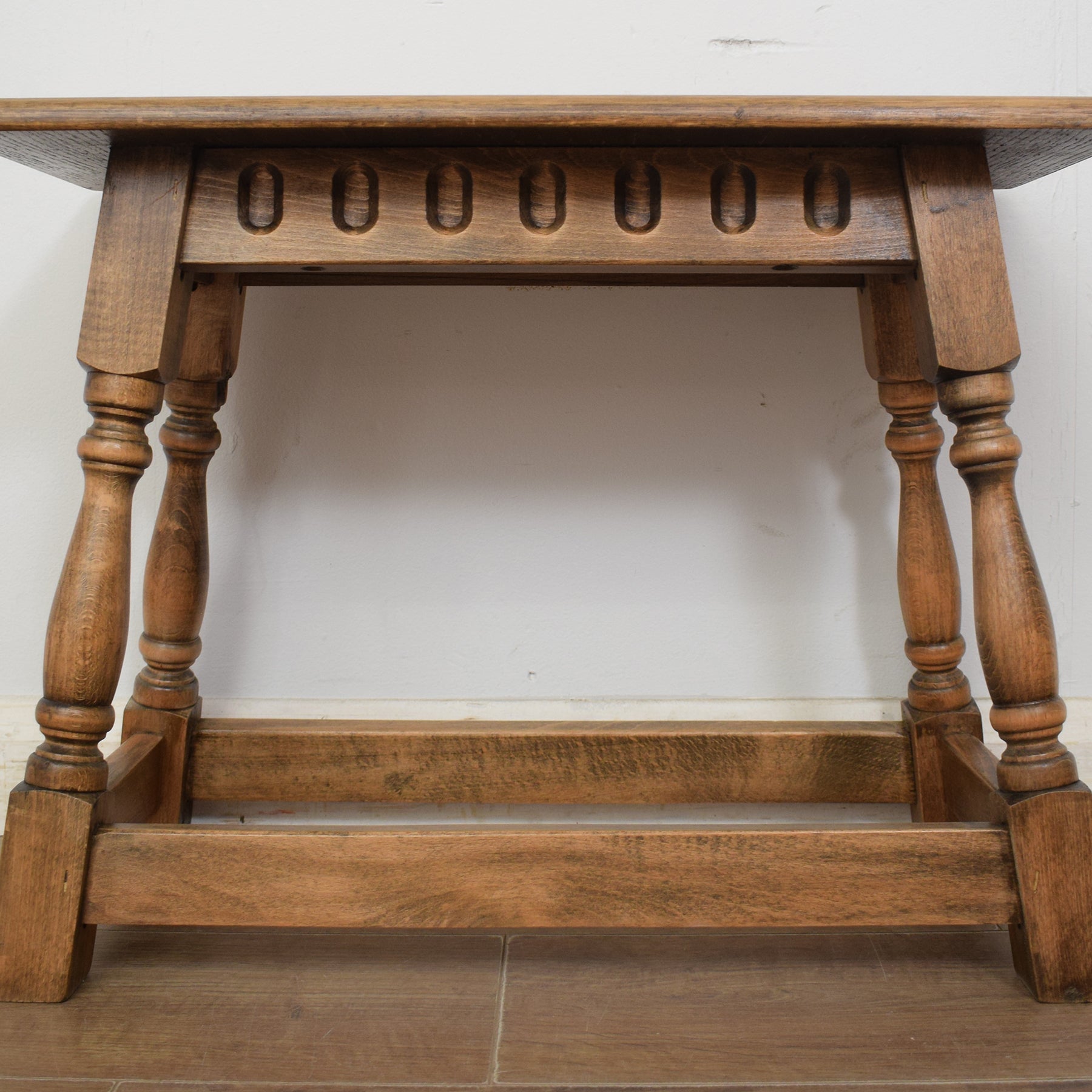 We have restored this lovely piece by carefully hand-stripping the original stain before relacquering it to accentuate and preserve the rich oak grain for many years to come. This barley twist side table is made from oak.