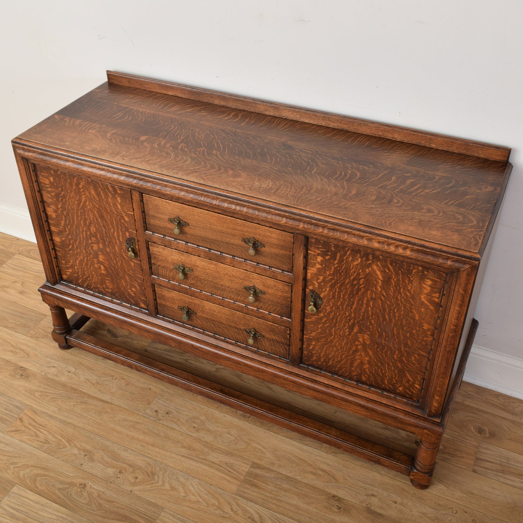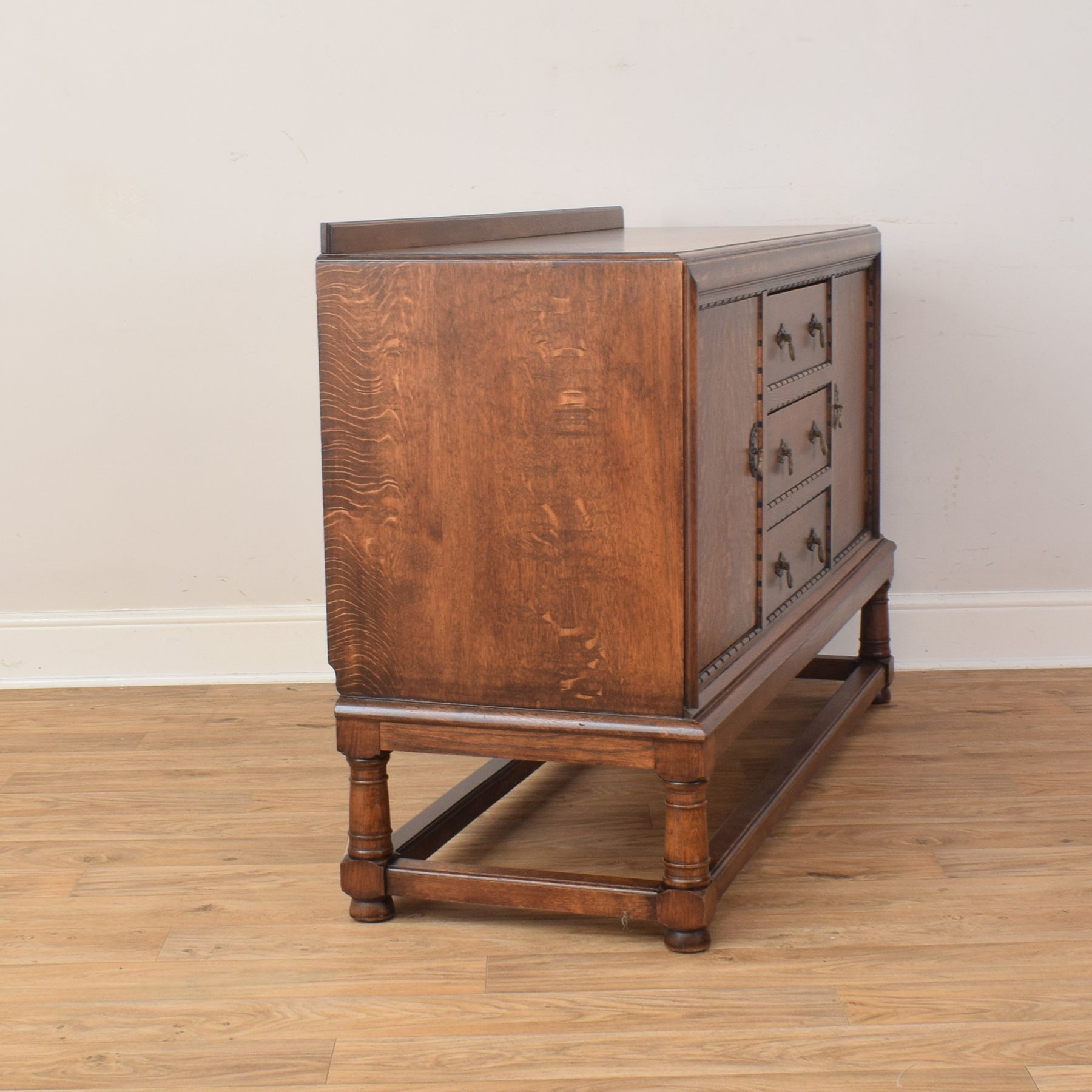 The sideboard features a classic layout with a pair of cupboards flanking three central drawers, each fitted with traditional brass handles and escutcheons. The boldly figured oak grain across the cupboard doors adds depth and visual appeal, while the raised gallery back and lower stretcher shelf provide both balance and structure to the design. Its solid construction ensures strength and durability, while the open base helps keep the piece light in appearance.