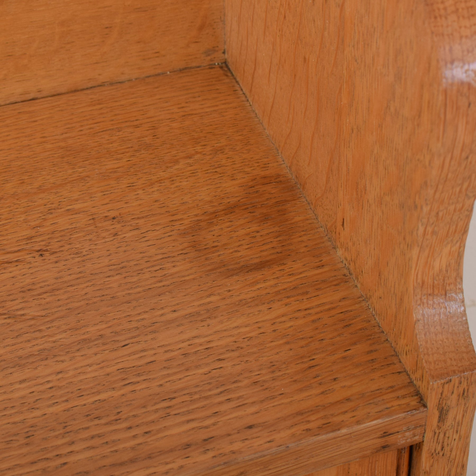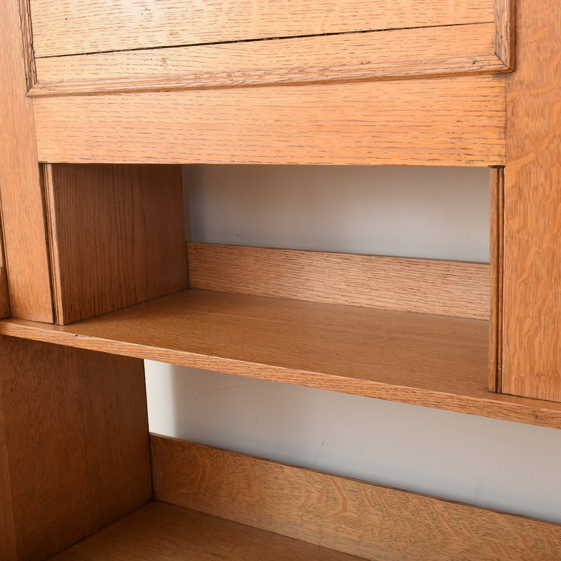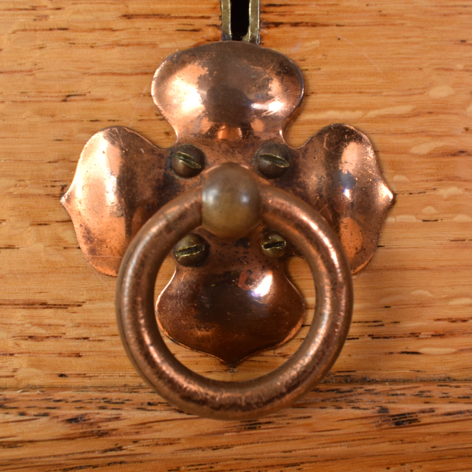 The previous darker stain has been carefully stripped away, and multiple coats of hard-wearing matte lacquer have been applied. This not only highlights the natural beauty of the oak grain but also provides a durable, long-lasting finish. There are, however, some visible darker marks and a ring mark that could not be fully removed during restoration, and a hairline split across the drop down lid. These however don’t detract from the look of the piece or affect it structurally. This item is made entirely from solid oak.