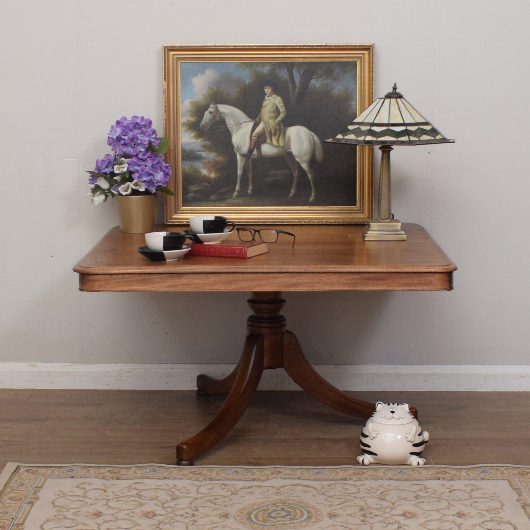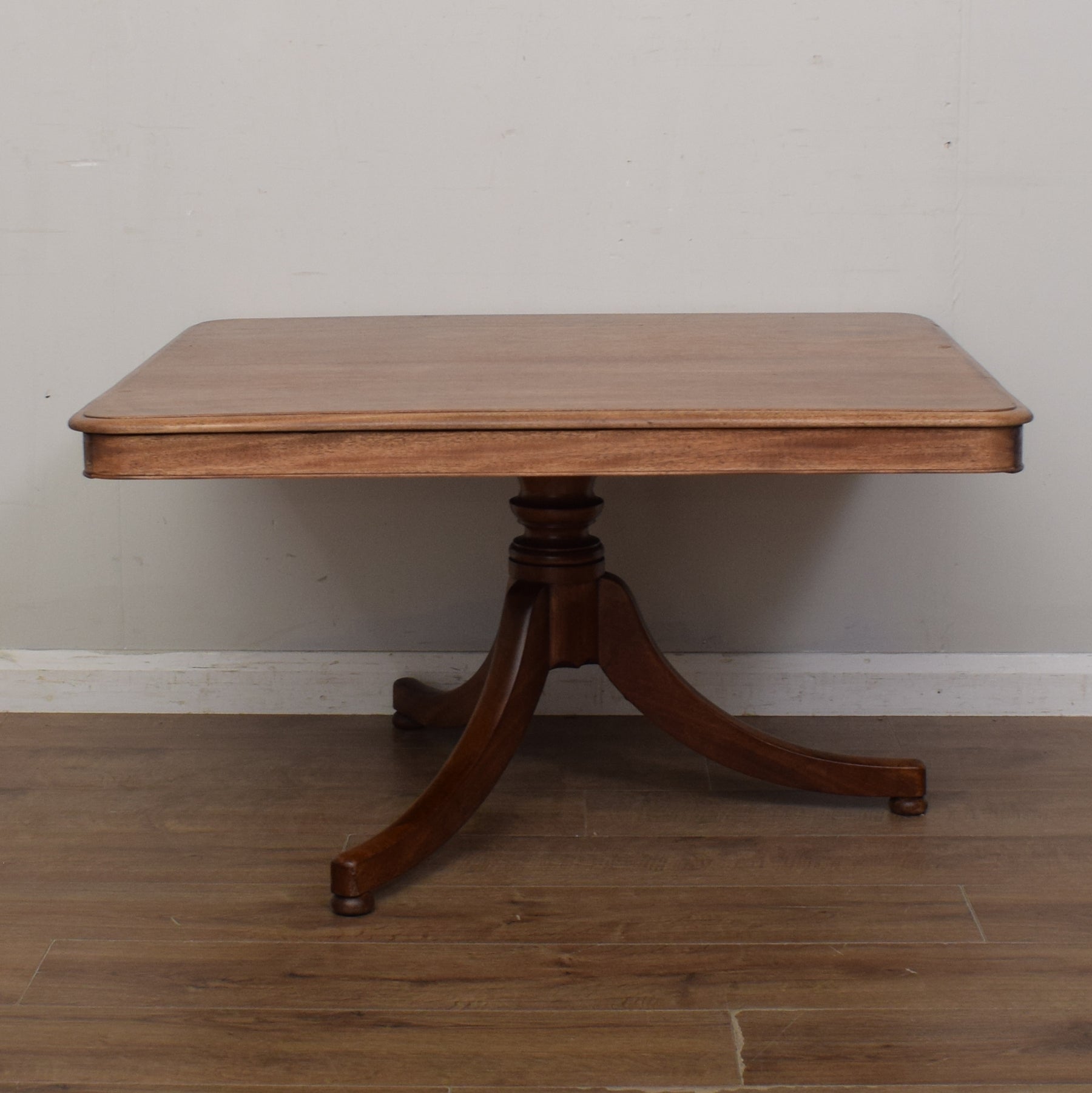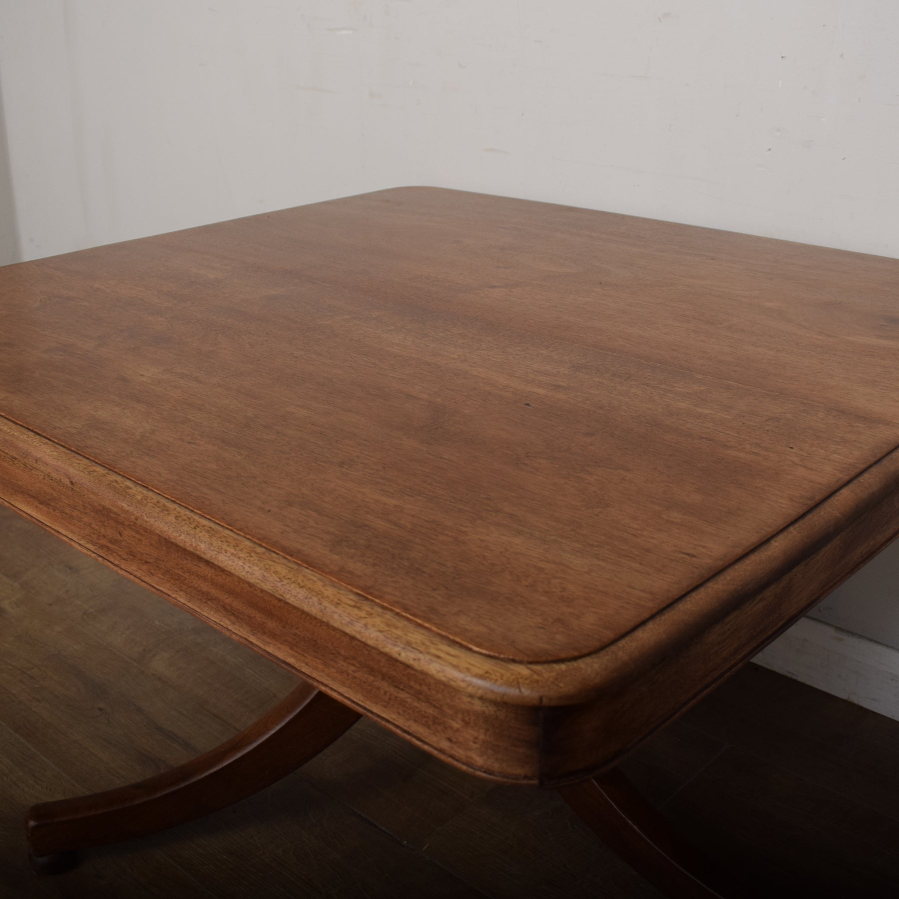 We have given this table a new lease of life by removing the previous finish to reveal the natural wood underneath. A clear matt lacquer has then been applied to accentuate the beauty of the wood grain and provide protection and durability. This table is made from solid mahogany.