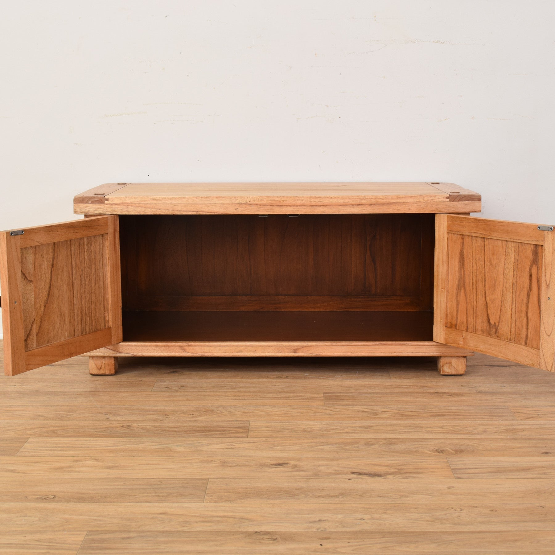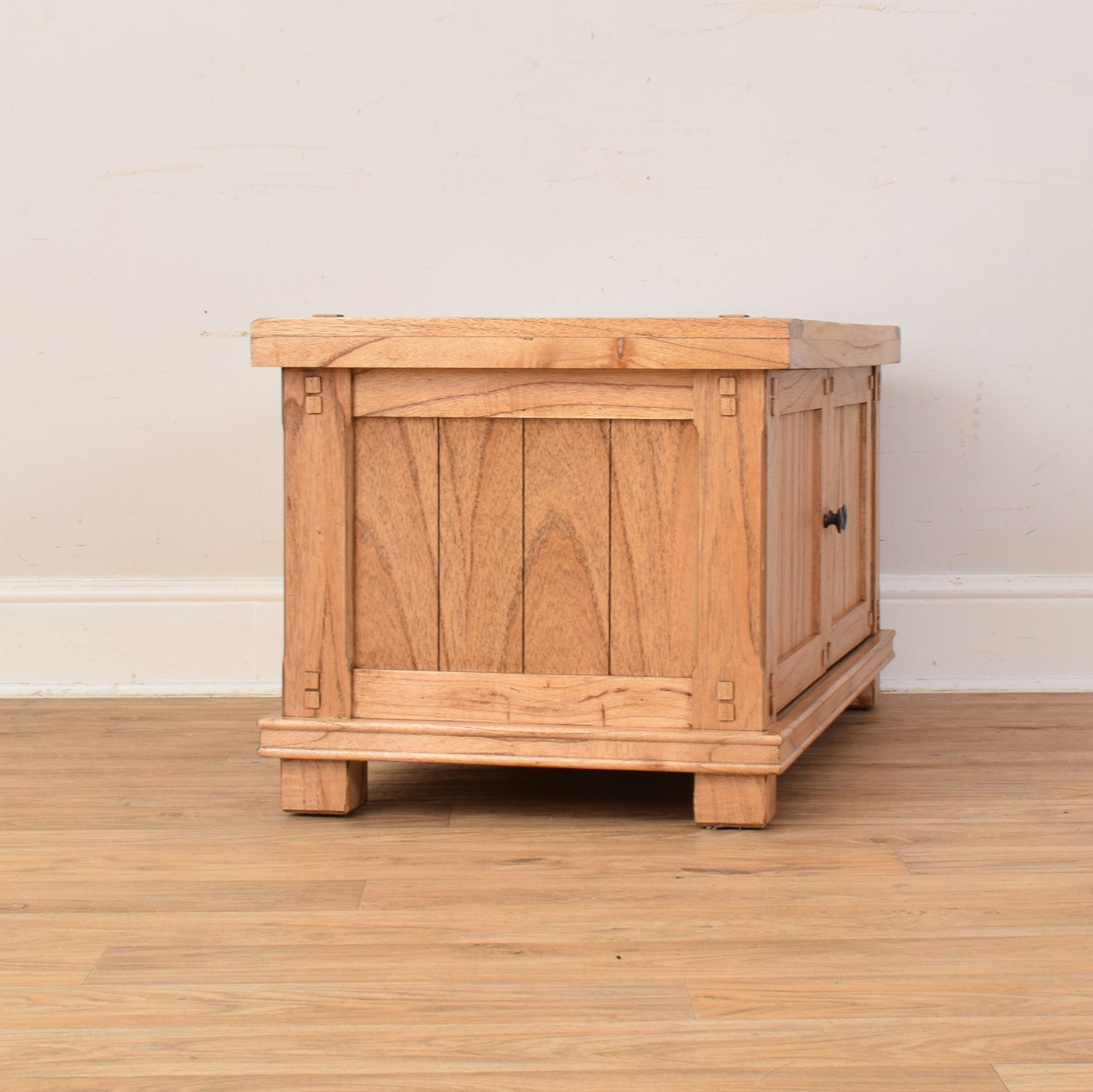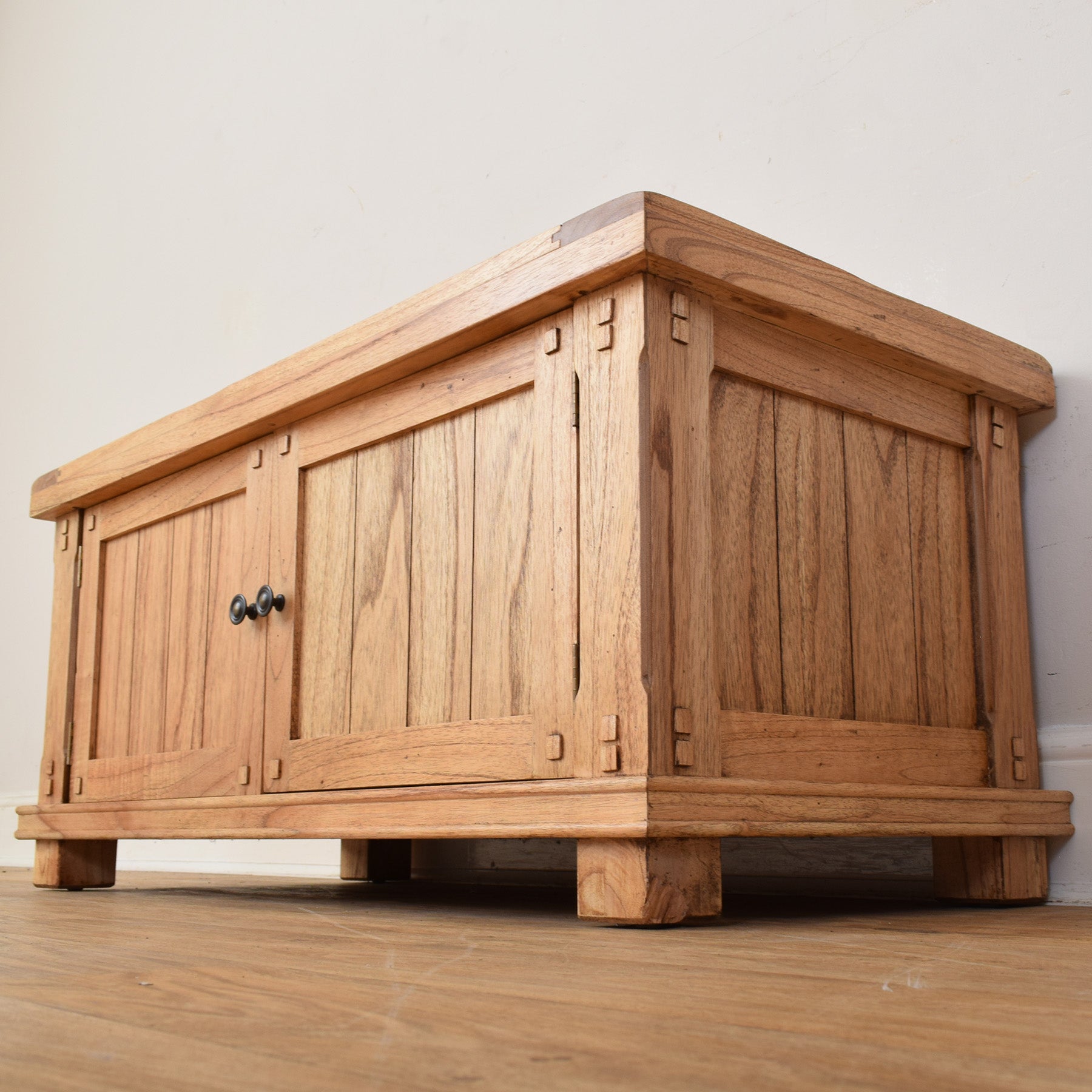 This modern oak TV cabinet features a clean, rectangular form with a gently overhanging top and a sturdy plinth base. The two front-panelled doors are framed with subtle joinery details and finished with simple round knobs, giving the piece a refined yet understated look. The warm tone of the oak grain runs beautifully across the top and door fronts, adding natural character and texture. Inside, the cabinet provides generous storage for media equipment, consoles, or everyday living room essentials, keeping cables and clutter neatly out of sight.