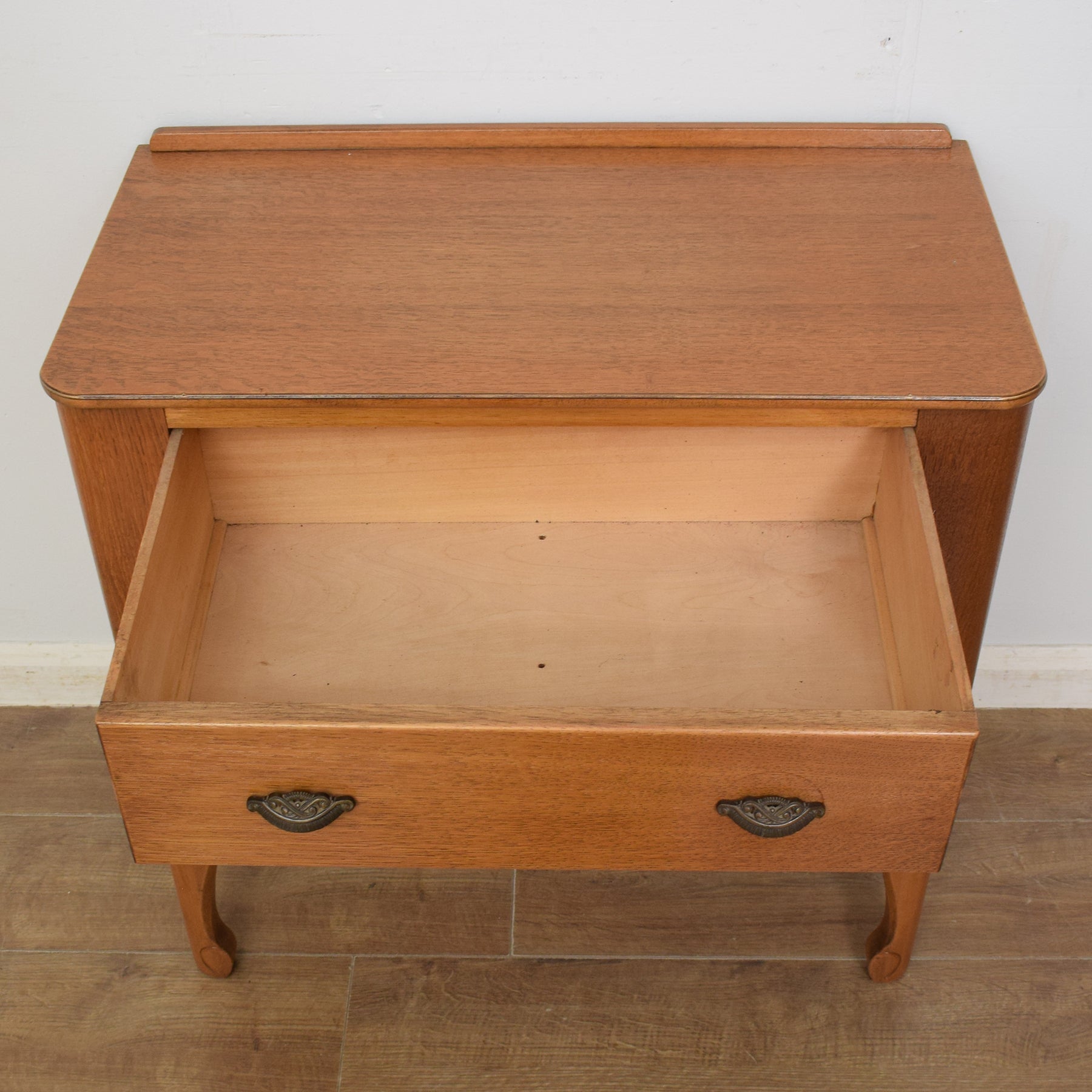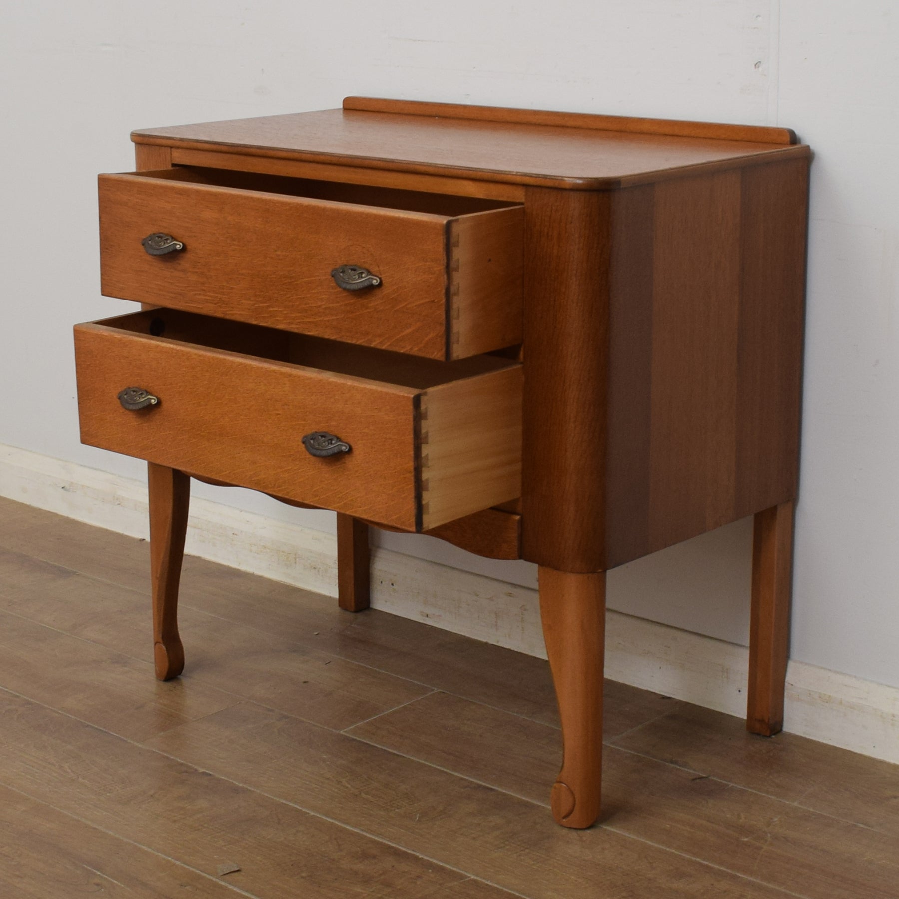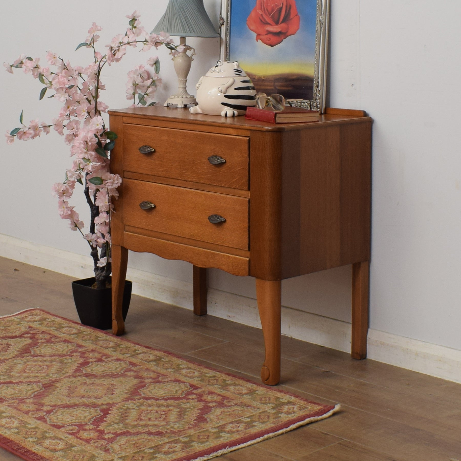 This charming two-drawer chest with original handles is sure to make an attractive and practical addition to the bedroom. In a previous life, this piece had a mirror attached and was used as a dressing table.