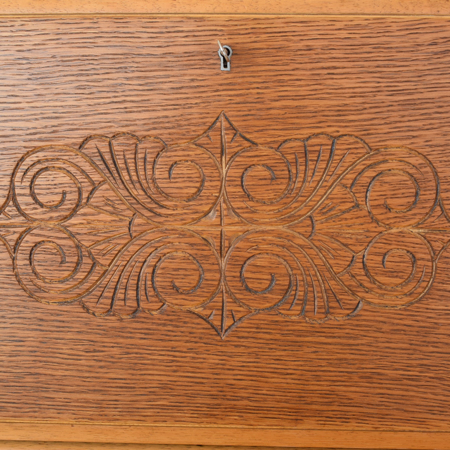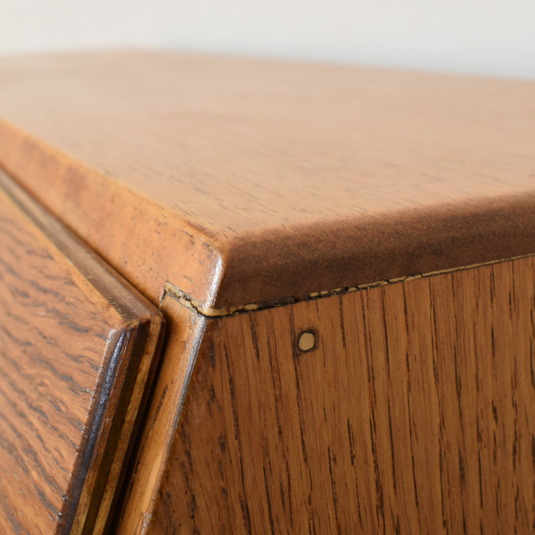 The previous finish has been stripped back, and the bureau has been carefully prepared before multiple coats of hard-wearing matte lacquer were applied. This provides a durable, long-lasting finish while highlighting the natural oak grain. There is some missing veneer and a filled area along the bottom edges, both visible in the photographs and reflected in the overall condition of the piece. This item is made using an oak veneer, with a plywood rear panel and drawer base.