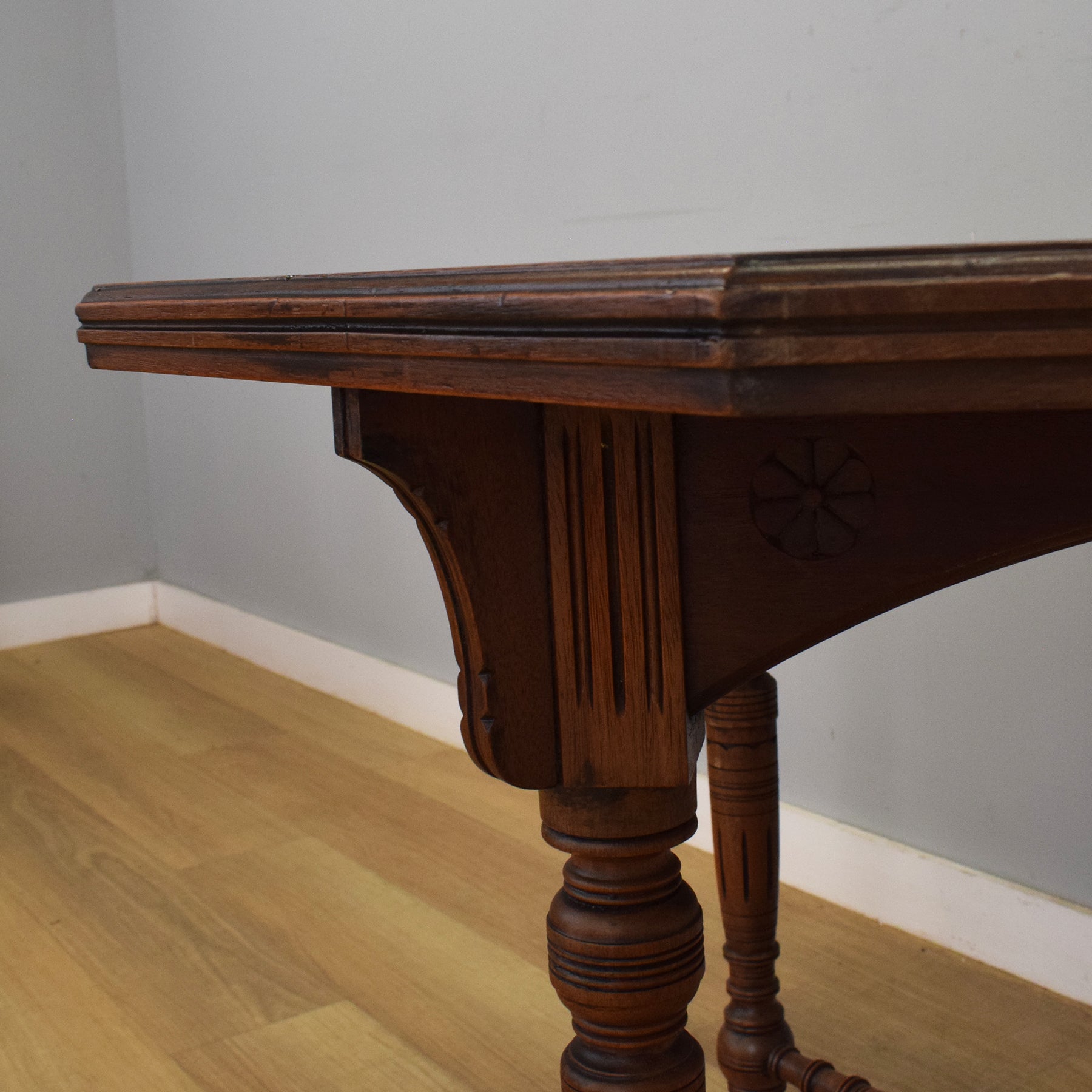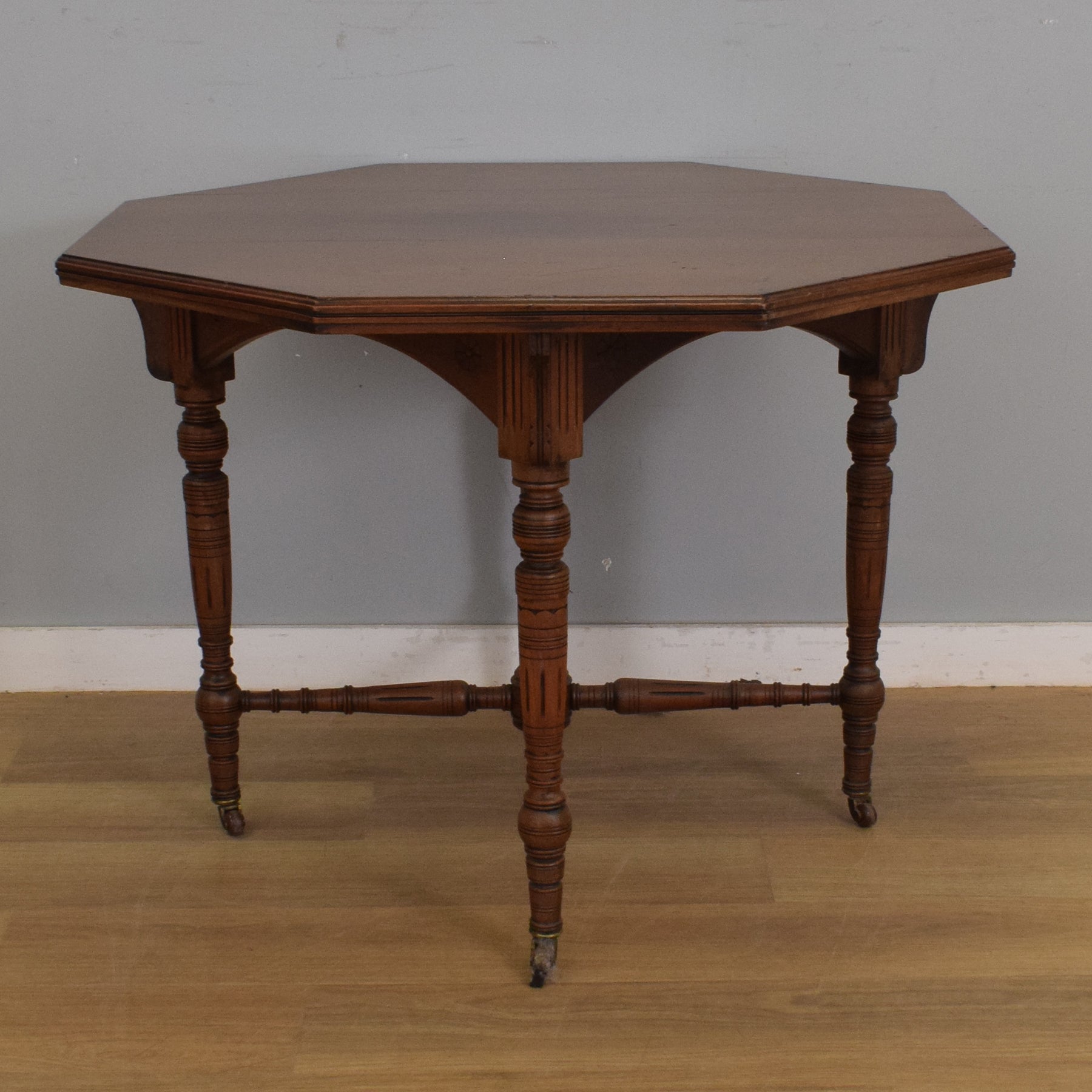The octagonal top gives it a distinctive look and makes it a versatile piece for a variety of settings—ideal as a lamp table, occasional table, or a neat centre table in a smaller space. The shaped apron adds a subtle touch of traditional elegance, and the castors make it easy to move as needed.