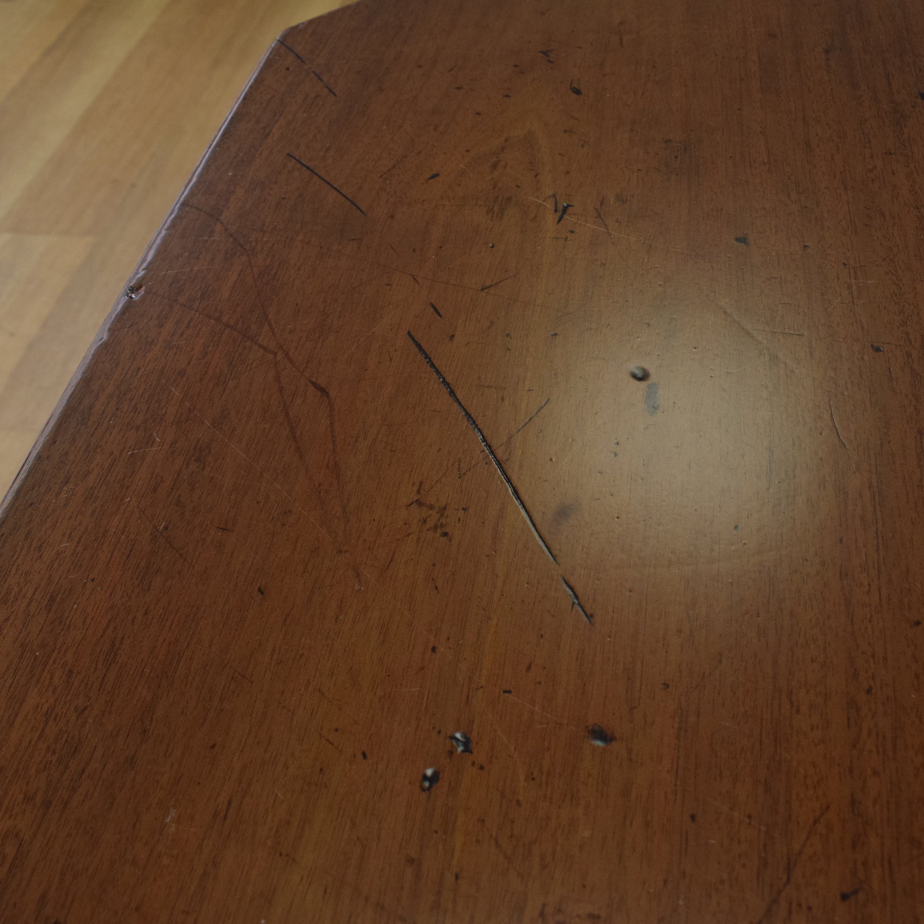 As shown in the photos, there are various marks and scratches to the top, consistent with age and use, along with other minor surface wear throughout. These imperfections are part of the table’s history and do not detract from its overall charm or usability.