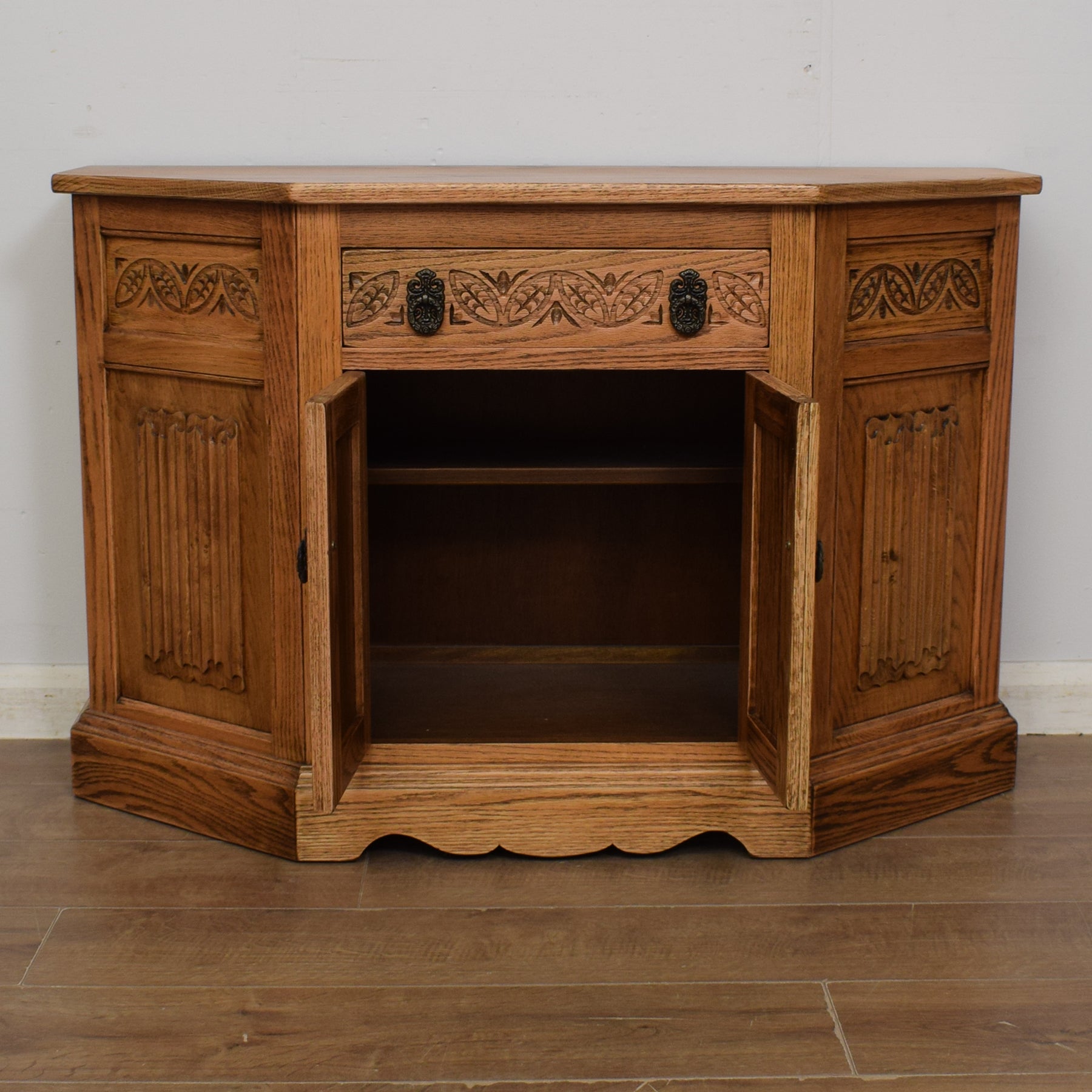 Right across this cabinet is a beautiful oak grain along with attractive carved details and elegant hinges and ring handles, providing plenty of visual appeal.